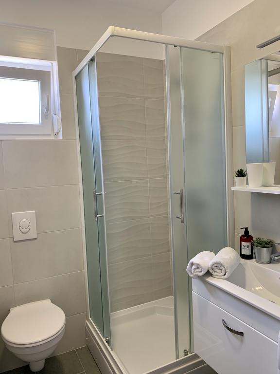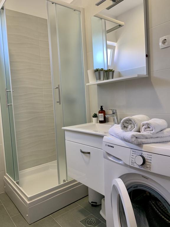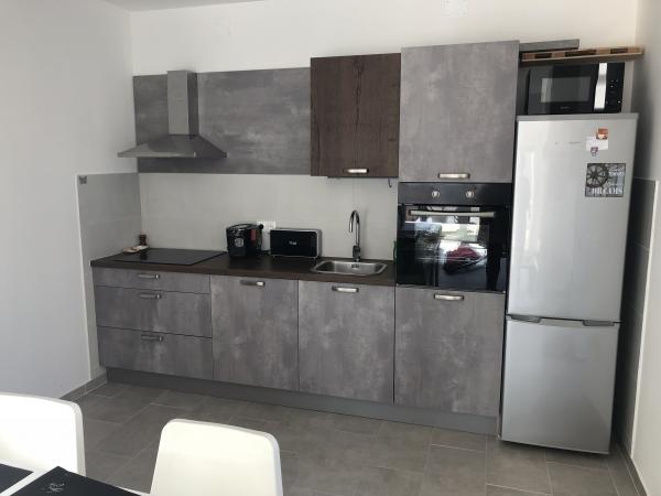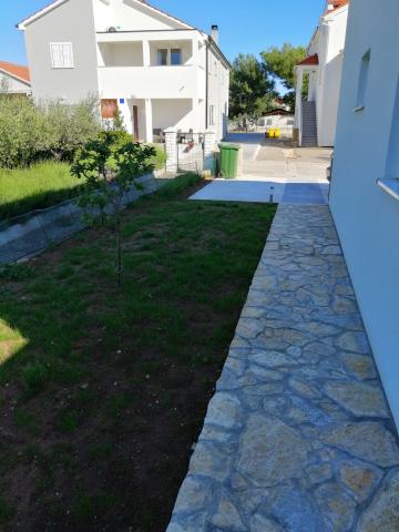 Brand new apartments, modernly decorated. Each apartment has 2 bedrooms, a complete bathroom (washing machine) and an additional toilet. Fully equipped kitchen (oven, microwave, dishwasher, coffee maker, toaster), beautiful wooden terrace. Both apartments are on the ground floor. 80 m from the sea and pebble beach, along the beach promenade, children's playground, beach volleyball and other facilities. Secured parking.