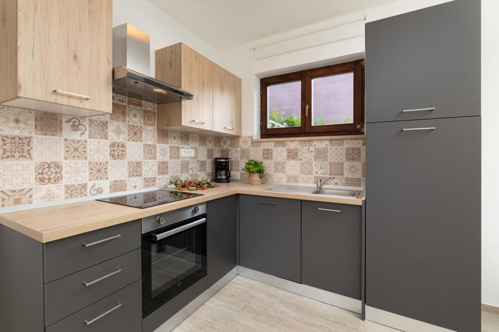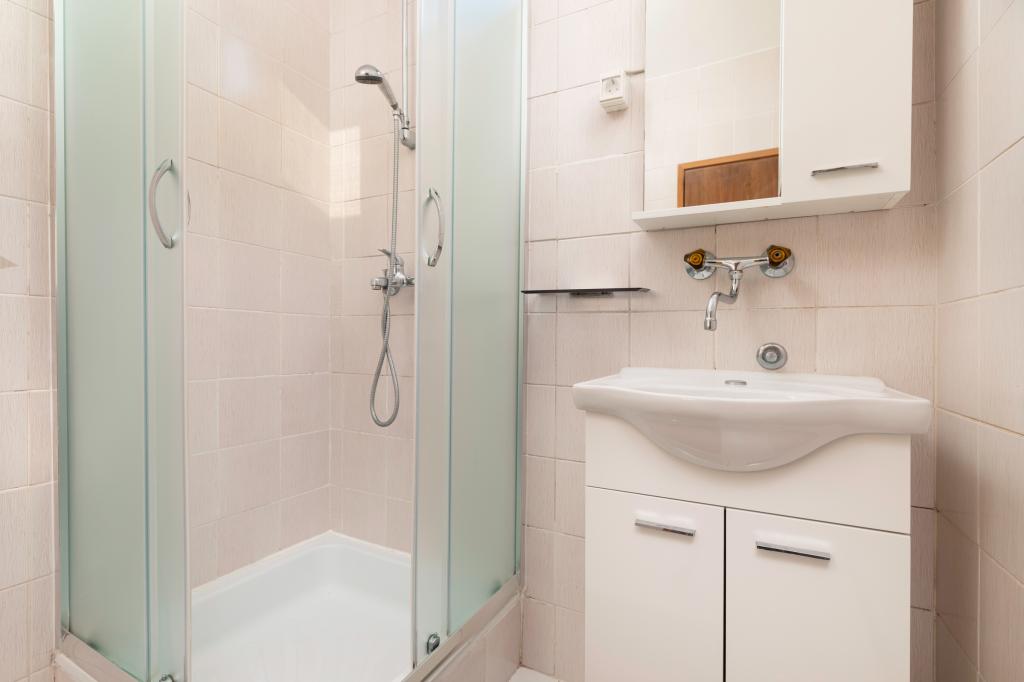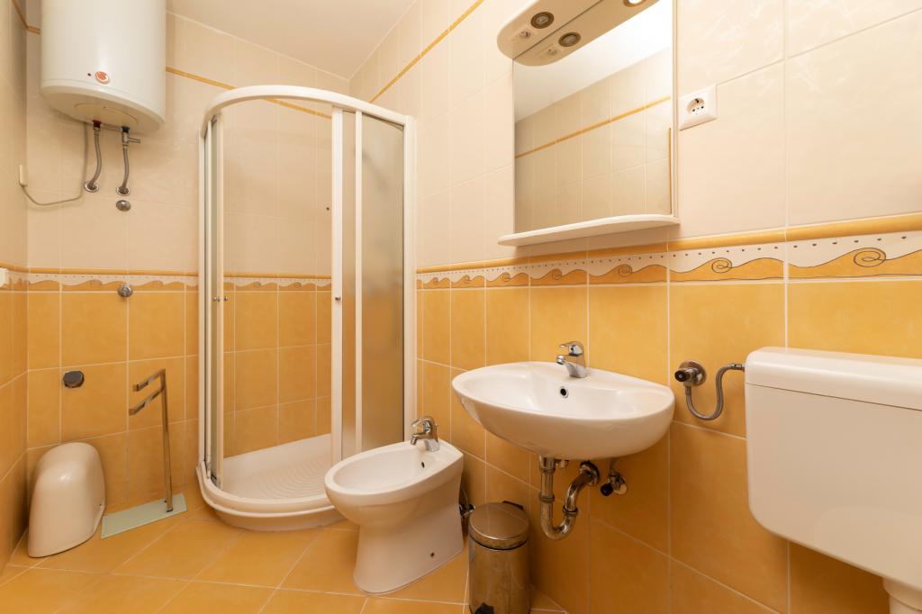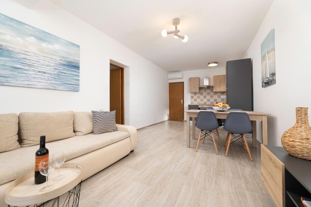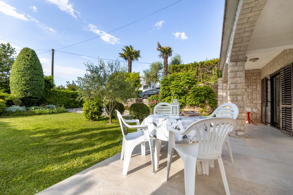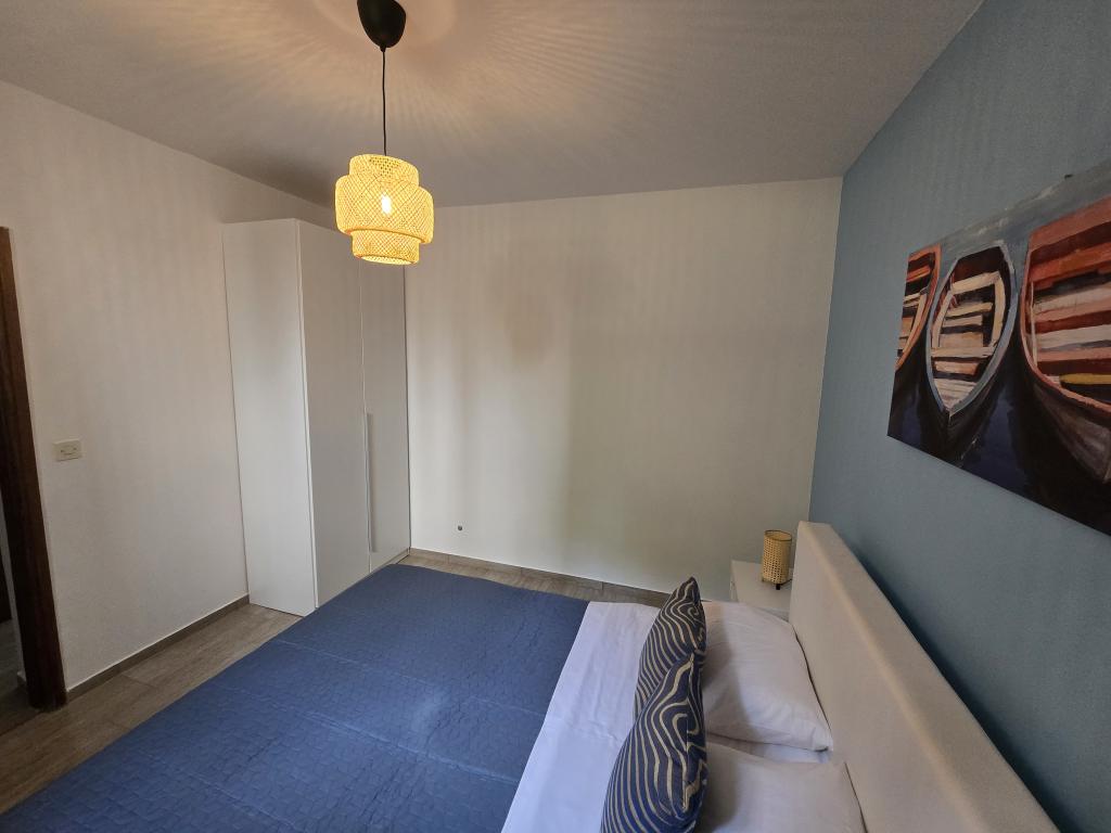 The apartment is located 200m from the sea. In 2025, it was completely renovated and equipped with new furniture. The apartment has two private entrances, two bedrooms, two bathrooms, a living room with kitchen and dining room, a covered and uncovered terrace. Extra bed for children up to 18 years. The total area is 64m2. Parking for three cars is located inside the building and is free of charge. Pets are allowed with prior arrangement and constant supervision of the owner. Additional costs may apply.
