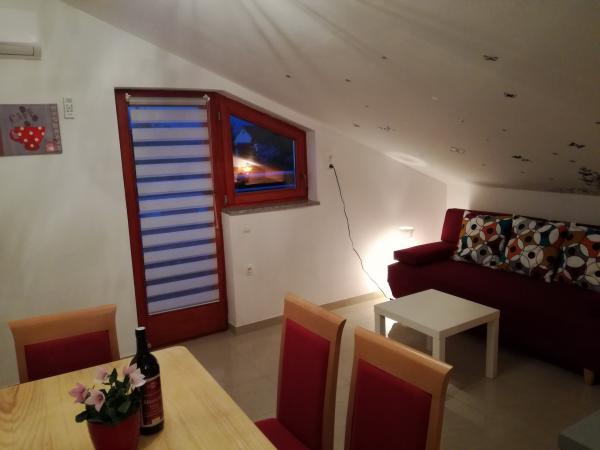 Apartments modernly equipped, functional with terraces with a fantastic view of the sea. The owner replies quickly and very specifically to the news. On site the owner very hospitable and nice. Parking spaces for each apartment are numbered. To the beach not far from the steep climb, but the views compensate. Stony beach, on a very long stretch everyone can find a place for themselves. To the city about 1km a beautiful path by the sea - there are many attractions, cafes, a beautiful port lined with white stone, in the season concerts and other cultural events are organized there. In the area many interesting places to visit - Krk, Vrbnik, Baska, Punat, Malinska.