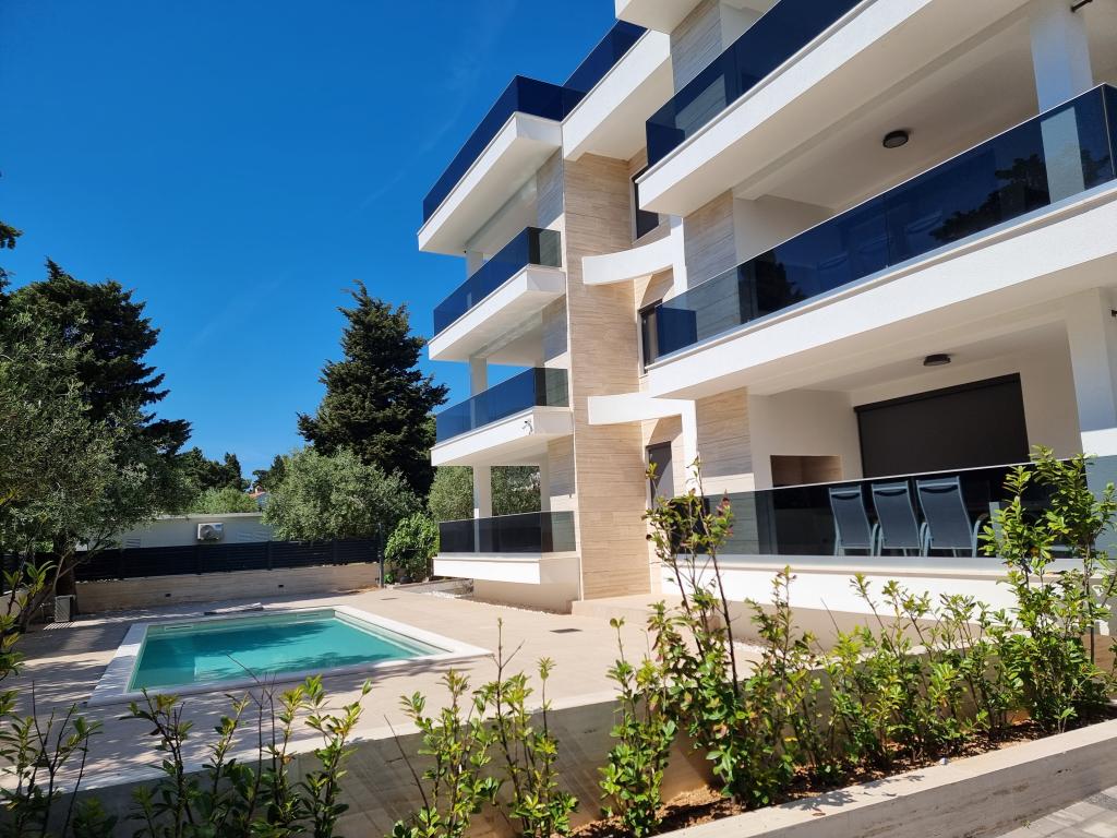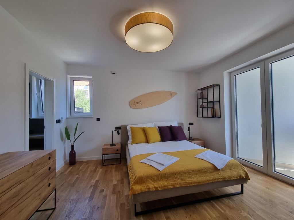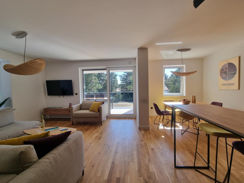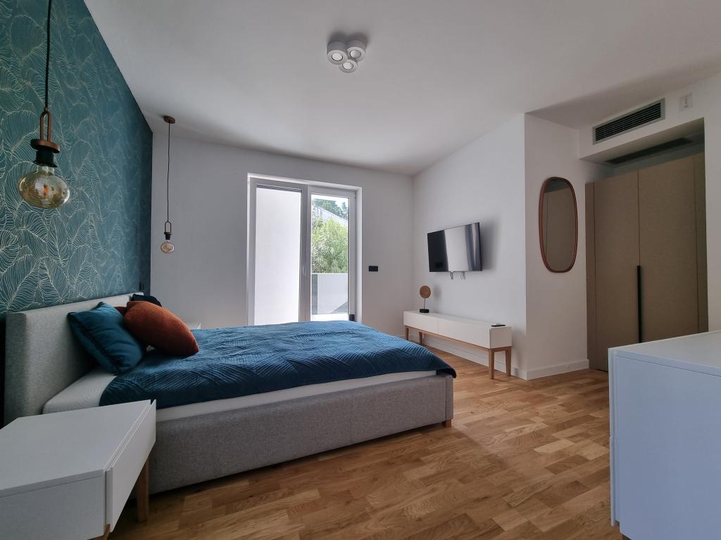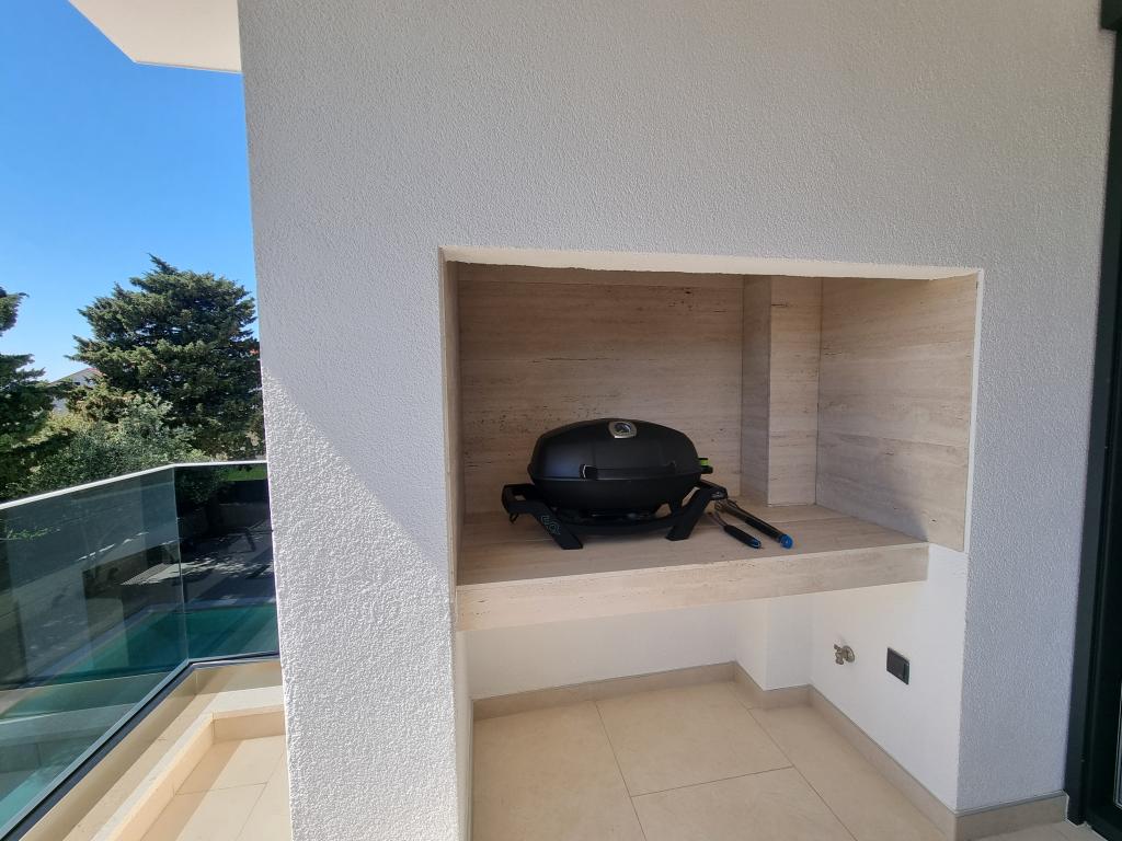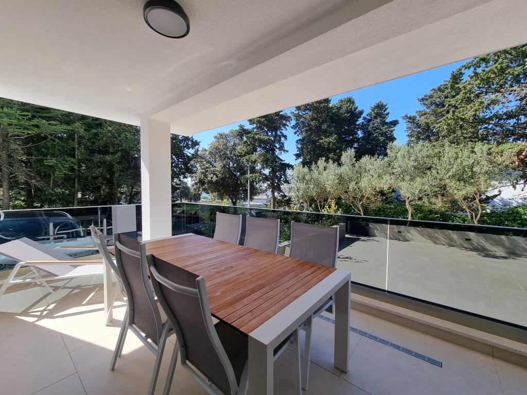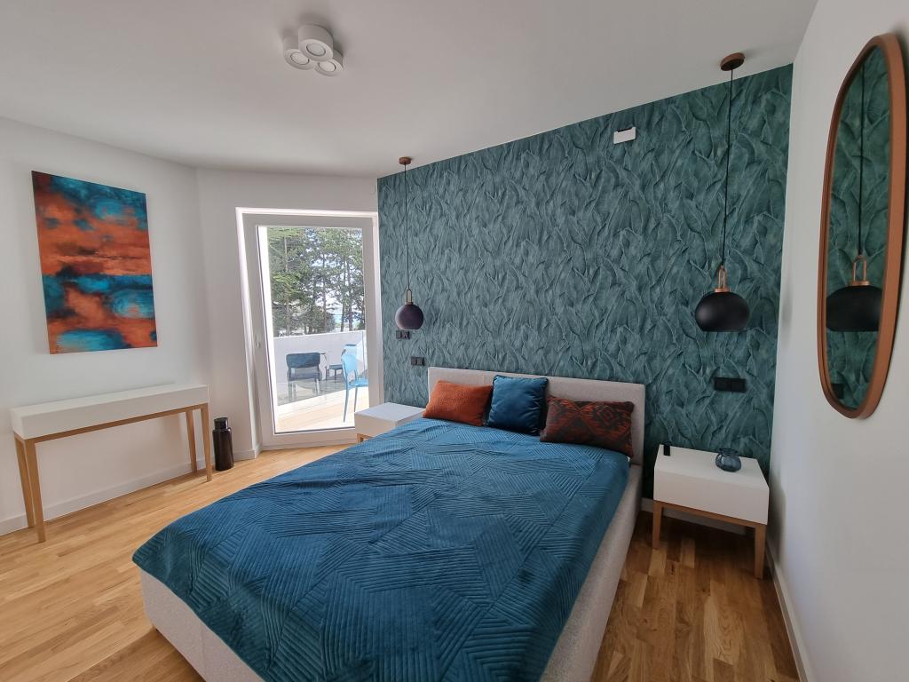 2 luxury apartments of 100 m2 each are located on the ground and first floor of a modern building and have 2 bedrooms with balconies, a large living room with a sofa bed and with a fully equipped kitchen ( the kitchens have coffee maker, microwave, dishwasher, hob and refrigerator ), 3 bathrooms in each apartment and a large terrace with table and barbecue.They are also equipped with a washing machine and iron with ironing board. There is a communal swimming pool with a small garden and parking available by the building.They are located in a quiet part of Novalja, but only a 2-minute walk from the beach and promenade. It is a 20-minute walk to the center of the town, and 10 minutes to the nearest store and restaurant. The apartments are designed for demanding guests - they are beautiful and comfortable, premium type, equipped with modern appliances and high quality furniture, and the decorative elements are handmade.