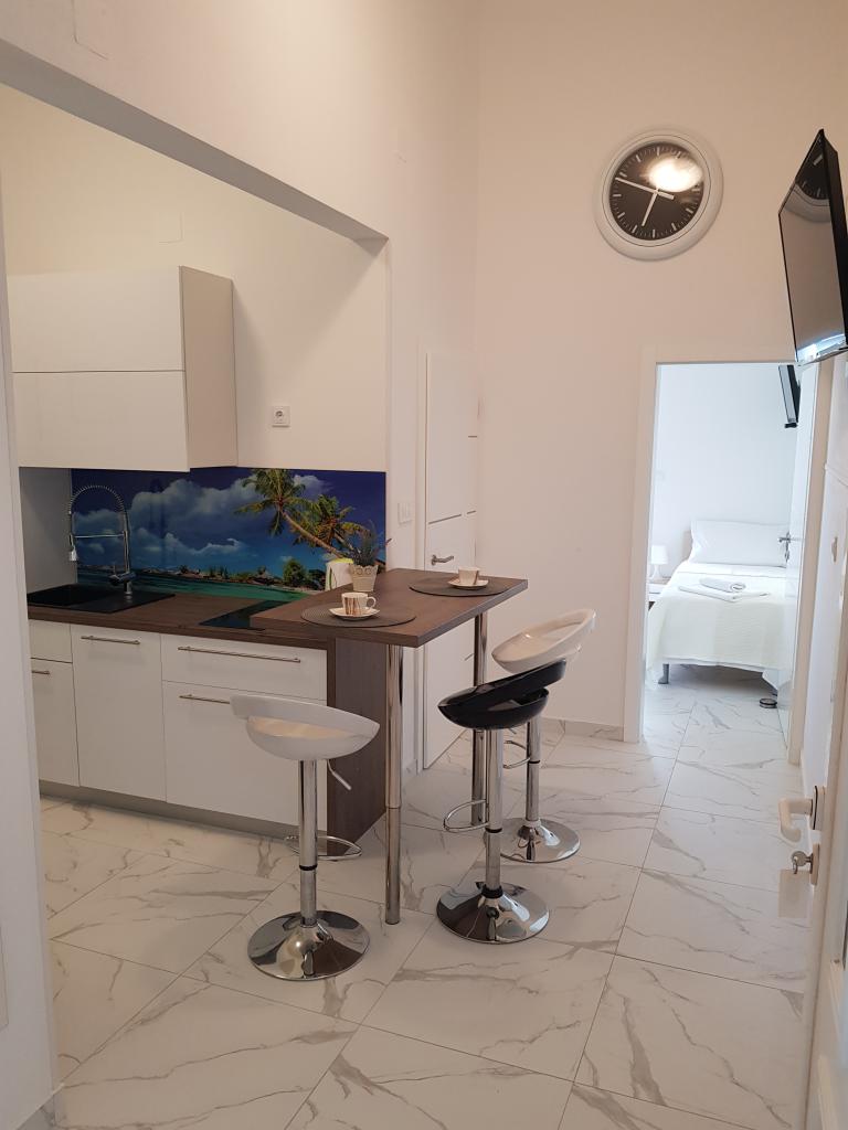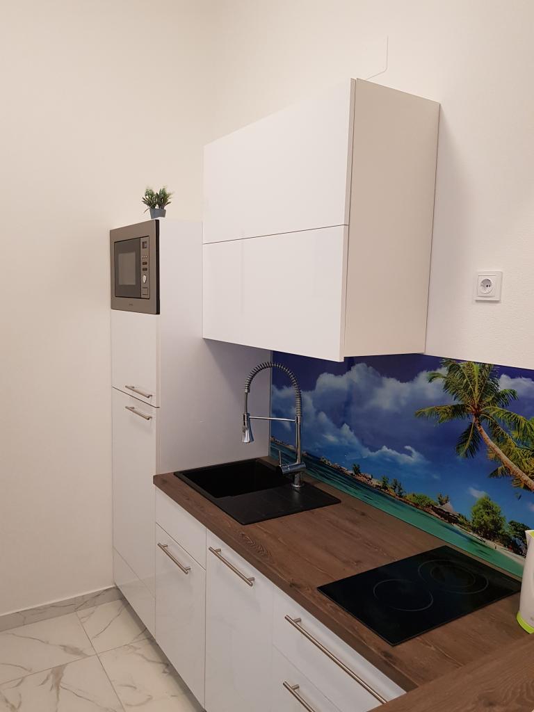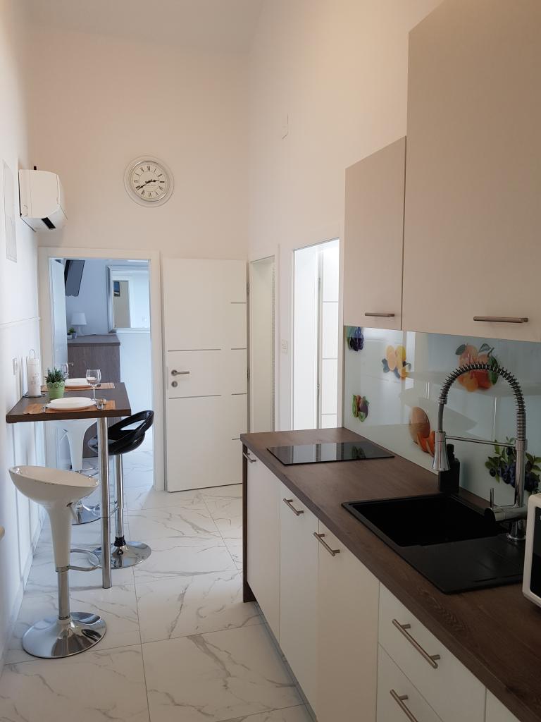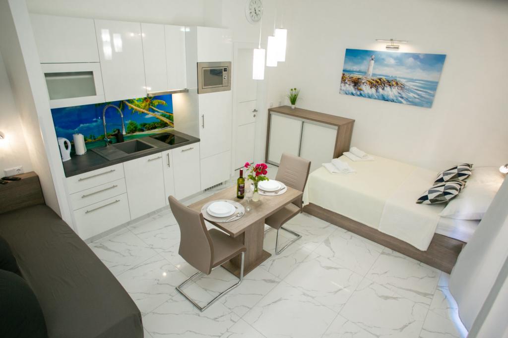 Modernly equipped apartments with a fully equipped kitchen, kettle, toaster, microwave, coffee maker, each apartment has an iron, safe, and hairdryer.