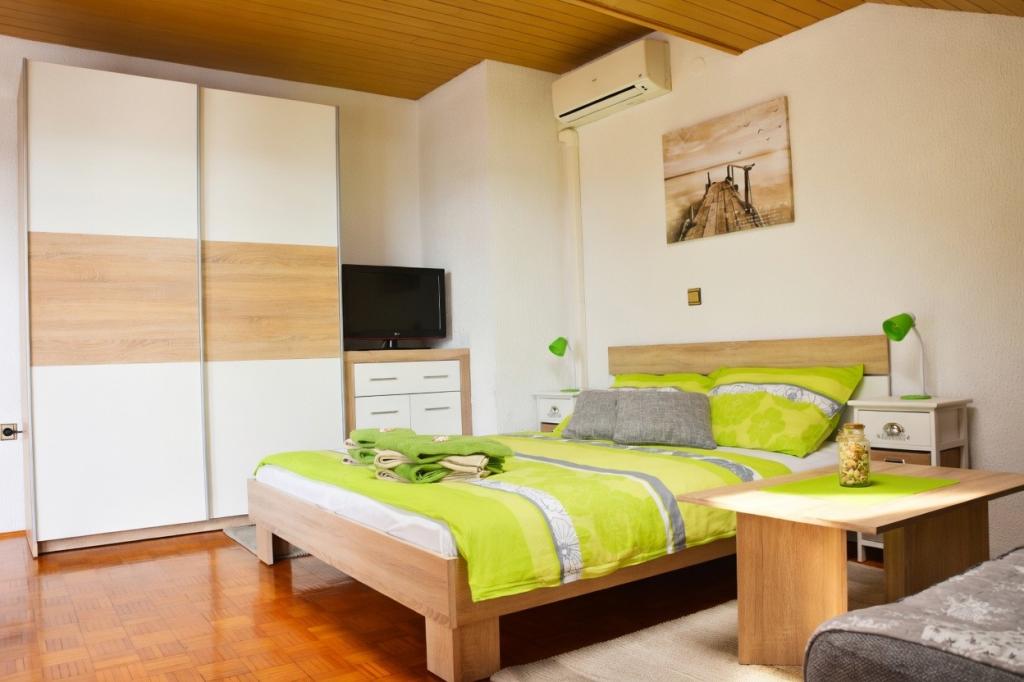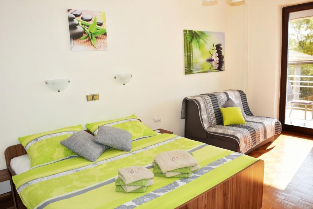 In a quiet location without traffic, there are two cozy apartments, each for up to 4 people. They are surrounded by silence and a relaxed atmosphere, where children can play carefree, and you can enjoy a real vacation away from the everyday hustle and bustle. A special charm is given by the covered terrace with a beautiful view of the sea, from which you can watch magical sunsets every evening. The apartments are located on the 1st and 2nd floors and consist of a kitchen with a living room, a separate bedroom, a bathroom and a terrace with a sea view. They are fully equipped for a comfortable stay - the kitchen has enough dishes and utensils for preparing meals. Guests have access to air conditioning, free Wi-Fi, TV, bed linen, towels and a hairdryer. A parking space is also provided for guests.