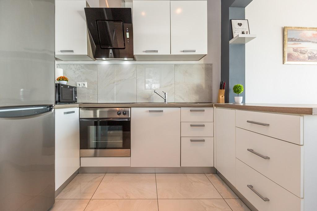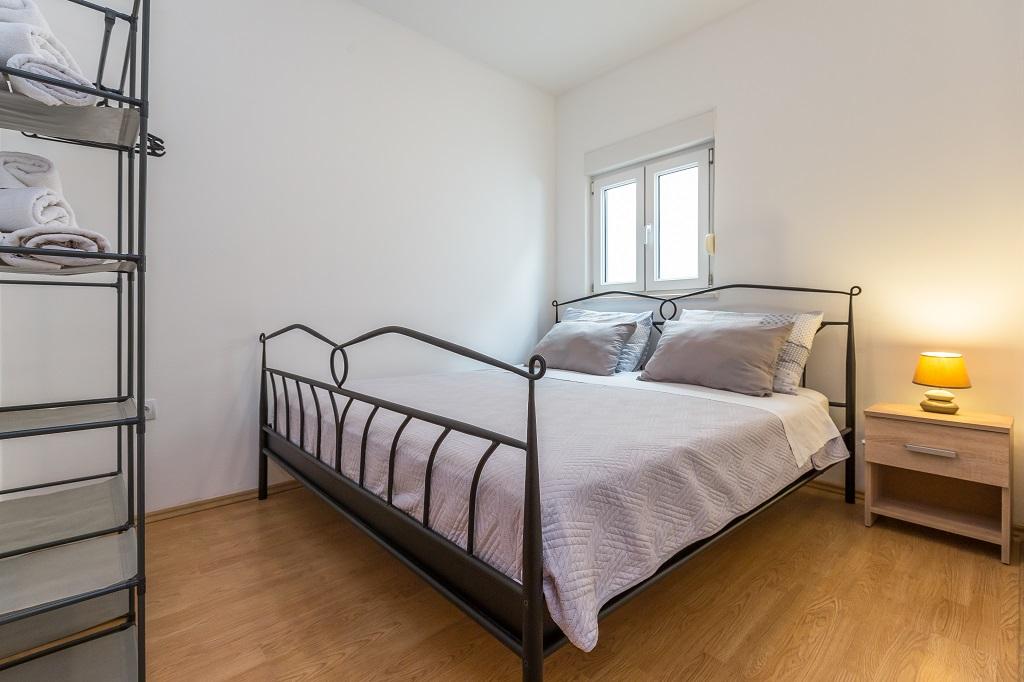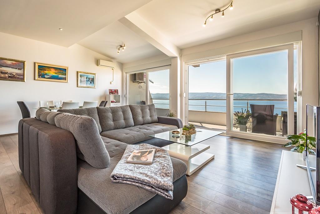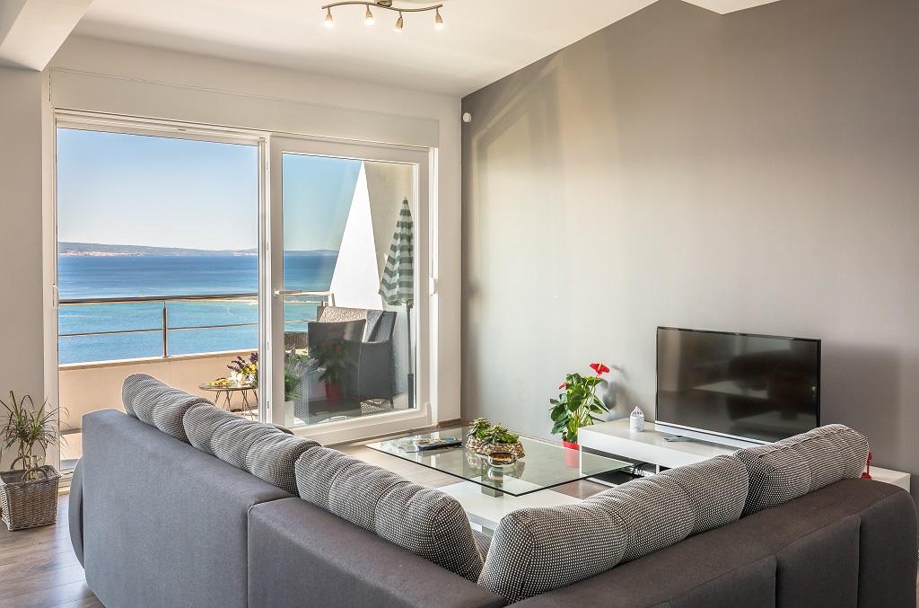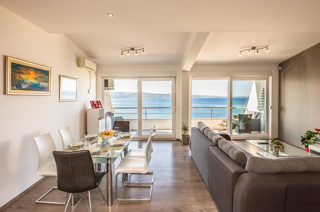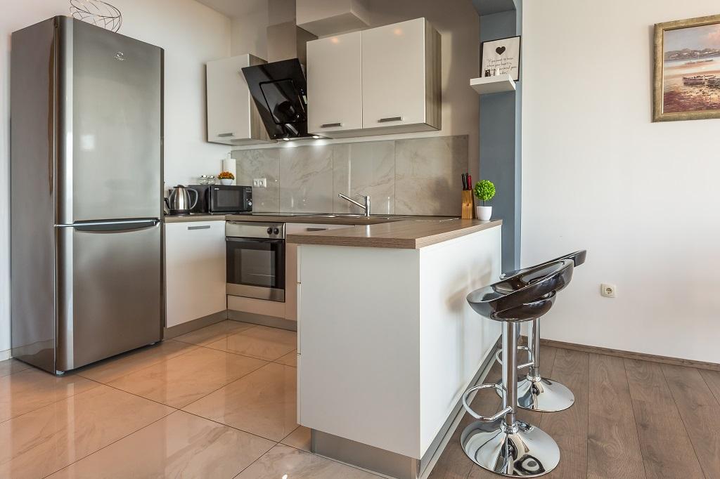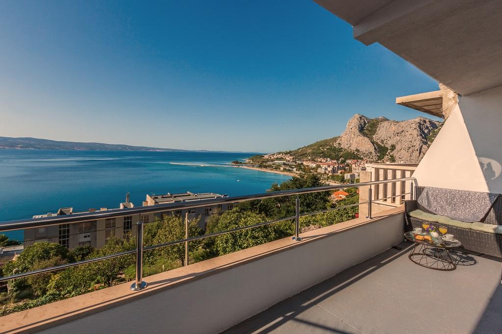 NEW AND MODERN APARTMENT. The apartment is located in a private family house with a view of the sea, islands and local beaches. Near the center of Omiš, only 500m away. Everything is brand new. The apartment has 95 m2. It has 3 bedrooms, a living room, a kitchen with a dining room, a toilet and an additional bathroom, a balcony and a parking space in the garage. Bedrooms: One room has a large bed (180 x 190) for 2 people. The second room has a French bed (160 x 190) for 2 people. The third room has a single bed (90 x 190) for 1 person. Bathroom with sink and shower. WC with sink and washing machine. The kitchen is fully equipped. The living room is spacious. Large balcony with seating.