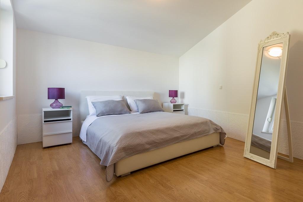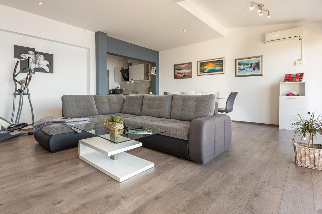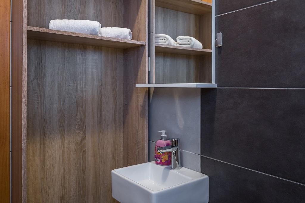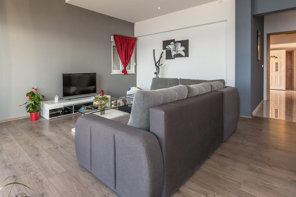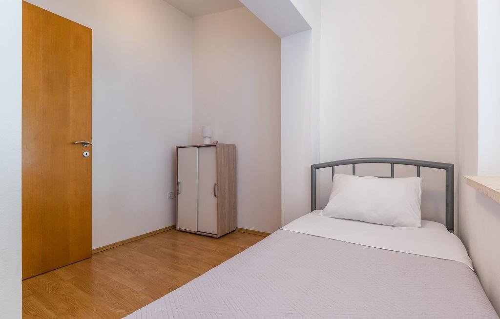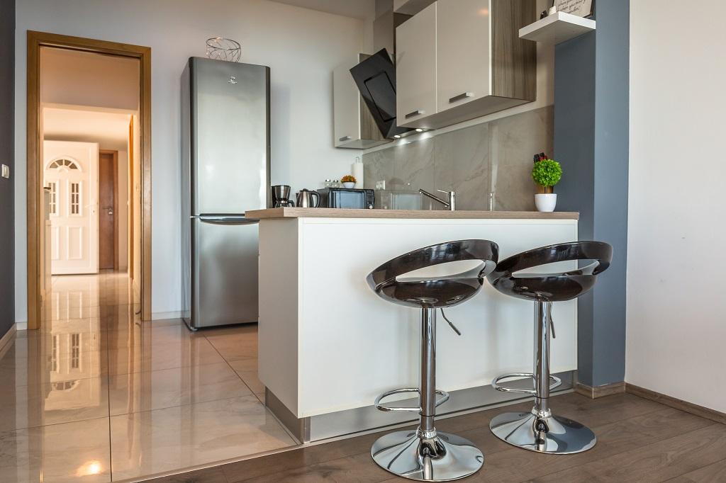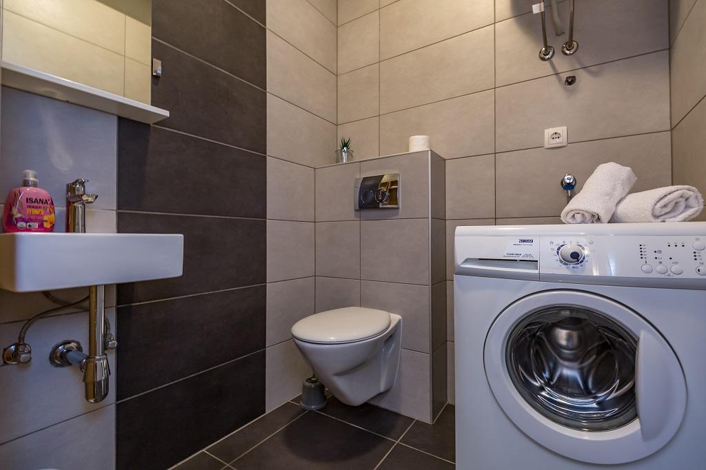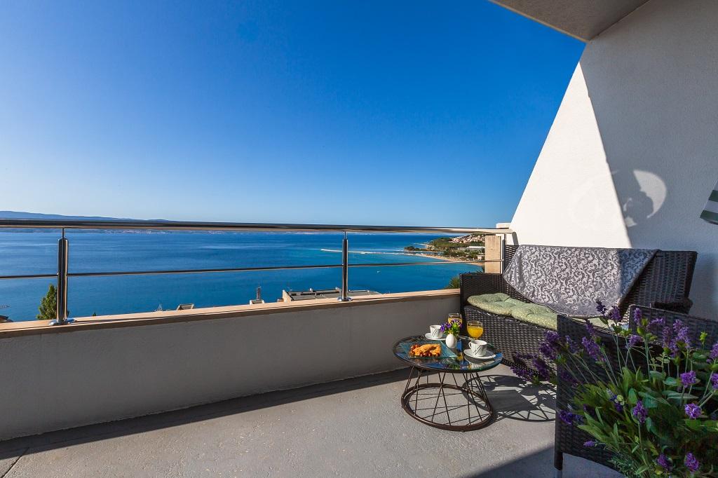 NEW AND MODERN APARTMENT. The apartment is located in a private family house with a view of the sea, islands and local beaches. Near the center of Omiš, only 500m away. Everything is brand new. The apartment has 95 m2. It has 3 bedrooms, a living room, a kitchen with a dining room, a toilet and an additional bathroom, a balcony and a parking space in the garage. Bedrooms: One room has a large bed (180 x 190) for 2 people. The second room has a French bed (160 x 190) for 2 people. The third room has a single bed (90 x 190) for 1 person. Bathroom with sink and shower. WC with sink and washing machine. The kitchen is fully equipped. The living room is spacious. Large balcony with seating.