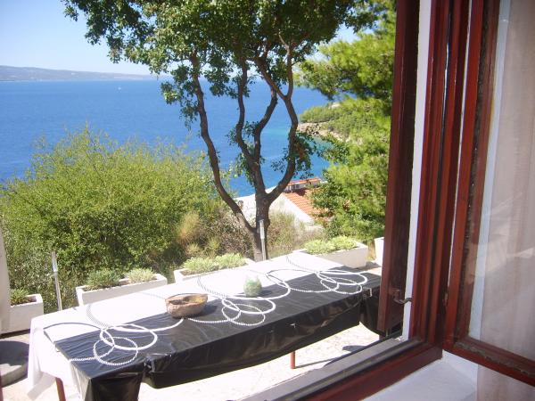 The apartment is clean, with two bedrooms and air conditioning, and a fully equipped kitchen with a fan. The owner is very friendly and helpful. The beautiful view from the terrace is a pleasure to drink coffee in the morning and spend time with family in the evening. There are quite a few steps leading to the beach, but that wasn't a problem for us. The beach is beautiful and uncrowded, with a large pine tree providing plenty of shade.