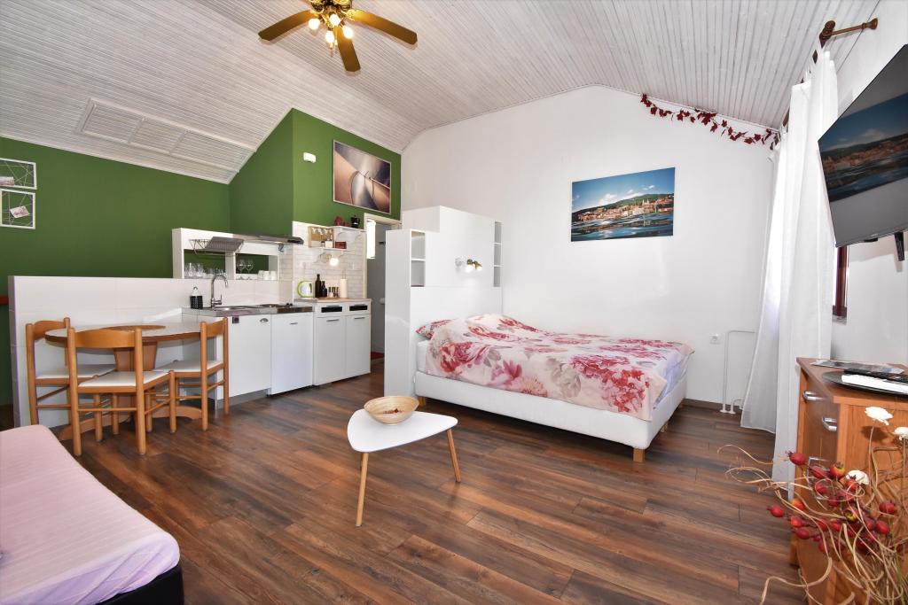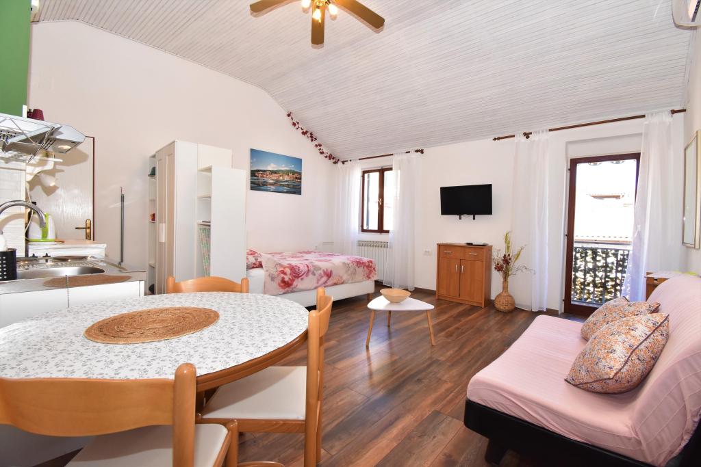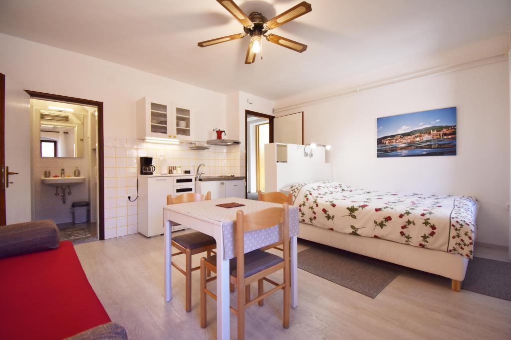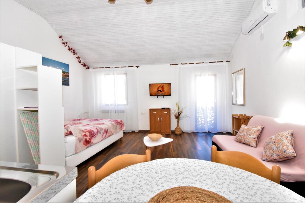 Two studio apartments, each with one double bed and one extra bed, are located in Volosko, a quiet part of Opatija, a former fishing village. They are only 50 m from the sea. In their immediate surroundings there are grocery stores and several of the best restaurants on the Opatija Riviera! Studio+1 ID:2710 consists of a room with a double bed and an extra bed (a sofa bed), a kitchenette - part of the room, a bathroom (shower/toilet) and a balcony with a view of the sea. Studio+1 ID:2711 has everything that Studio+1 ID:2710 has except for the balcony and sea view. Instead of a balcony, Studio Apartment 2 has an exit to the terrace (without sea view).