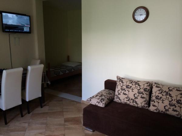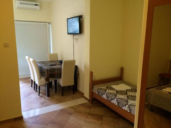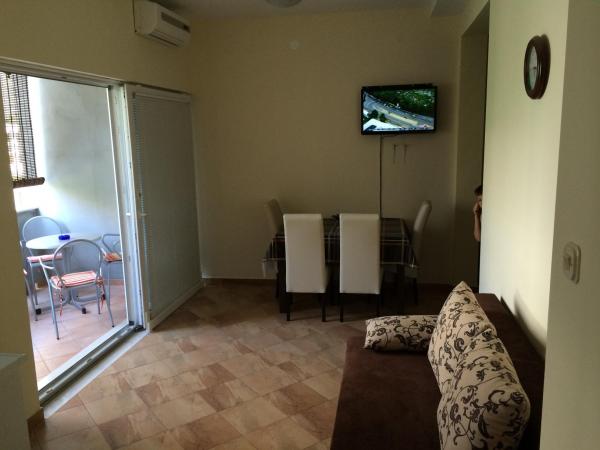 The apartments are newly decorated and modernly equipped with quality TVs and high speed internet. In the immediate vicinity (less than 50 meters) there is a supermarket, a white shop, a textile store, a bakery, a cafe bar, a restaurant, a football pitch, a bus, a bus stop. The facility is located 150 meters from the main sandy beach. The main promenade by the sea is 100 meters away from the property.