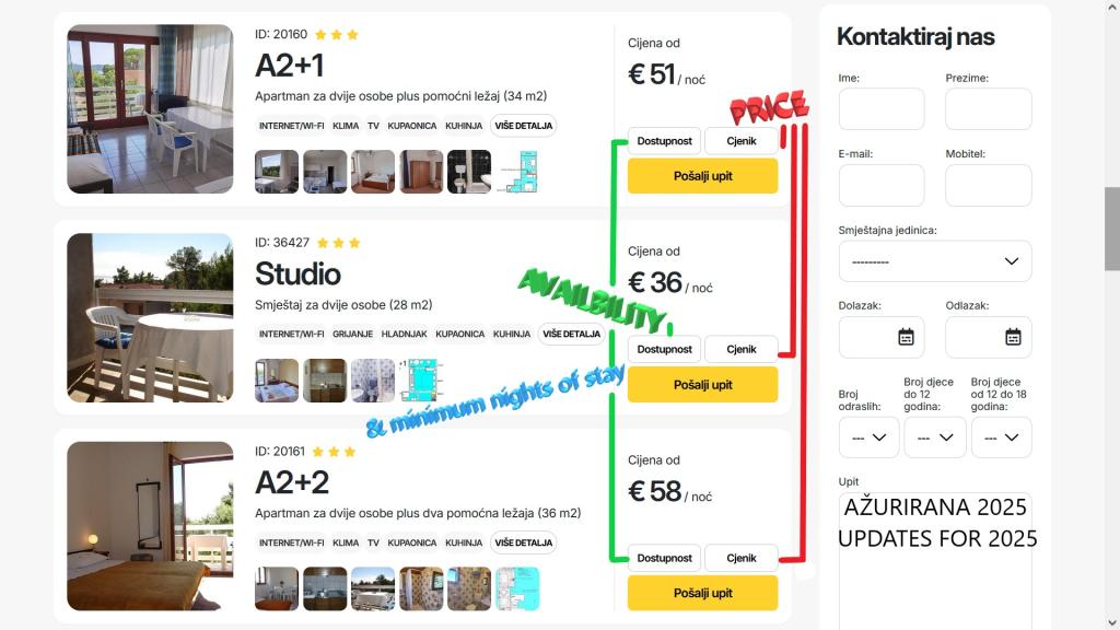 The accommodation facility is located on the last street on the western side of Orebić. Near the hotel complex, right next to a pine forest. The sea and public beaches are about 2.5 minutes' walk away. The coast with beaches is abundant in the shade of pine trees and Česmin, and there are also bars and restaurants. The public beach under the Grand Hotel with a cove and shallow sea with sand at the bottom is particularly attractive. All apartments have a balcony - a loggia where, during hot weather and complete silence without wind, the air circulates strongly and pleasantly. Apartments with extra beds "2+2" and "2+1" are suitable for families with two or one child. The "2+2" apartment is equipped with two and the "2+1" apartment with one air conditioner. WELCOME