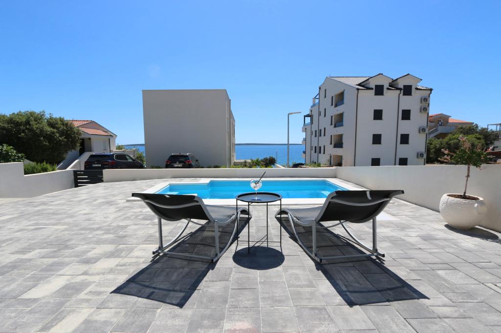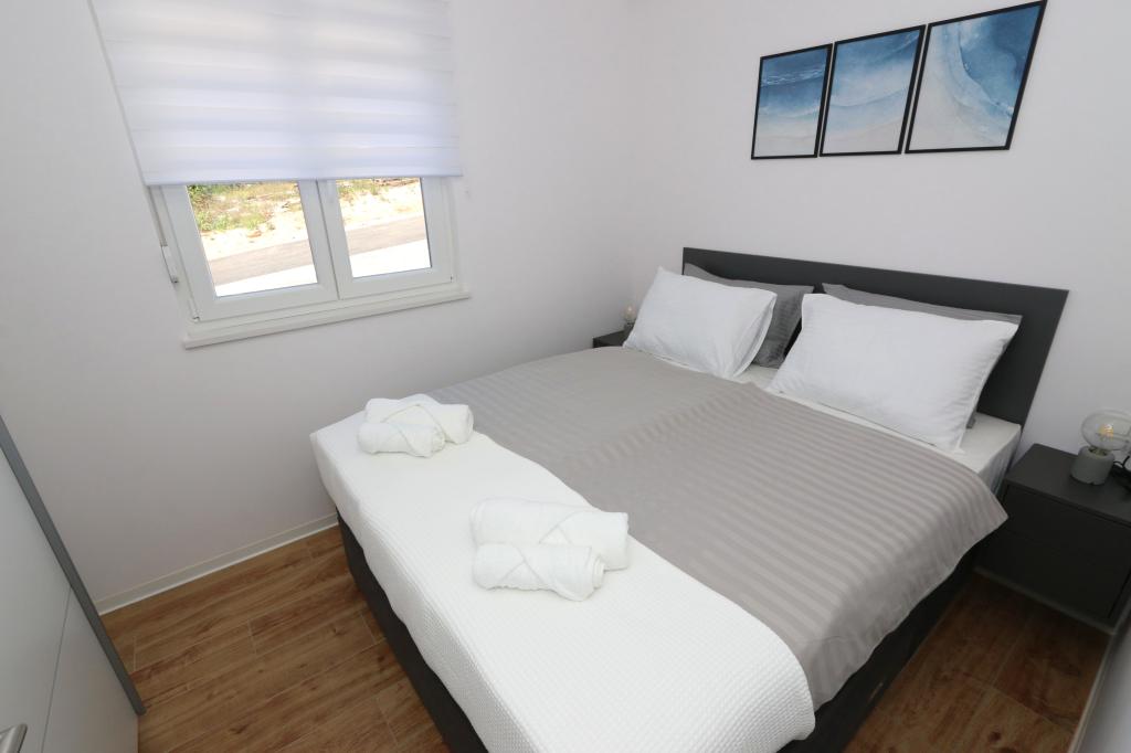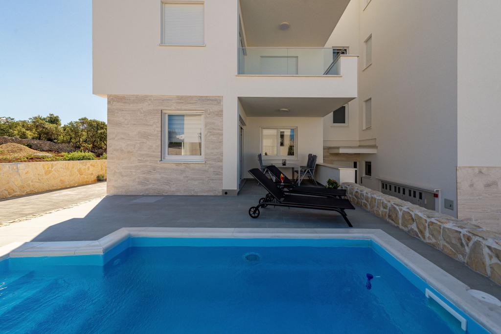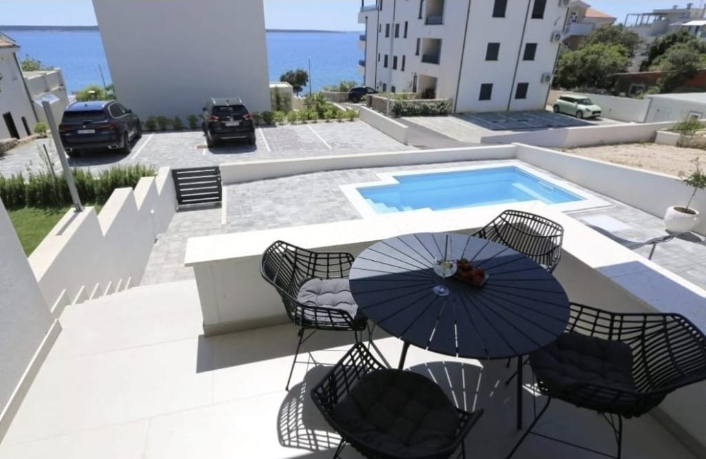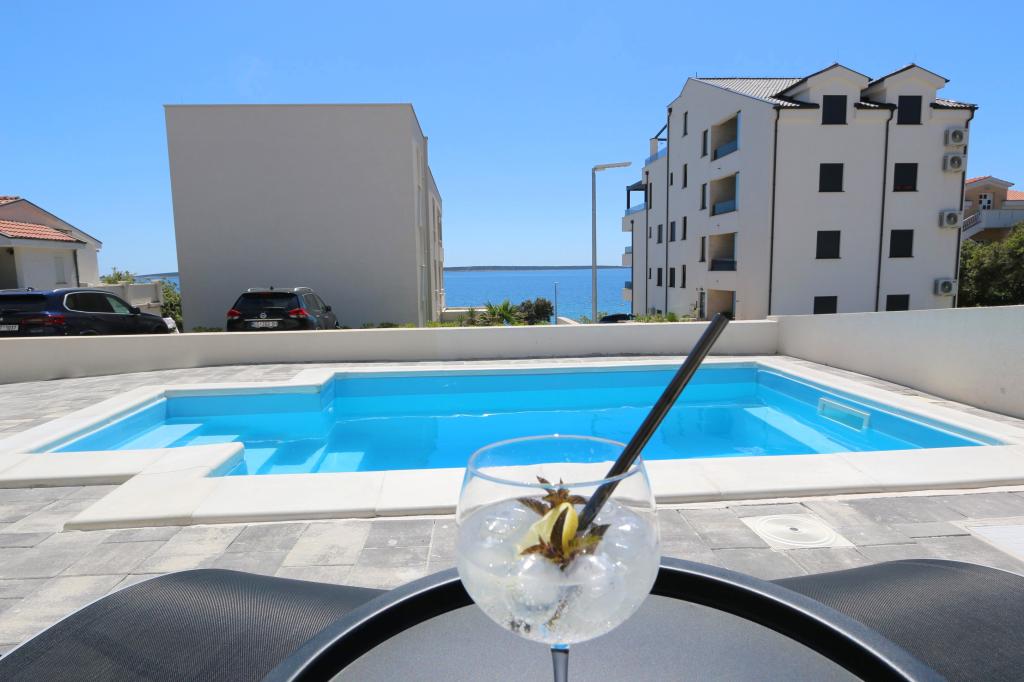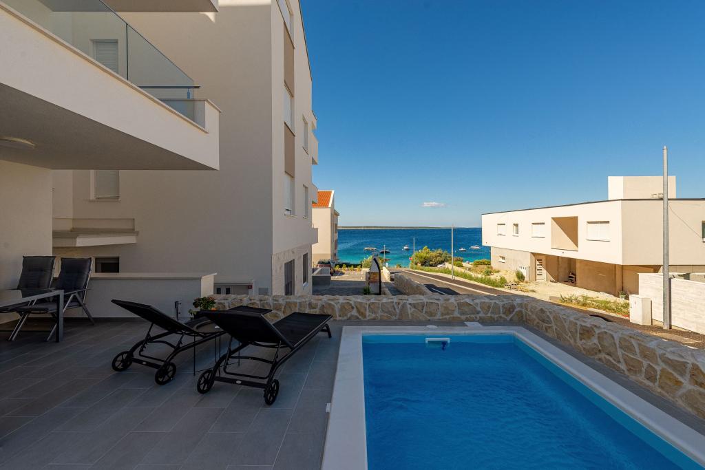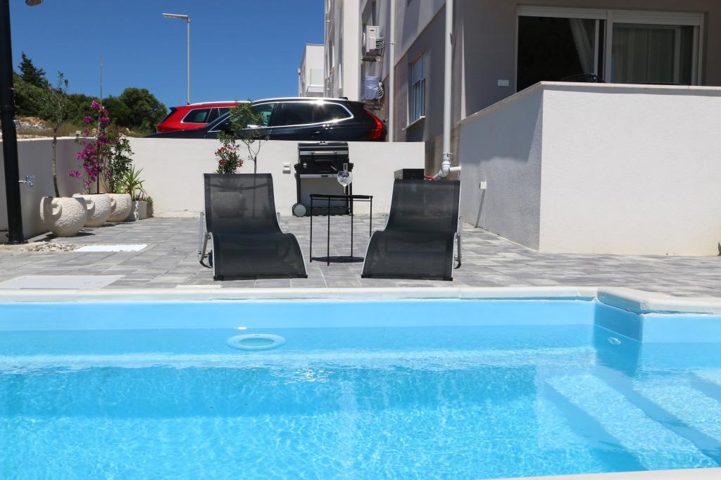 Dolphin view with a pool by the beach is a modernly furnished apartment with a private pool overlooking the sea for your use only. It is located in a quiet part of Mandre on the island of Pag, only 40 m from the first beach. Dolphin view apartment consists of two bedrooms with double beds, a bathroom with a walk-in shower, a fully equipped kitchen, a living room and a dining room. The apartment has 2 parking spaces in the yard as well as a furnished terrace with a swimming pool and a garden with a garden and a grill. The terrace offers a beautiful view of the sea, and dolphins are our frequent visitors. Dolphin view II consists of a bedroom with a double bed and a second bedroom with two single beds with the possibility of joining them into a double bed, a fully equipped kitchen, a living room and a dining room. The apartment has 1 parking space, a furnished terrace with a swimming pool just for you. Restaurants and shops are only a 10-minute easy walk from the apartment in the center of the town where you can find everything you need for a pleasant vacation.