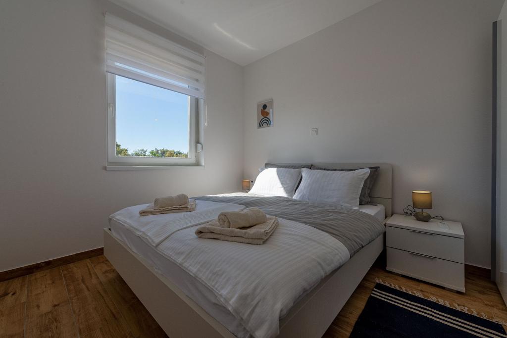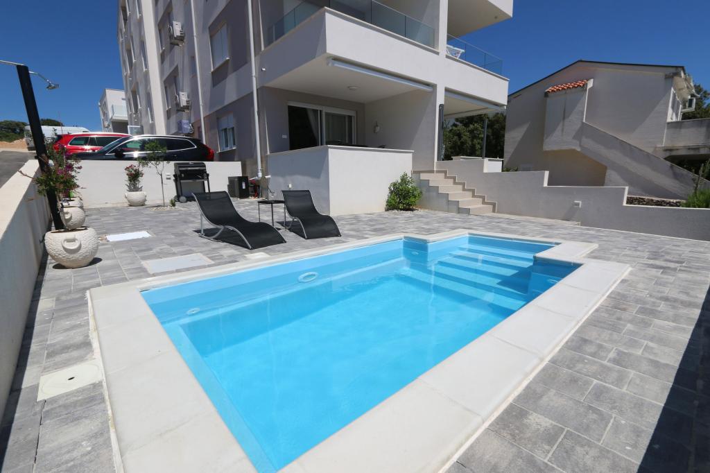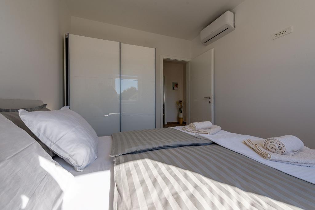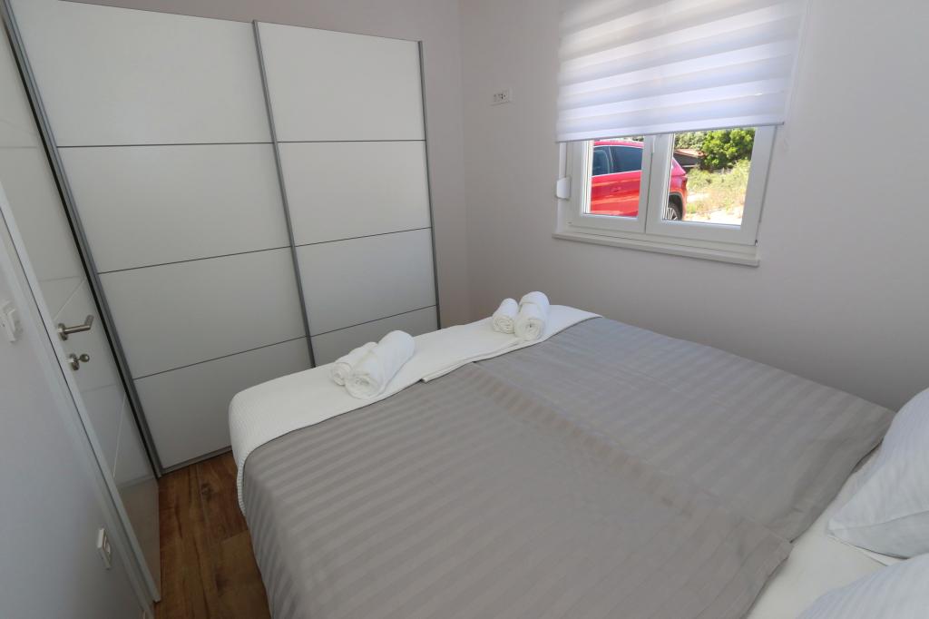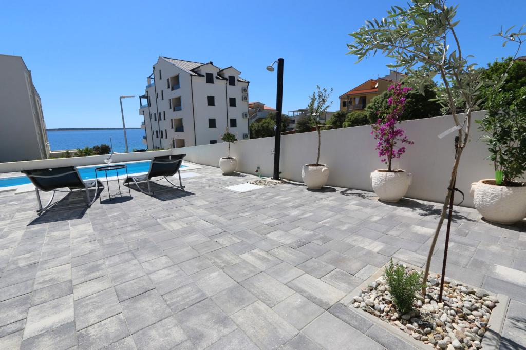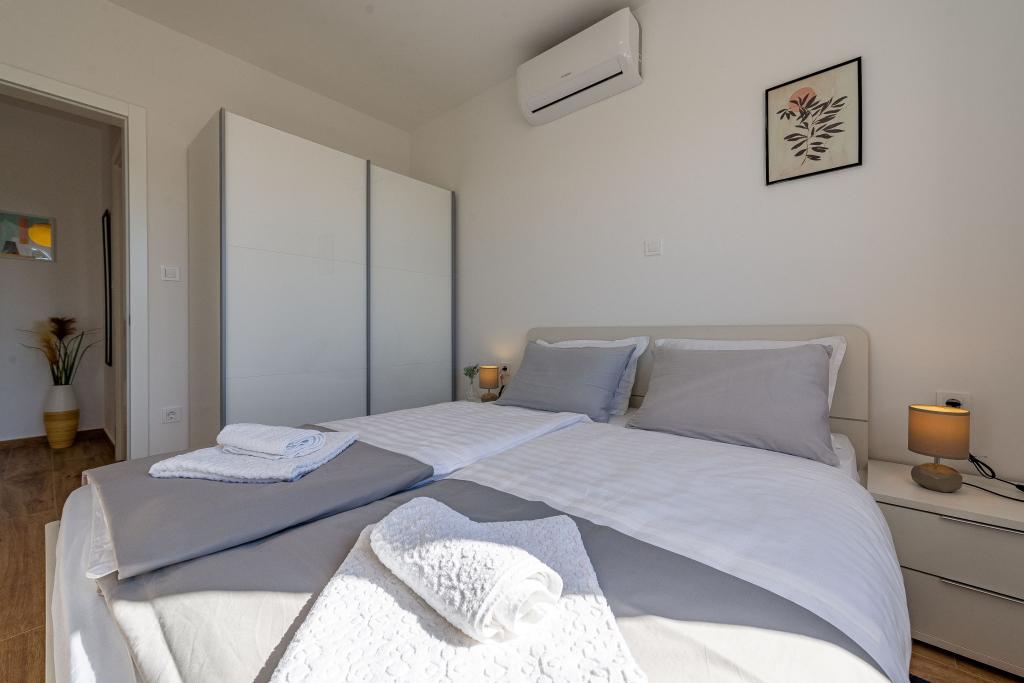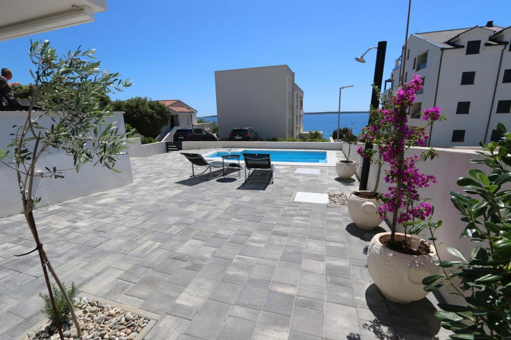 Dolphin view with a pool by the beach is a modernly furnished apartment with a private pool overlooking the sea for your use only. It is located in a quiet part of Mandre on the island of Pag, only 40 m from the first beach. Dolphin view apartment consists of two bedrooms with double beds, a bathroom with a walk-in shower, a fully equipped kitchen, a living room and a dining room. The apartment has 2 parking spaces in the yard as well as a furnished terrace with a swimming pool and a garden with a garden and a grill. The terrace offers a beautiful view of the sea, and dolphins are our frequent visitors. Dolphin view II consists of a bedroom with a double bed and a second bedroom with two single beds with the possibility of joining them into a double bed, a fully equipped kitchen, a living room and a dining room. The apartment has 1 parking space, a furnished terrace with a swimming pool just for you. Restaurants and shops are only a 10-minute easy walk from the apartment in the center of the town where you can find everything you need for a pleasant vacation.
