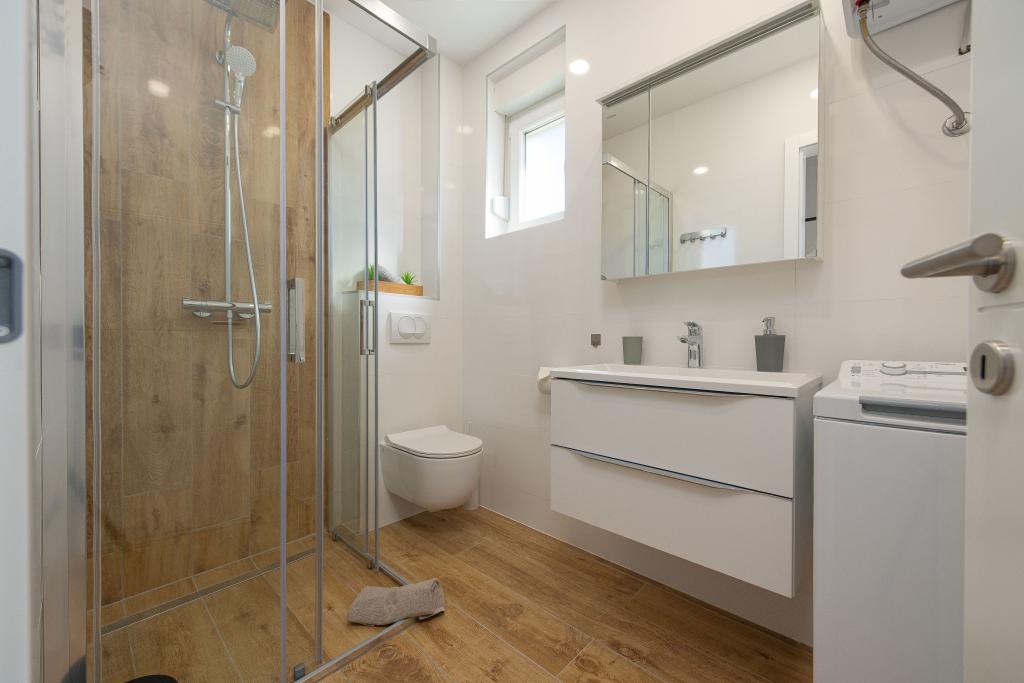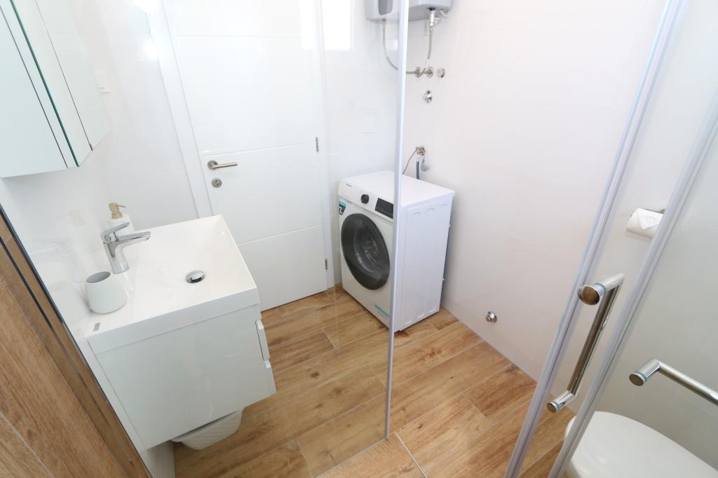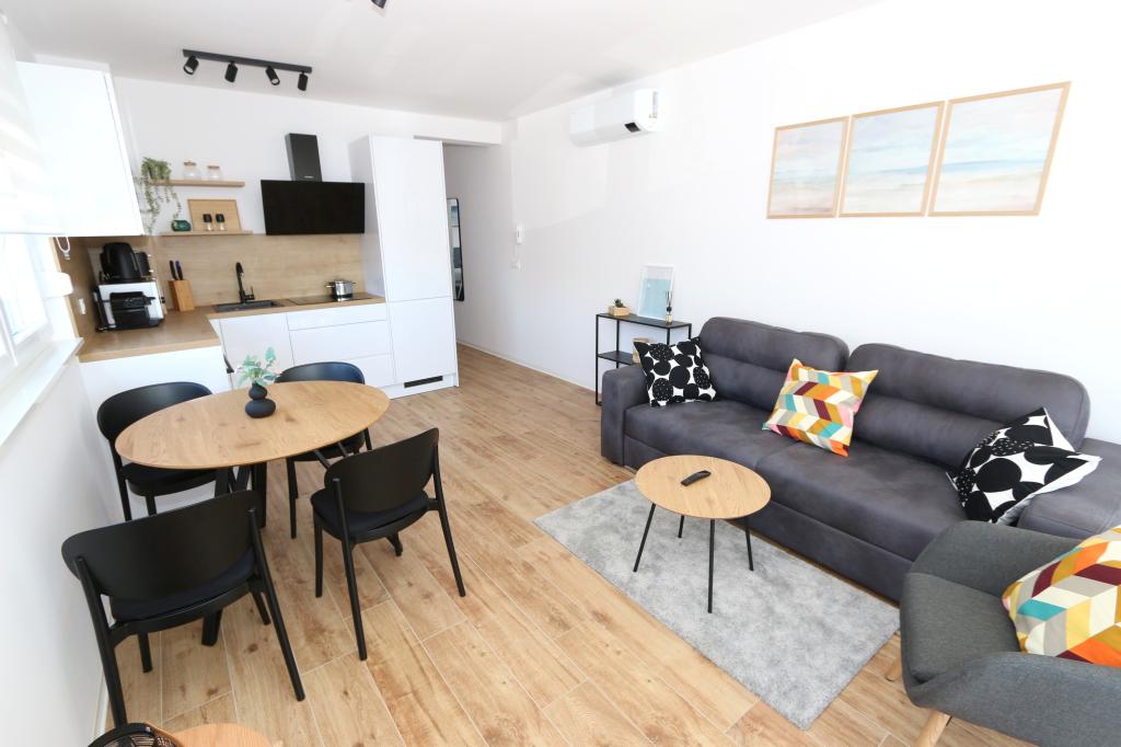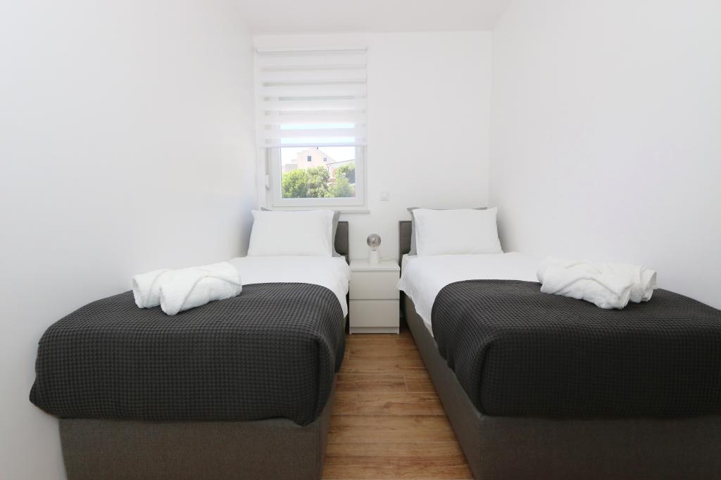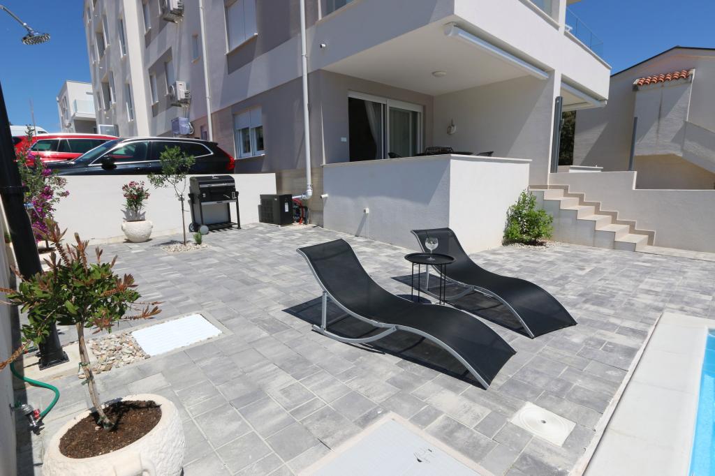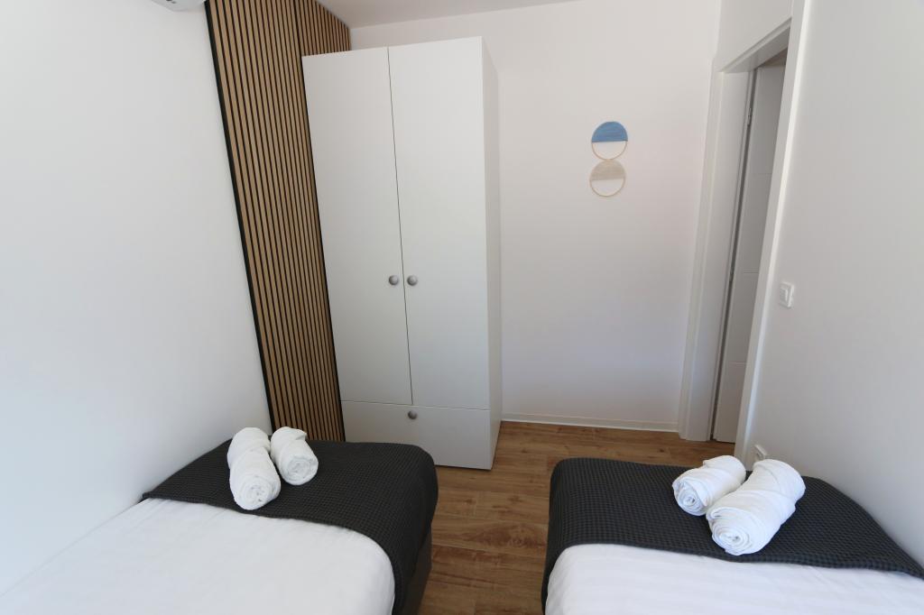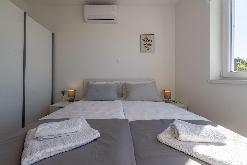 Dolphin view with a pool by the beach is a modernly furnished apartment with a private pool overlooking the sea for your use only. It is located in a quiet part of Mandre on the island of Pag, only 40 m from the first beach. Dolphin view apartment consists of two bedrooms with double beds, a bathroom with a walk-in shower, a fully equipped kitchen, a living room and a dining room. The apartment has 2 parking spaces in the yard as well as a furnished terrace with a swimming pool and a garden with a garden and a grill. The terrace offers a beautiful view of the sea, and dolphins are our frequent visitors. Dolphin view II consists of a bedroom with a double bed and a second bedroom with two single beds with the possibility of joining them into a double bed, a fully equipped kitchen, a living room and a dining room. The apartment has 1 parking space, a furnished terrace with a swimming pool just for you. Restaurants and shops are only a 10-minute easy walk from the apartment in the center of the town where you can find everything you need for a pleasant vacation.