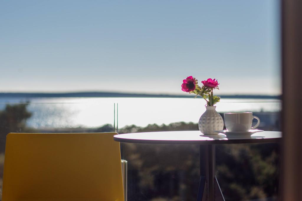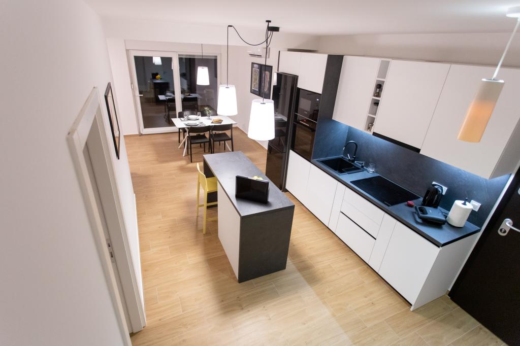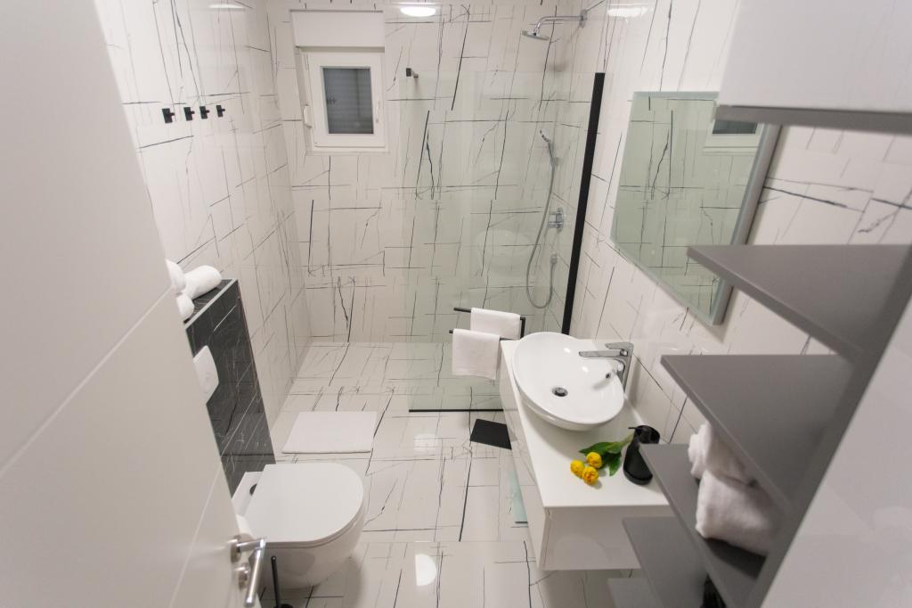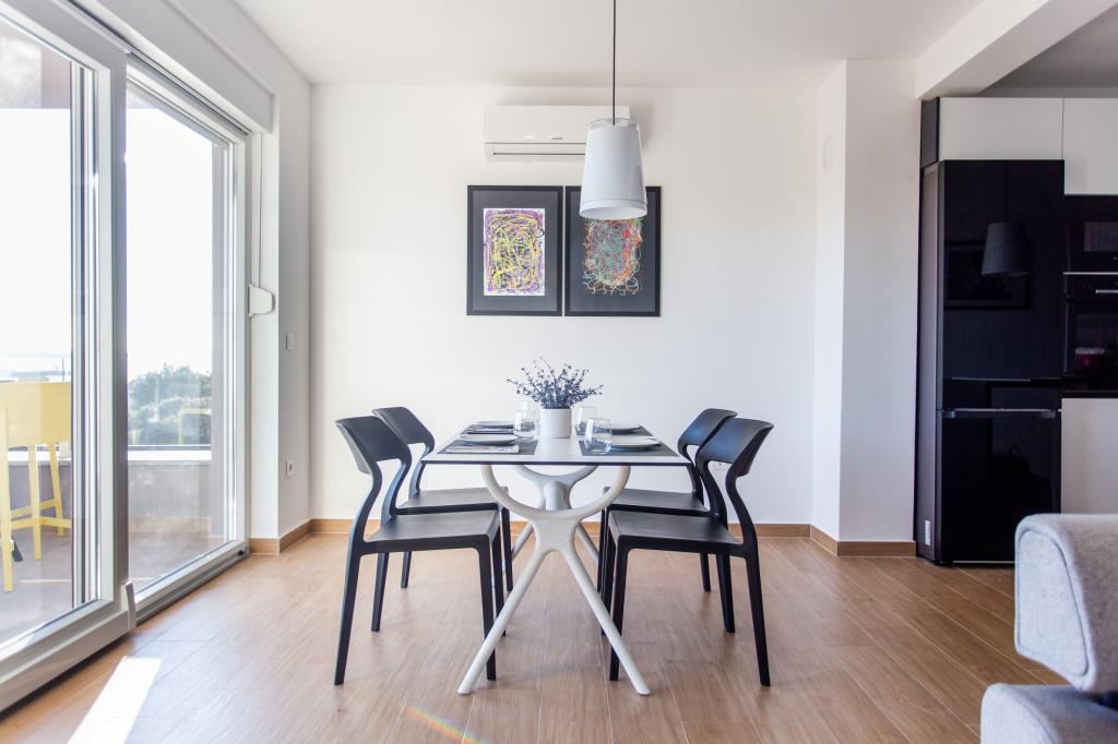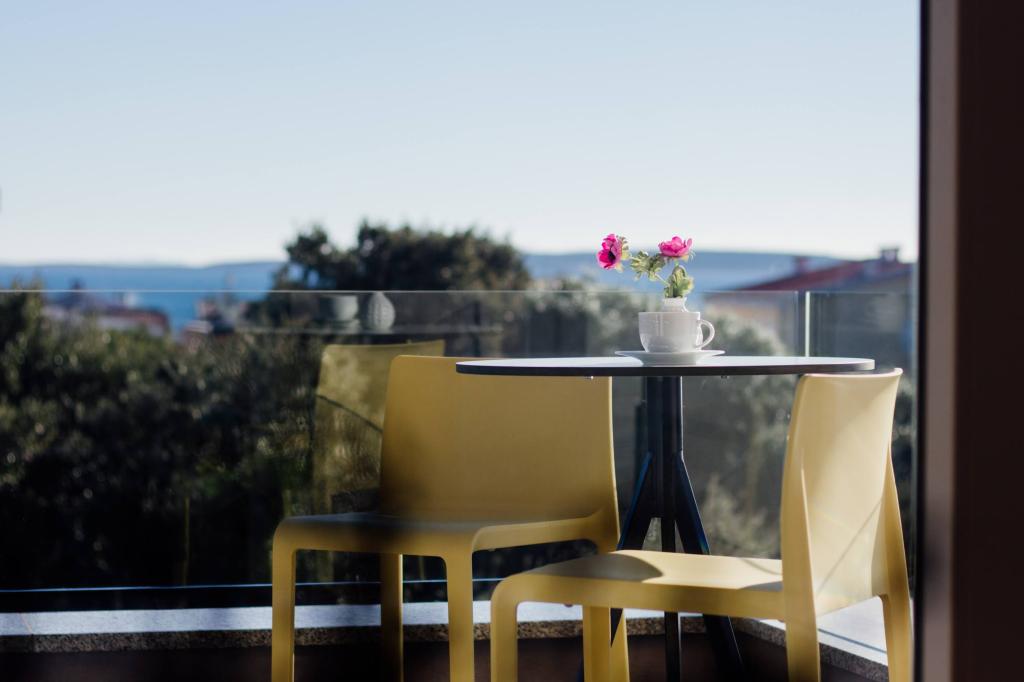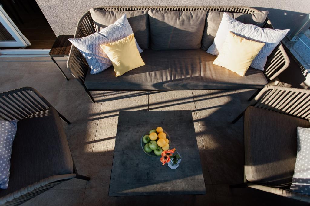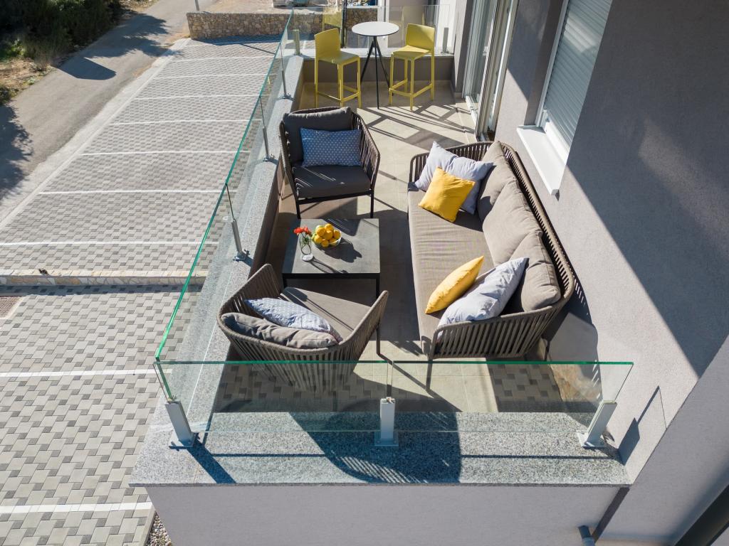 The apartment is comfortable, cozy, with a very modern interior, a very high level of host service: high-quality furniture, appliances and devices, comfortable beds for sleeping with very high-quality bedding and pillows, discreet lighting..... We prepared our own meals and enjoyed breakfast, lunch and dinner in the apartment and on the balcony. A beautiful view of the sea from that meticulously furnished large balcony. The very comfortable sofa for sitting and lying on the balcony tempts you to lie down on it and not move... you breathe in the clean sea air and listen to the chirping of birds in the grove right across from the apartment... that green belt along the entire street is full of olive trees , laurel, spruce, cypress and other Mediterranean plants. Neat entrance, marble staircase... In the same street (by the sea) there is a pastry shop with a terrace and delicious ice creams and cups, and a little further down the main street a bistro with a terrace on the very sea cliff with excellent coffee and cocktails. Next to the sea is a promenade of a couple of kilometers, which we used to the maximum in the morning and at the impressive sunset. The swimming season has just started, we were satisfied with just dipping our feet in the small sandy bay. The sea is wonderfully blue, clean, clear. The beach stretches along the entire part of the promenade. if it is not possible to stay near the greenery, a parasol is needed. We felt very, very good during our entire stay in the apartment..,,it clearly emits "positive energy". We recommend!!!!!