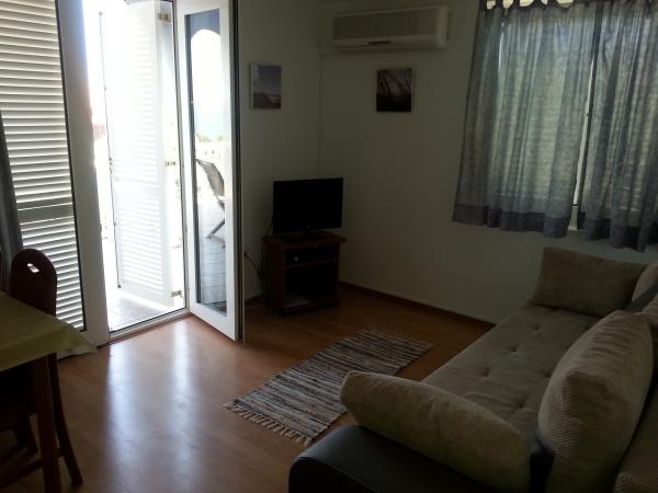 Vila Dora is a harmonious, modern, architecturally beautiful building, seamlessly blended in the environment which it complements and makes it fresh. It is located only two minutes of leisure walk to the nearest beach, where the quality of the sea water is so great that it was awarded with a famous Blue Flag. We offer modern and comfortable apartments, equipped with air conditioning, satellite TV and the wireless internet. Our main moto has always been - a neat, clean and spotless rooms, along with the surrounding space, so the guests can have a relaxing and memorable vacation (as they should have). We treasure our guests and many of them are regular and even became our friends as well. Every year we invest in our Vila Dora, in the apartments, equipment and around the house. Guests have a barbecue for their convenience, a small playground and a parking space.
