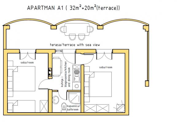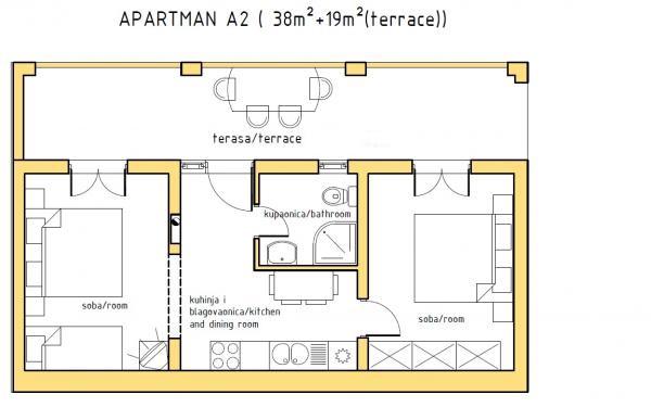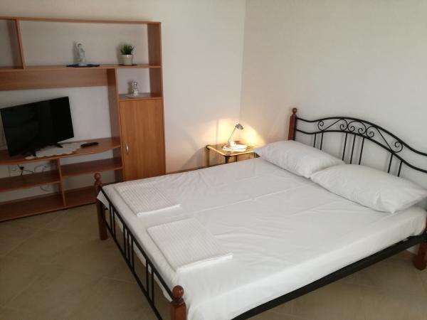 Decorated and equipped Apartments Capo are located on the island of Pag in a quiet part of Pag. Located only 1500 m from the city center they offer a beautiful view of the bay of Pag and provide the necessary peace and security for the rest of you and your family. Near the apartment there are many beautiful sandy and pebble beaches only 5 minutes walk. The apartments have 2 bedrooms, kitchen with dining area, bathroom with shower and toilet, and a large terrace with beautiful views. The apartments are equipped with satellite TV, air conditioning and free WIFI internet. Each apartment has its own free parking.