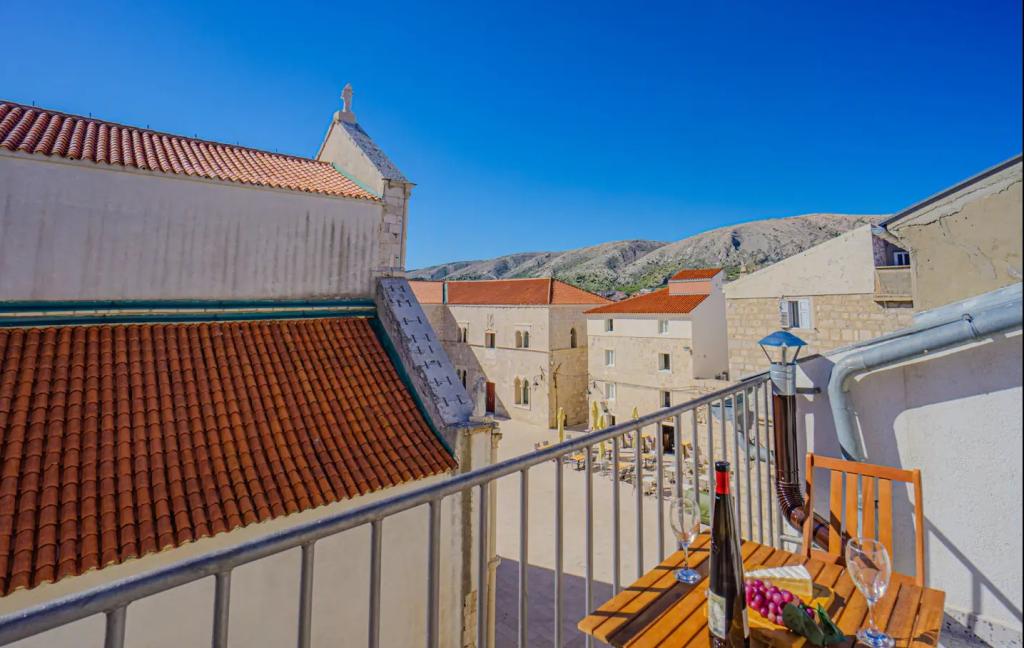 Holiday house, overlooking the main town square, located in the center of Pag. For 4 people. Contains: microwave, smart TV, air conditioning, kettle, toaster, refrigerator, washing machine, terrace with parasol.. Within a radius of 50 meters there are all amenities: restaurants, bakery (10m), shop, pharmacy, cafes, souvenir shops, parking, church, bus station (300m). Free parking included and private parking space. The main town beach is 250 meters from the house. The beach of the Pagus hotel is also nearby. View of the church and the Rector's Palace.