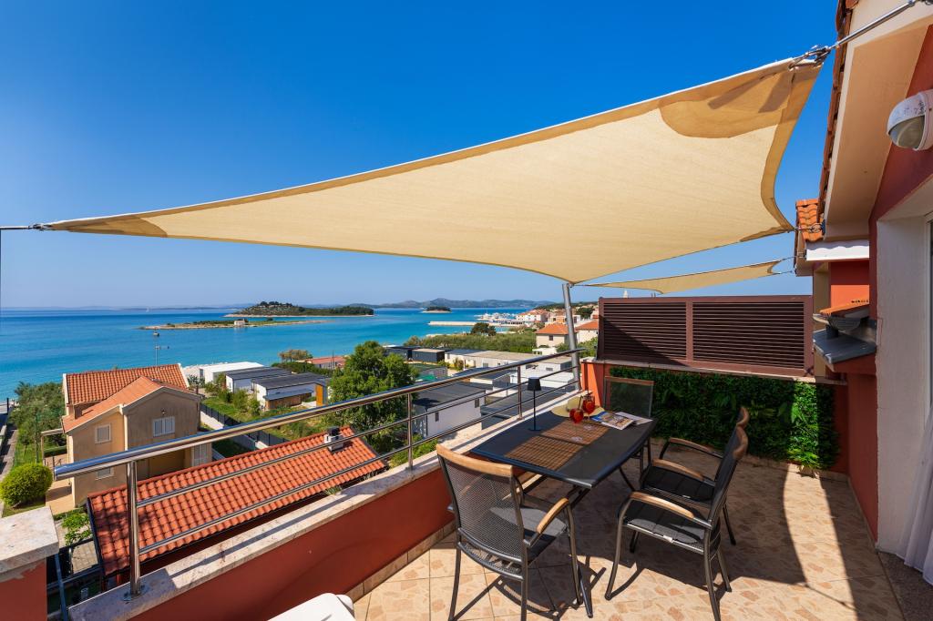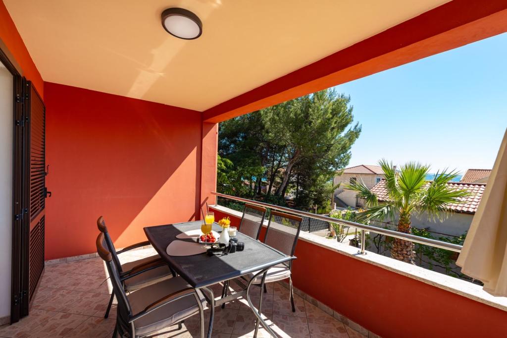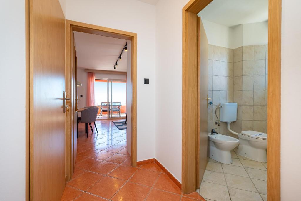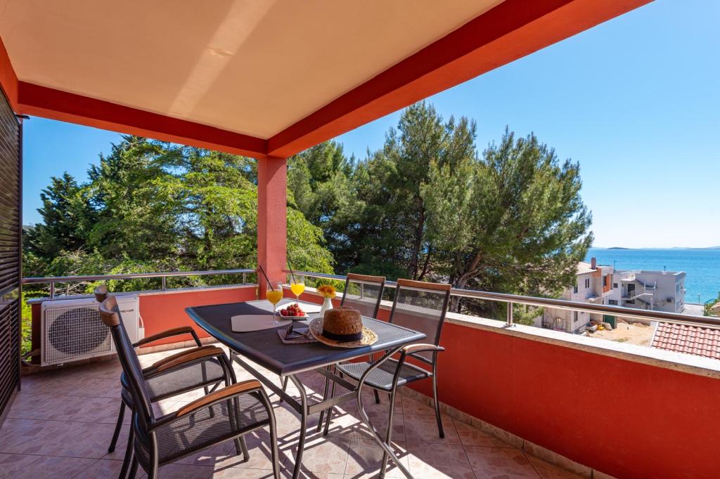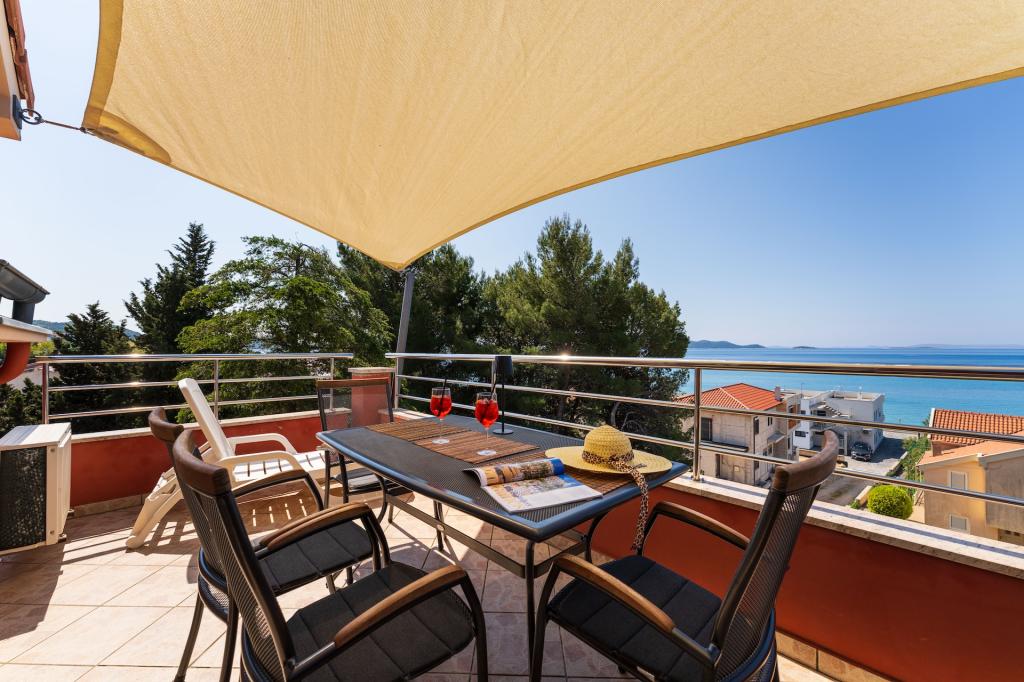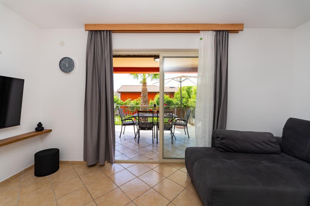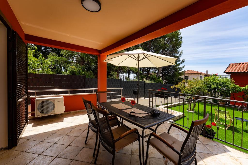 Villa San Marino has eight identical apartments located on three floors. There are two apartments on each floor. The apartments are 55m2 in total and contain a double bedroom, a living room with a click-clack bed, a kitchen, a dining room and a large terrace. All apartments are in the first row to the sea and face the sea. They are equipped with air conditioning for cooling and heating. The kitchens are equipped with utensils for preparing and serving food and drinks in appropriate quantities, a refrigerator, a freezer, an electric hotplate, a gas hob and a hood, and the bathrooms have showers. Each apartment has a flat-screen TV with satellite and antenna and Internet access. The terraces have seating furniture.