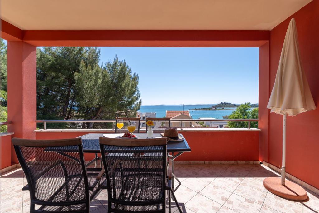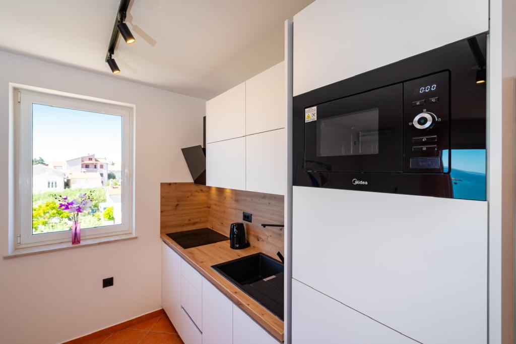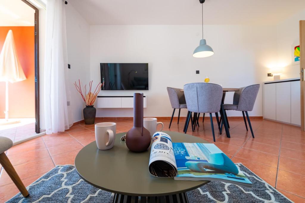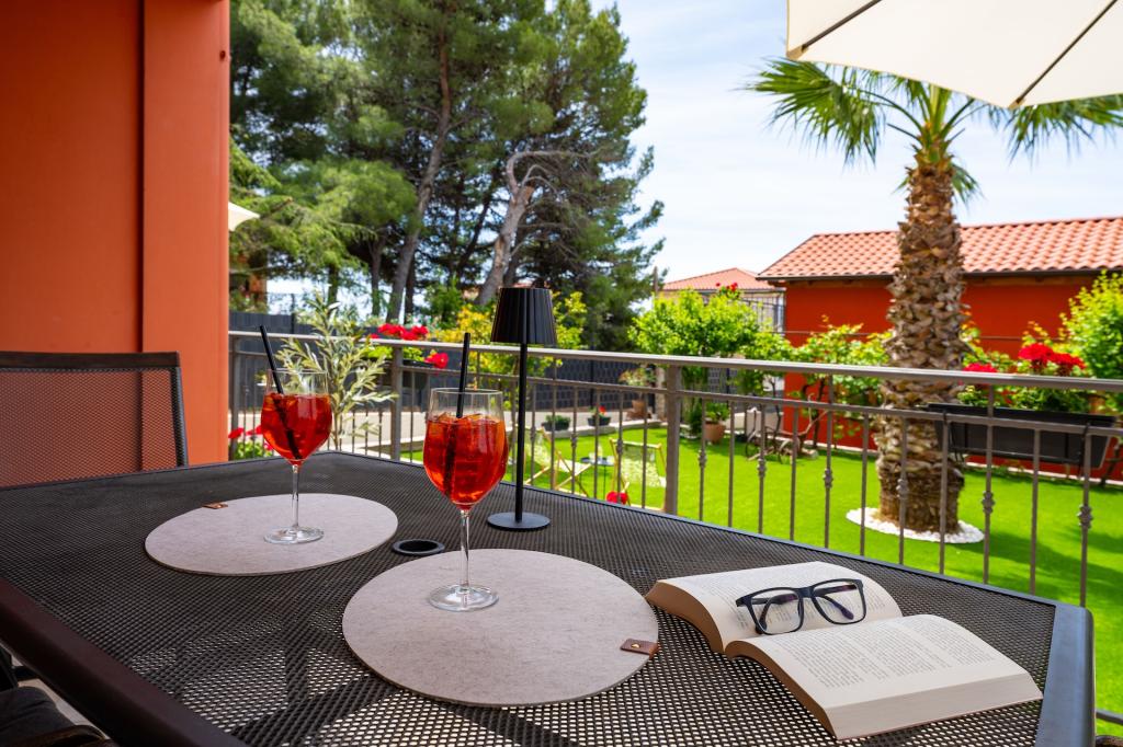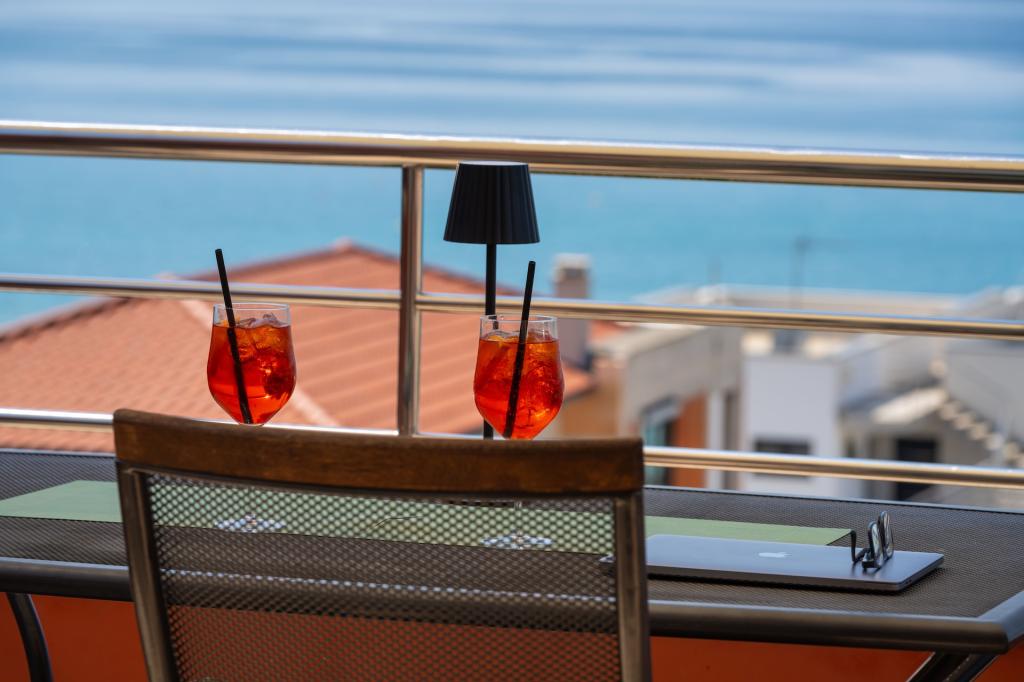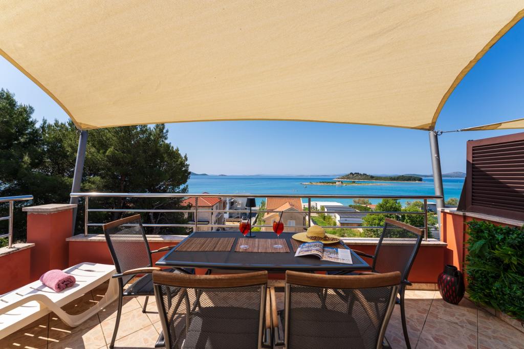 Villa San Marino has eight identical apartments located on three floors. There are two apartments on each floor. The apartments are 55m2 in total and contain a double bedroom, a living room with a click-clack bed, a kitchen, a dining room and a large terrace. All apartments are in the first row to the sea and face the sea. They are equipped with air conditioning for cooling and heating. The kitchens are equipped with utensils for preparing and serving food and drinks in appropriate quantities, a refrigerator, a freezer, an electric hotplate, a gas hob and a hood, and the bathrooms have showers. Each apartment has a flat-screen TV with satellite and antenna and Internet access. The terraces have seating furniture.