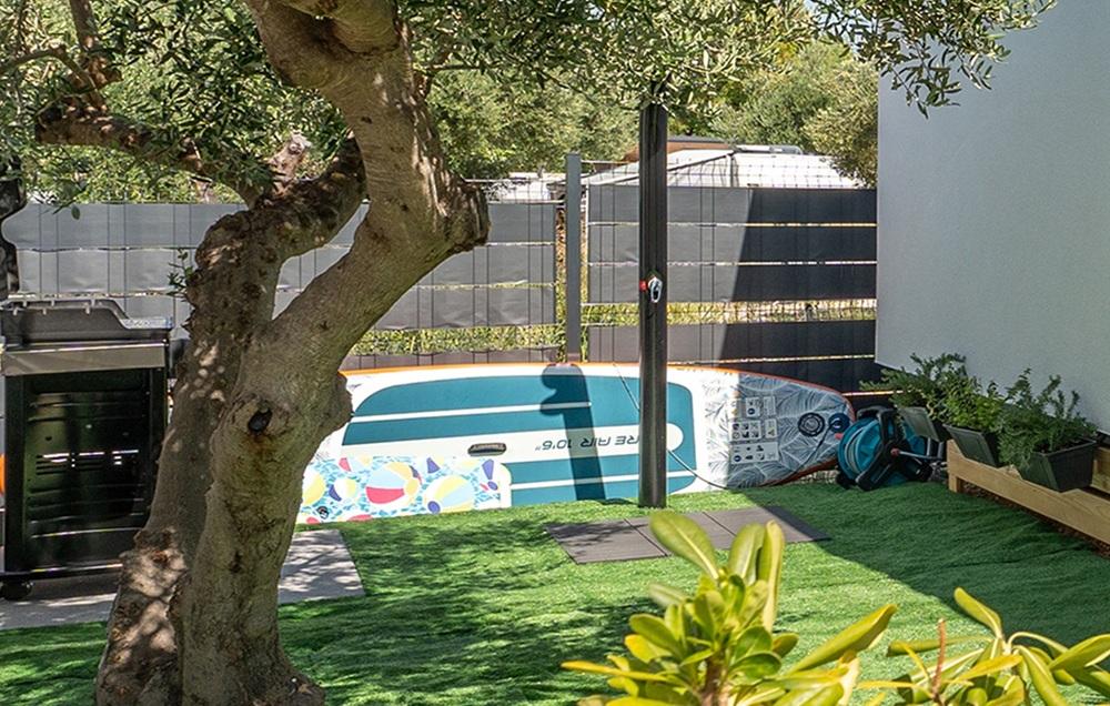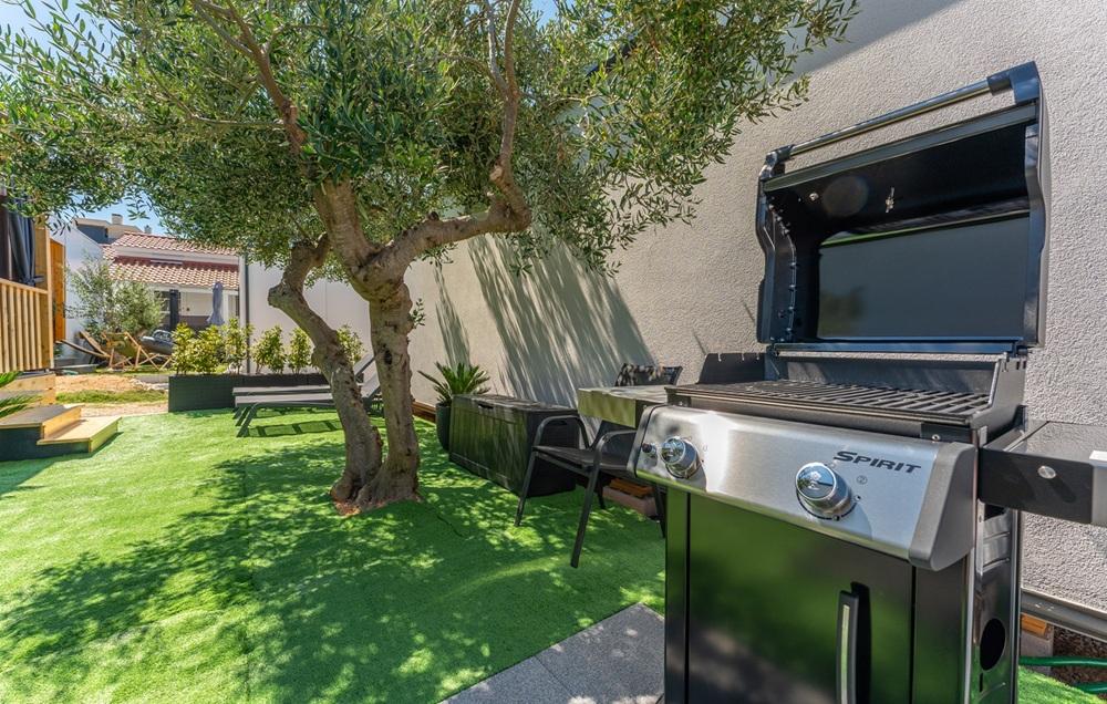 Guests have at their disposal a washing machine, dishwasher, air conditioning, an outdoor and indoor refrigerator, a fan on the terrace, a TV in the living room and on the terrace. The house has two bedrooms with 160 cm wide beds. The beds are equipped with quality mattresses, mattress toppers and satin bedding. There is a sofa bed in the living room for one additional person. The kitchen is fully equipped with dishes and kitchen appliances: coffee machine, oven, microwave, toaster... In the yard, guests have access to a barbecue, sun loungers and two SUP boards. The house has high-speed StarLink internet.