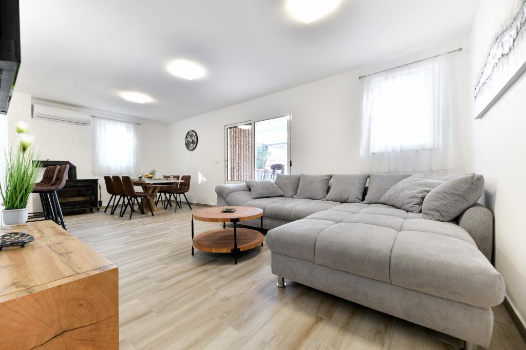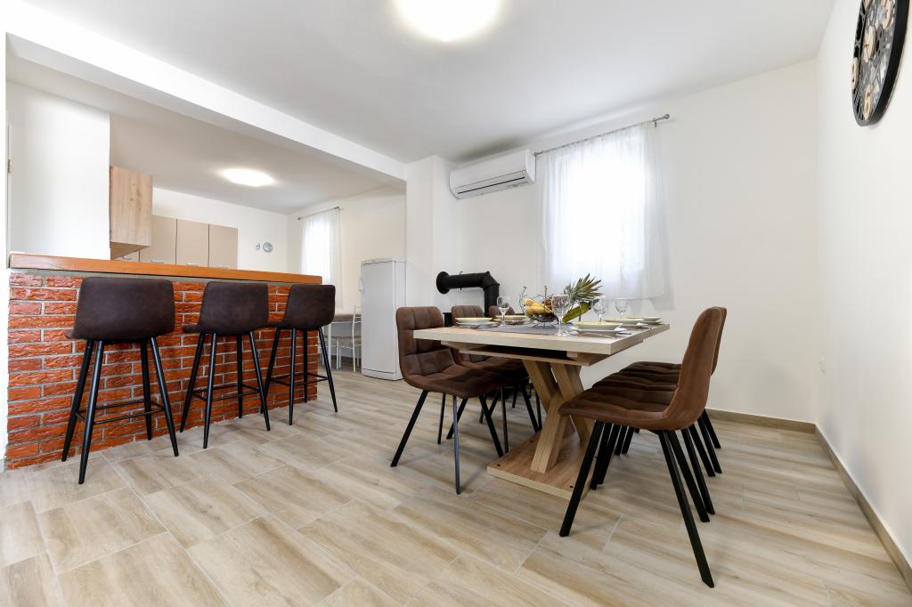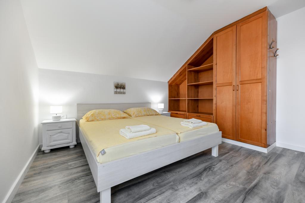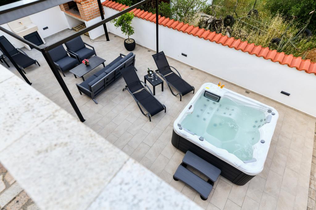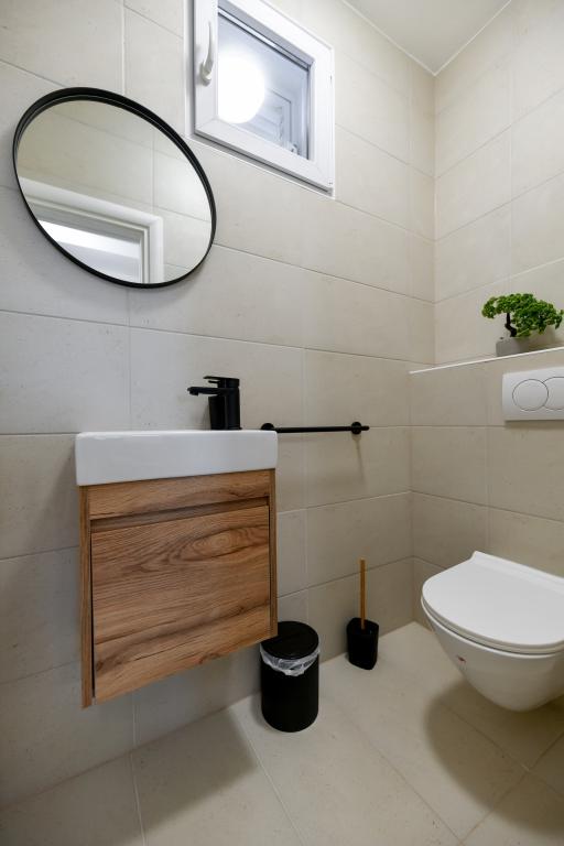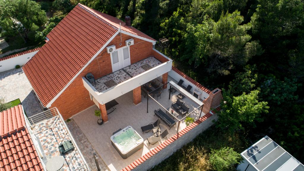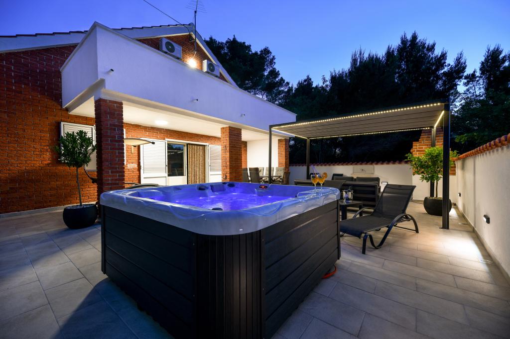 The house is located on the island of Pašman, in an oasis of peace, silence and beauty of a typical small Dalmatian town. Three minutes walk to the beach, five minutes to the store. The facility has a large outdoor terrace, barbecue, deckchairs, a swing for rest and a hydromassage tub. On the ground floor there is a large living room with a kitchen, two bathrooms and three toilets, and a washing machine. There are 4 bedrooms on the first floor, two rooms have access to a large terrace overlooking the sea, a double bed size 180x200, and the other two rooms have a double bed 160x200, and a view of the forest. There is also one toilet on the first floor. A baby cot is available on request. There are three parking spaces in the yard, as well as the possibility of using an outdoor shower. The house was completely renovated in May 2023. A stay of 10 people is also possible, in which case accommodation is provided for two people in a studio apartment on the same plot, with an additional charge. The studio apartment has a kitchen with all appliances, a bathroom with a shower, TV, air conditioning, and a terrace with a view of the sea.