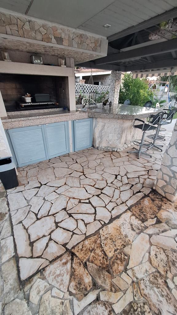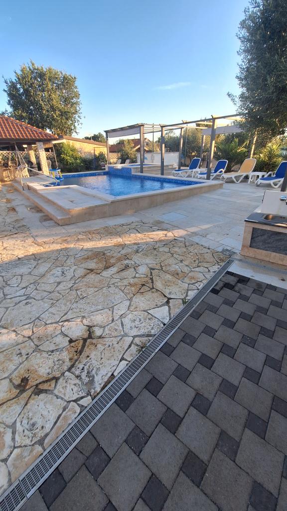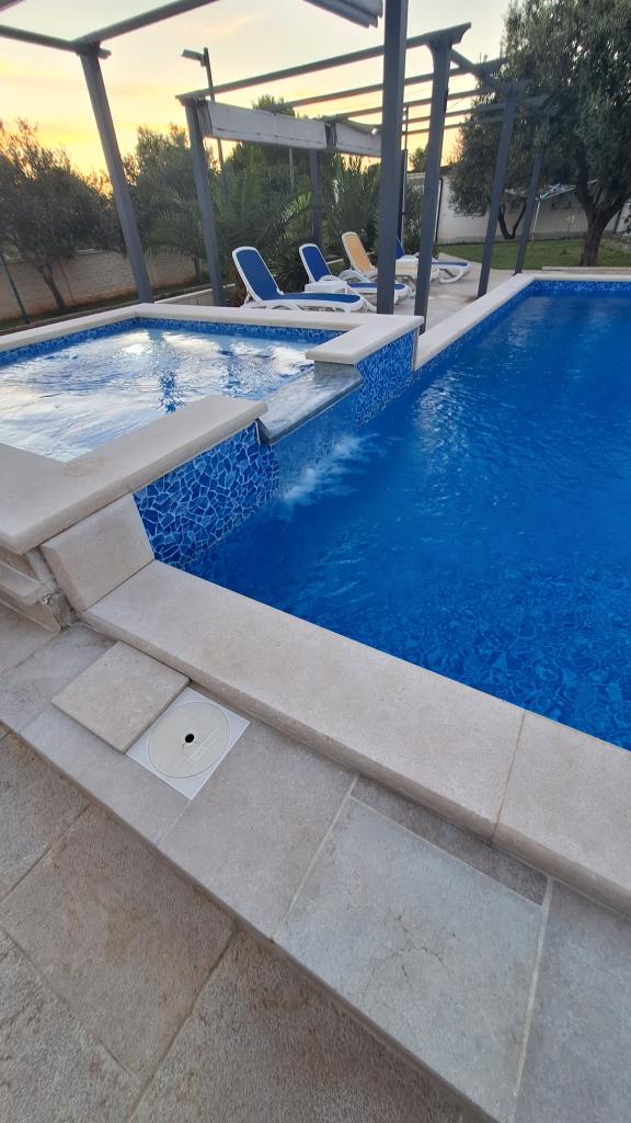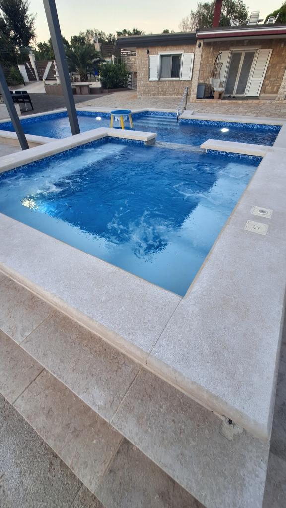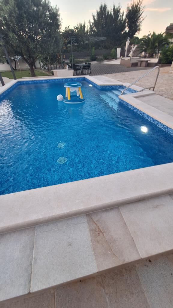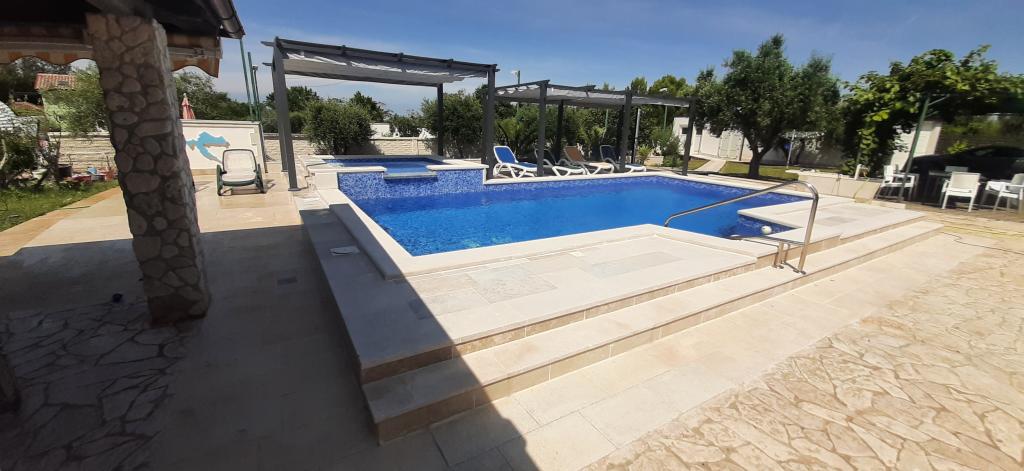 Holiday home with a swimming pool that is heated and a massage pool with an artificial waterfall. The pool is 8x4 m with a massage pool 3 x 3 m. It is 200 meters from the beach. Nearby is a restaurant, a marina for mooring boats and a beach for pets. with grill, parking for 3 cars