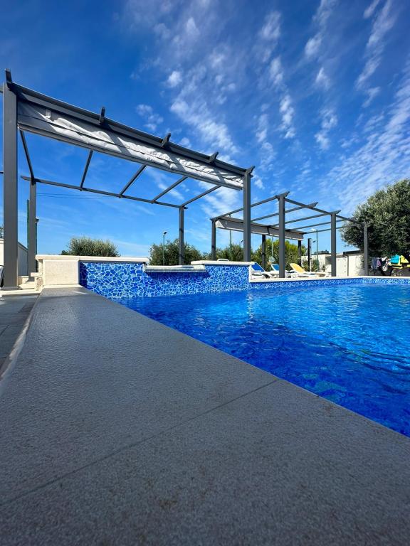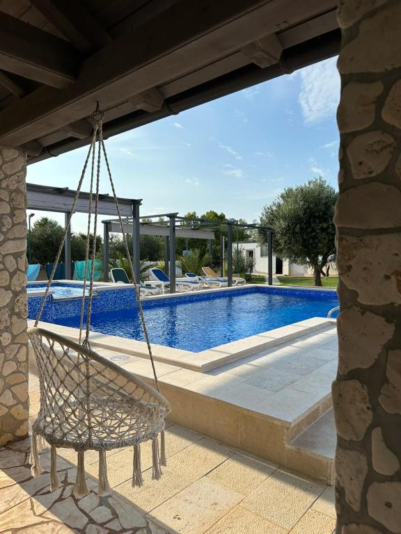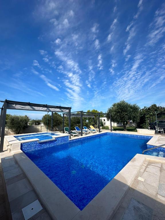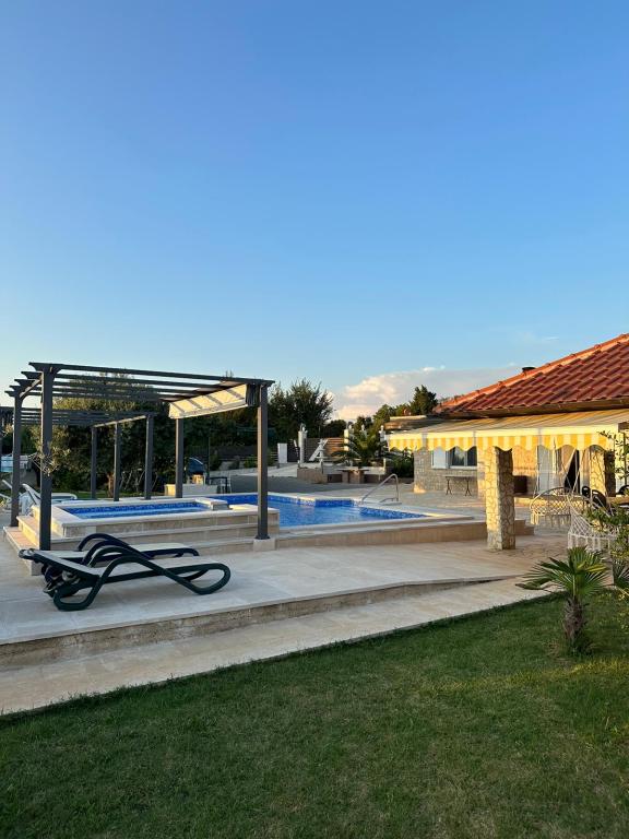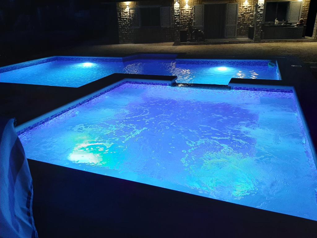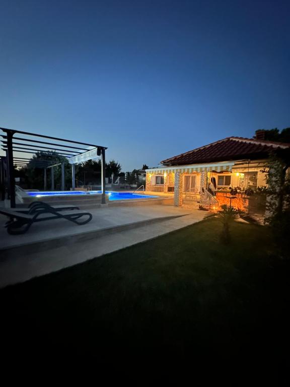 Holiday home with a swimming pool that is heated and a massage pool with an artificial waterfall. The pool is 8x4 m with a massage pool 3 x 3 m. It is 200 meters from the beach. Nearby is a restaurant, a marina for mooring boats and a beach for pets. with grill, parking for 3 cars