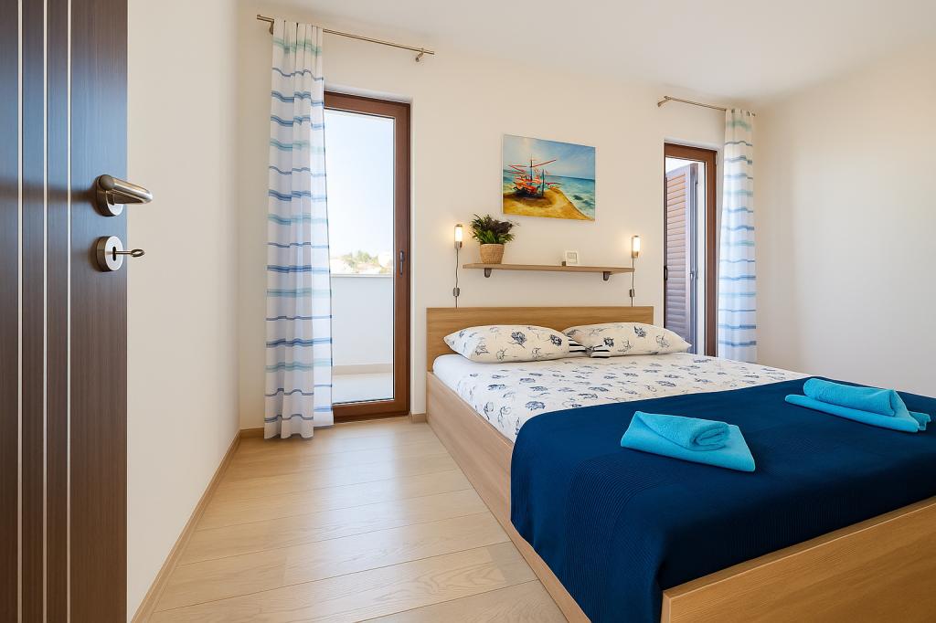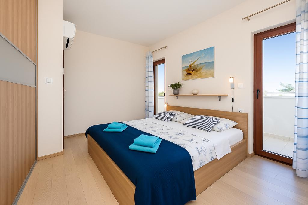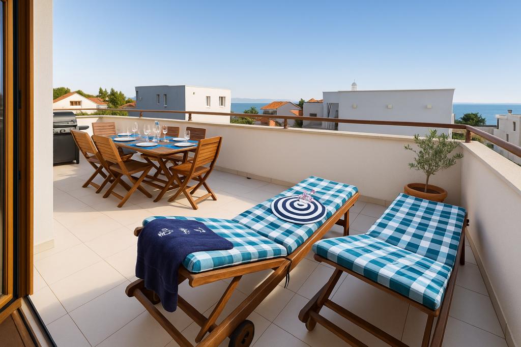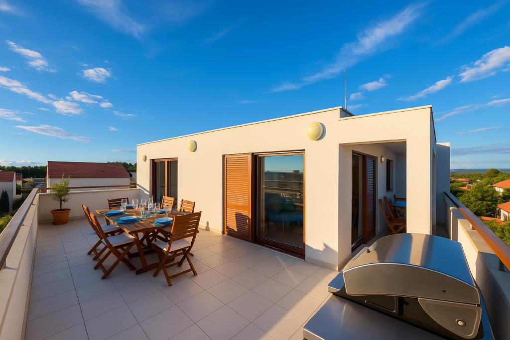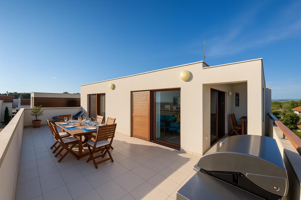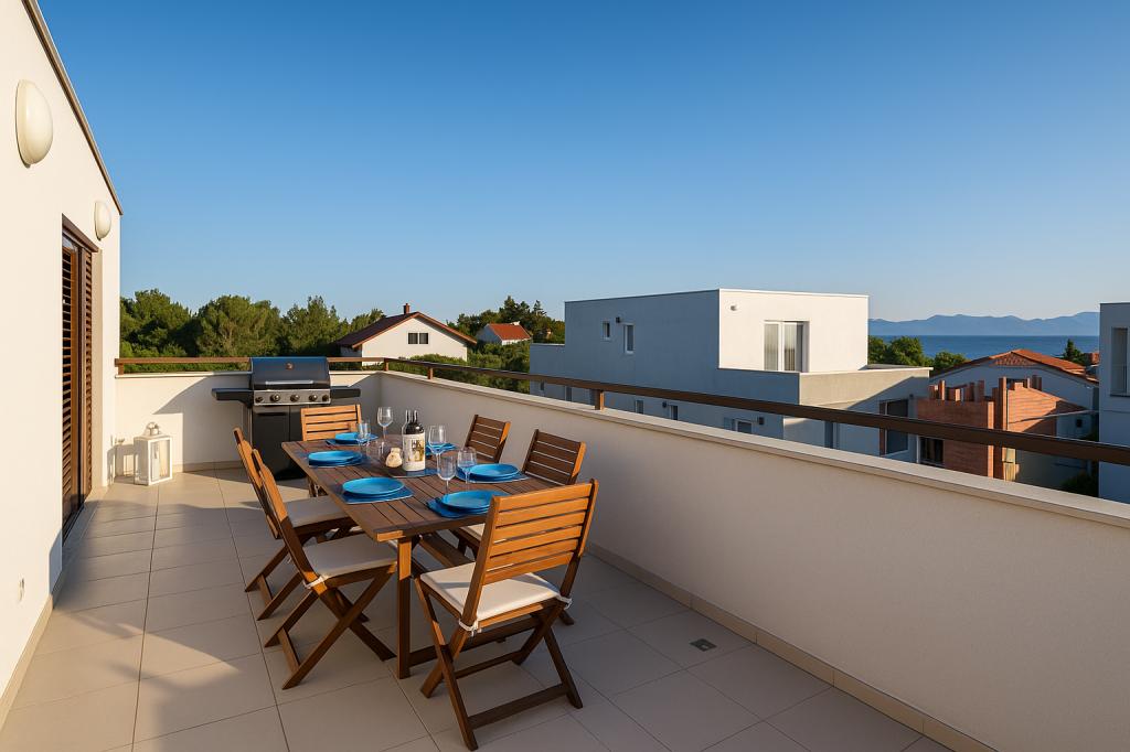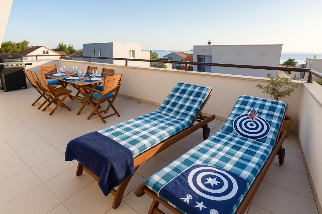 Aquamarine Deluxe Penthouse Apartment is located in Petrčane, just 150 m from Pineta Beach and 250 m from Punta Radman Beach. It features a spacious terrace with partial sea view, a BBQ, free WiFi, and private parking. The apartment includes 3 bedrooms, a modern bathroom, a living room with a sofa and flat-screen satellite TV, and a fully equipped kitchen with a dining area, towels, and bed linen. Only 200 m from Petrčane bus stop and 23 km from Zadar Airport (airport transfer available at an extra charge). Perfect for families or groups of up to 6 guests seeking comfortable and stylish seaside accommodation.