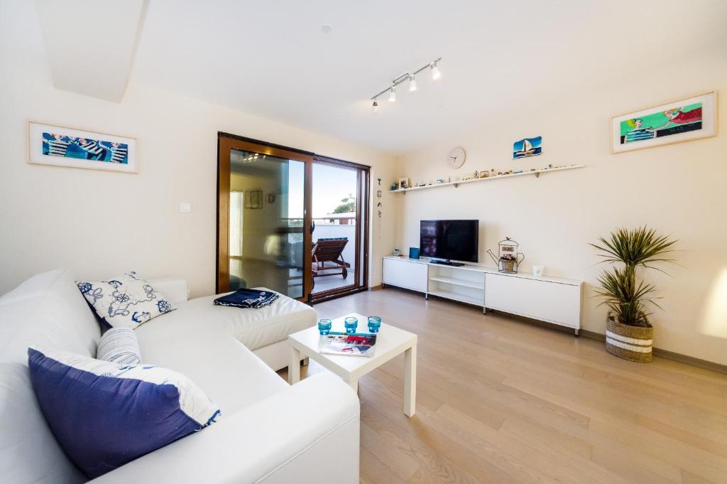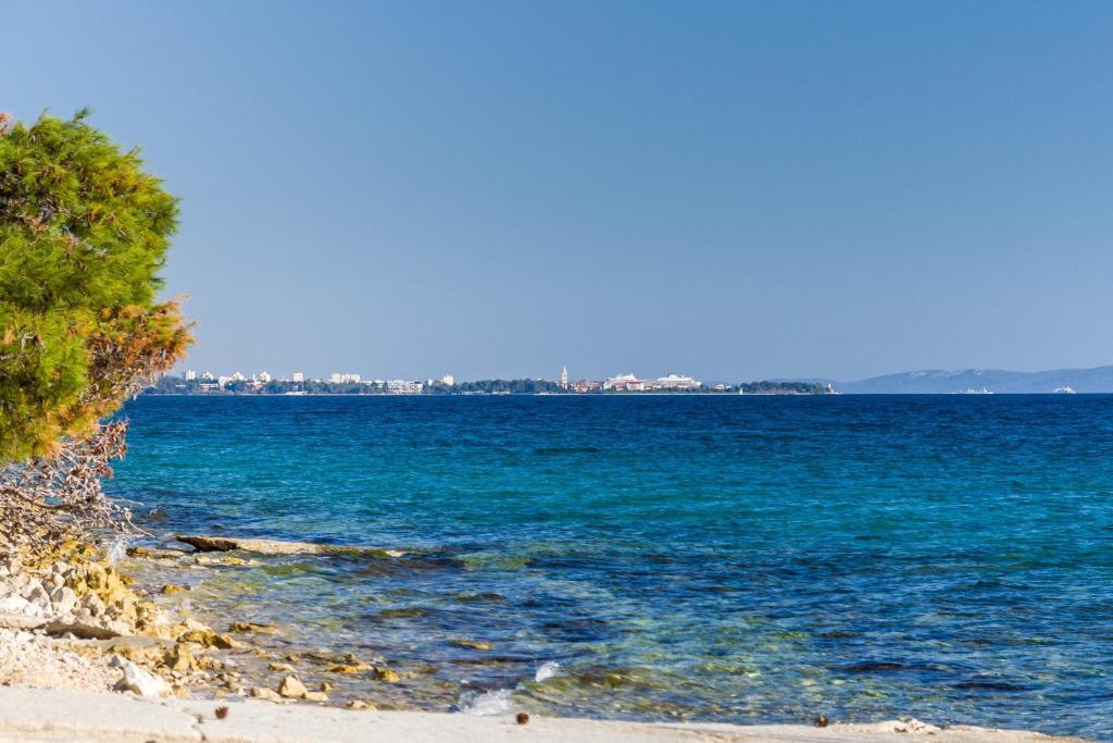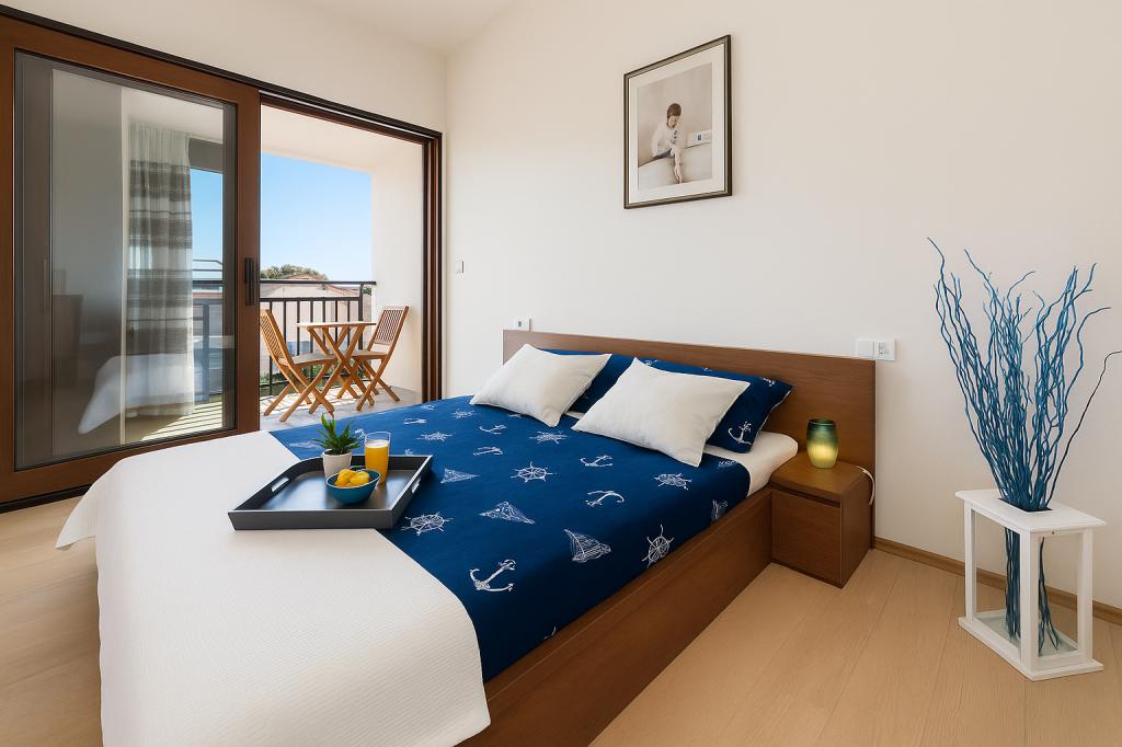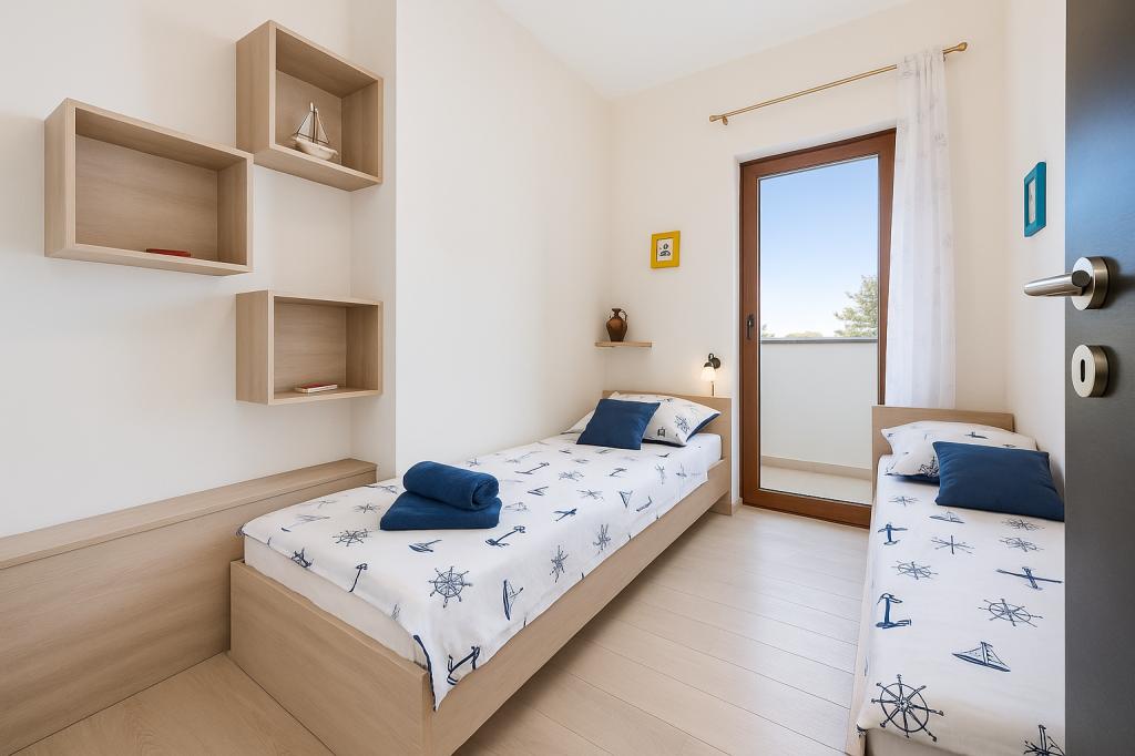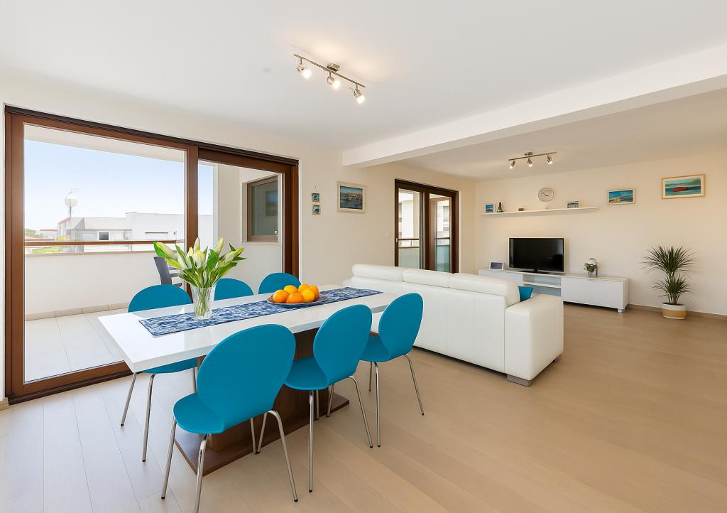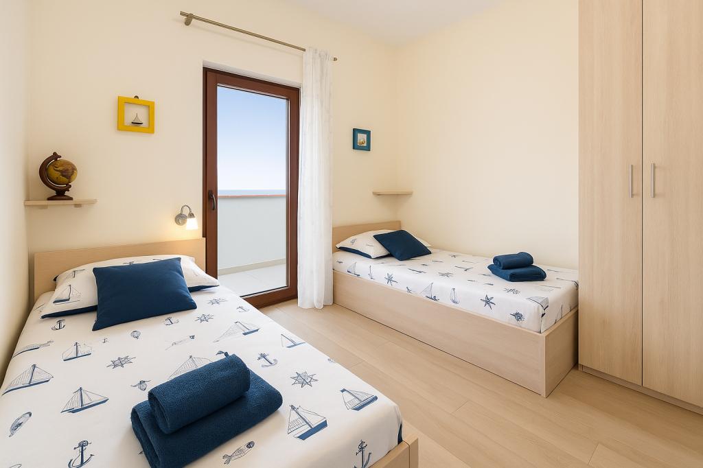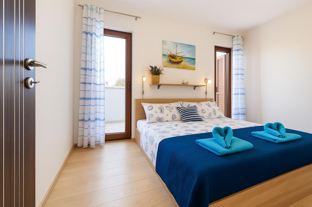 Aquamarine Deluxe Penthouse Apartment is located in Petrčane, just 150 m from Pineta Beach and 250 m from Punta Radman Beach. It features a spacious terrace with partial sea view, a BBQ, free WiFi, and private parking. The apartment includes 3 bedrooms, a modern bathroom, a living room with a sofa and flat-screen satellite TV, and a fully equipped kitchen with a dining area, towels, and bed linen. Only 200 m from Petrčane bus stop and 23 km from Zadar Airport (airport transfer available at an extra charge). Perfect for families or groups of up to 6 guests seeking comfortable and stylish seaside accommodation.