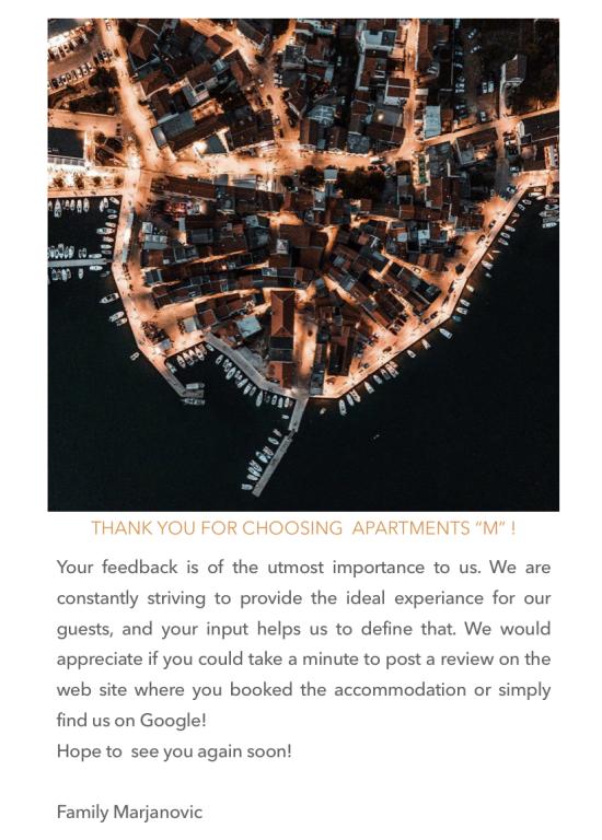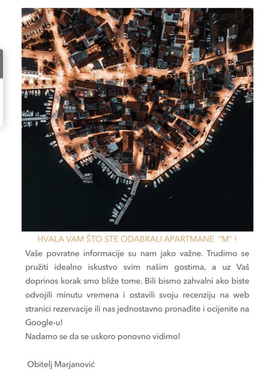 Residential tax is included in price. Booking confirmation document upon reservationDear guests, we would like to inform you that in this unusual situation that has caught us, we have taken all the measures prescribed by the Expert Staff. We are sure that you have prepared yourself according to the advice of the profession so that your vacation can be carefree. In case you are still prevented from arriving at the agreed time, we will be happy to agree with you to change the reservation date. The amount of the advance that you have paid will be stated on the voucher that you can use during your future stay. We are still at your disposal for any additional agreements. With the wish that all the following days pass as carefreely as possible for us, we welcome you to Apartments M, Pirovac