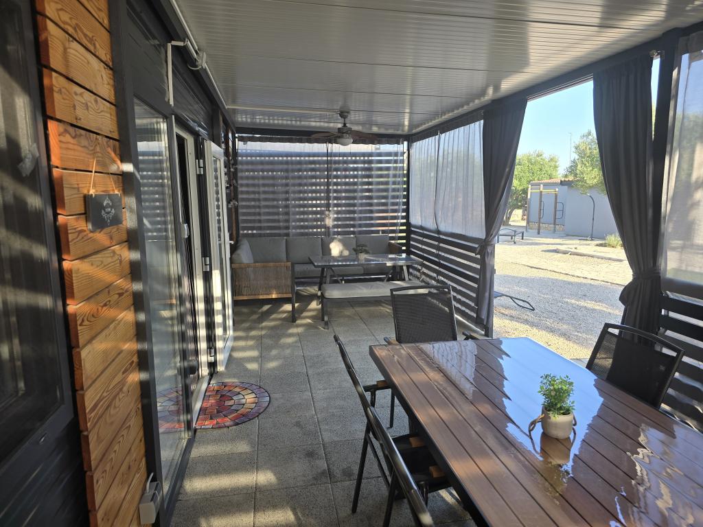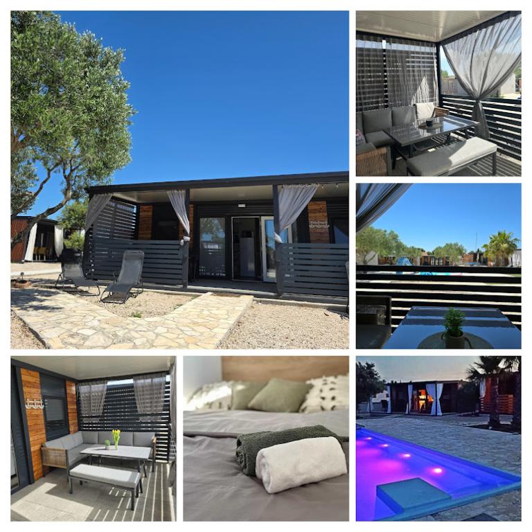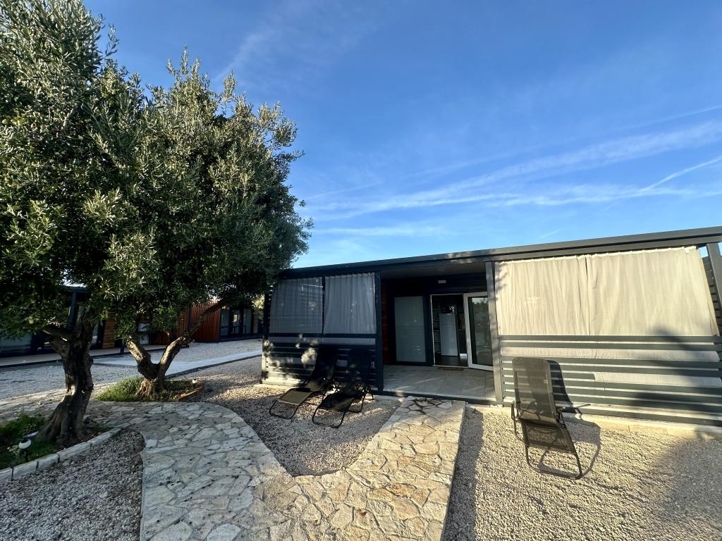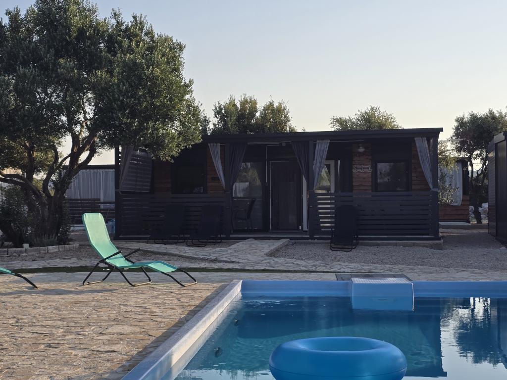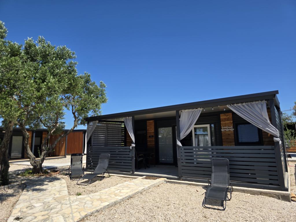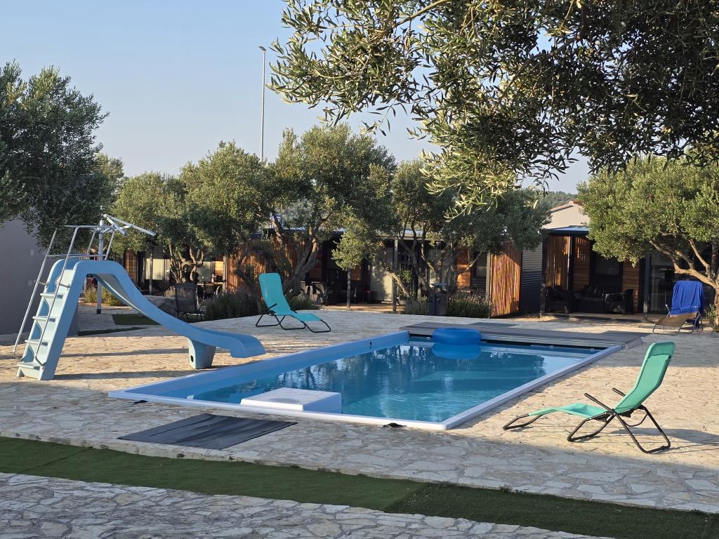 Mobile Home Maslina – Your peaceful oasis by the sea. Welcome to Mobile Home Maslina, a modernly decorated mobile home located in a quiet part of Pirovac, just 200 m from the beach. The house accommodates up to 5 people and has two bedrooms with a total of 4 beds, a living room with a sofa bed, an equipped kitchen and a bathroom. Enjoy the large covered terrace overlooking the pool – perfect for morning coffee or evening relaxation. Guests also have access to a parking space. Mobile Home Maslina is ideal for a family vacation, peace, nature and proximity to the sea. Experience the hospitality of Dalmatia and book your vacation today!