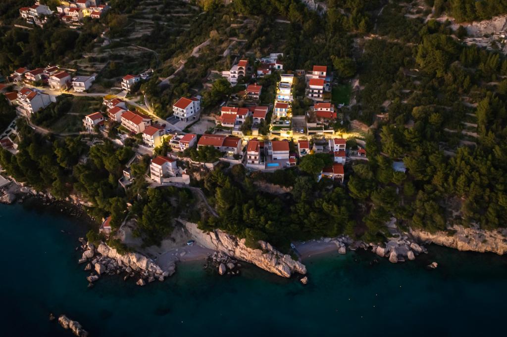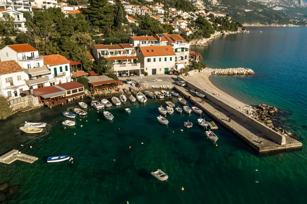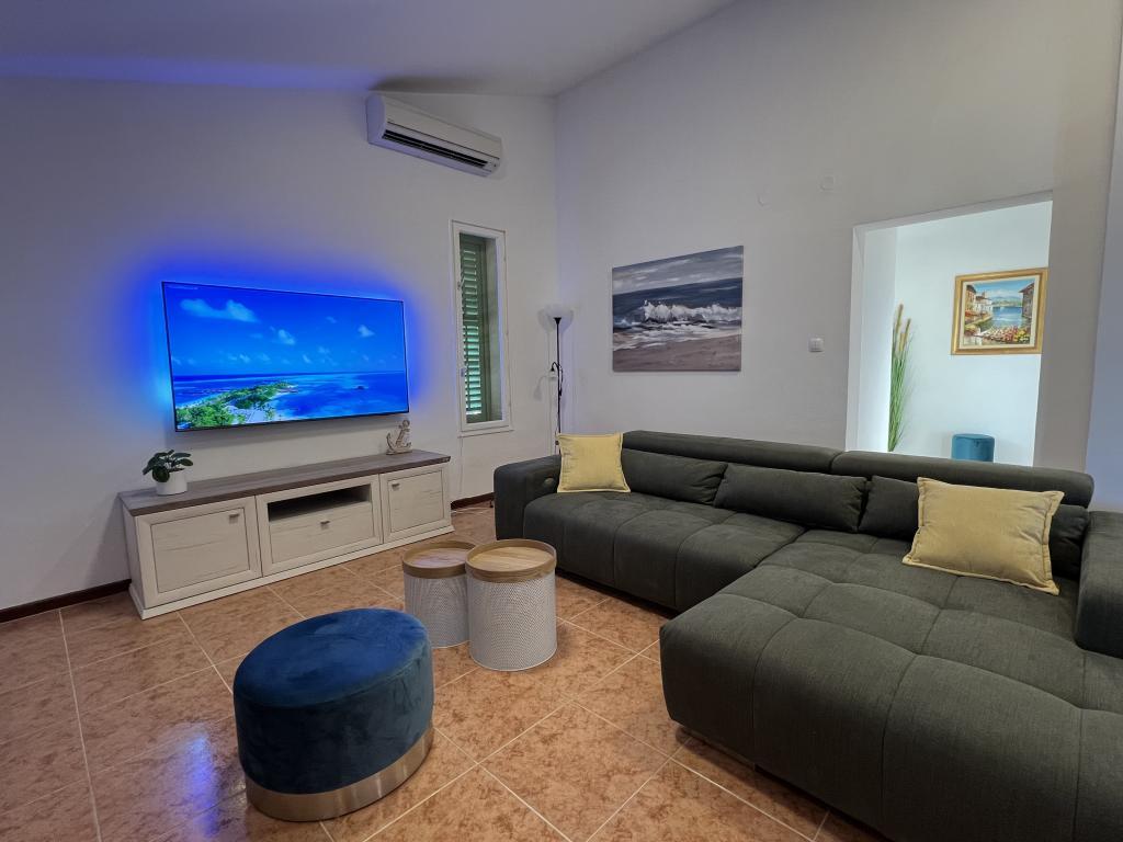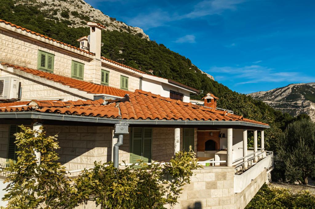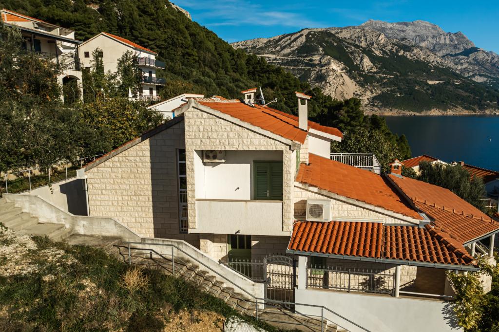 The idyllic Dalmatian Villa Stina is located in a quiet part of the fishing village of Pisak on the Omiš Riviera. The property is located 70 m as the crow flies from the sea, and offers a perfect vacation for 8 people who can be accommodated in 3 bedrooms equipped with spring box beds and one additional sofa bed for two people. All rooms and rooms in the house are air-conditioned with separate air conditioners. The house offers comfortable accommodation in a large living room that is connected to the kitchen with a spacious outdoor terrace overlooking the sea. The sea view is also offered from the superior room with a balcony. The remaining two rooms have an intimate view of the outdoor garden on the north side of the property. There is an outdoor barbecue at the back of the terrace. Free parking for 4 cars is located in front of the house and provides comfortable access for guests with luggage. The house is a few minutes walk from two beautiful natural pebble beaches. The distance from the town center and local shops is about 10 minutes walk.