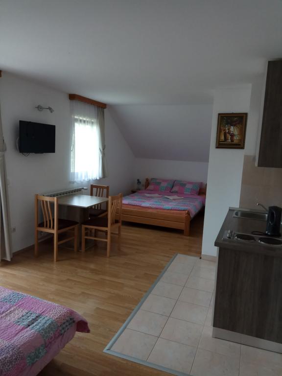 Apartments Dale are located in the quiet village of Smoljanac, only 7 km from the Plitvice Lakes. Studio apartments contain a room with 1 double bed and 1 sofa bed, and are suitable for families with two children, bathroom with shower, kitchen and satellite TV. Free internet access is available throughout the facility. Parking is included in the price and is located in front of the house. In these apartments you will discover a unique atmosphere and a place where you will spend your time wonderfully, enjoy nature and relax. In winter it is suitable for sledding and in summer for swimming in the Korana river. In addition to the Plitvička Jezera National Park, there are also the Barac Caves and Rastoka near Slunj.