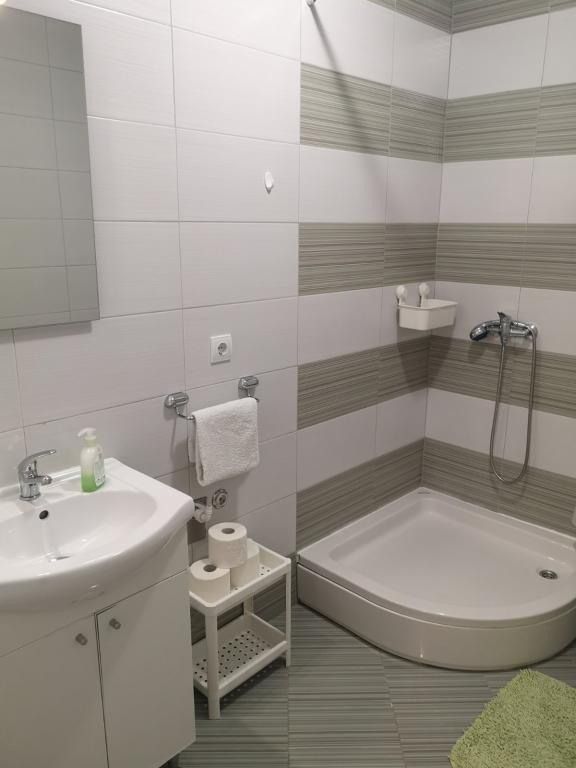 We just spend here 6 days of our holiday in Podgora. The apartment is on the last floor with nice view over the town of Podgora with sea view. There is a shady private parking place about 50m from apartment. Although there is wharf road behind building it's very quiet place. The apartment is very cosy, bright and clean. Bathroom is big and fresh. Simply but modern. The owners are helpfull and kind. You need less than 10 minutes to get to the beach or promenadę of Podgora from here. I recommend this apartment to everyone!