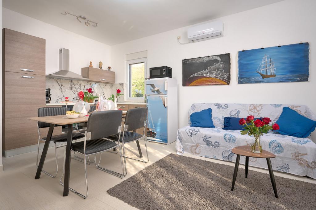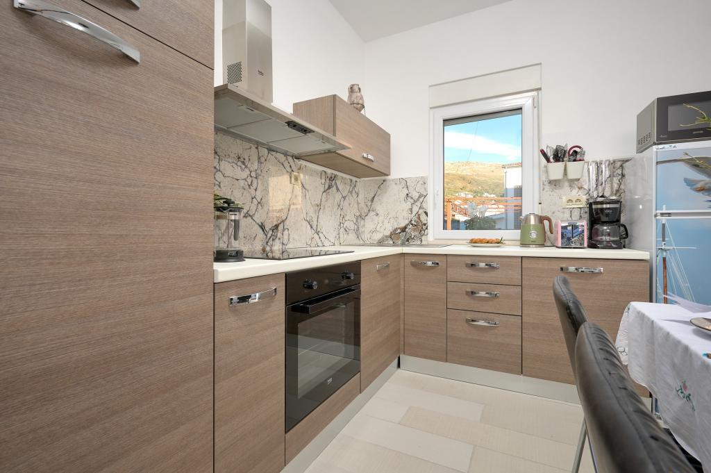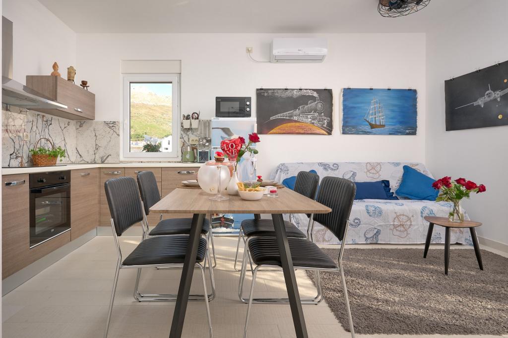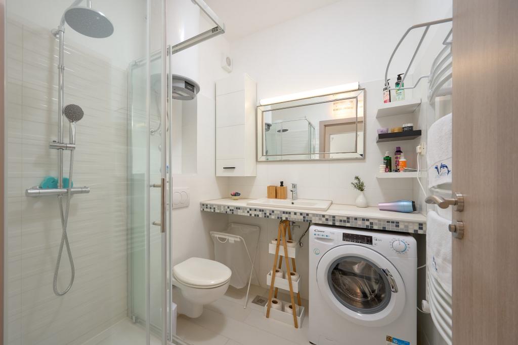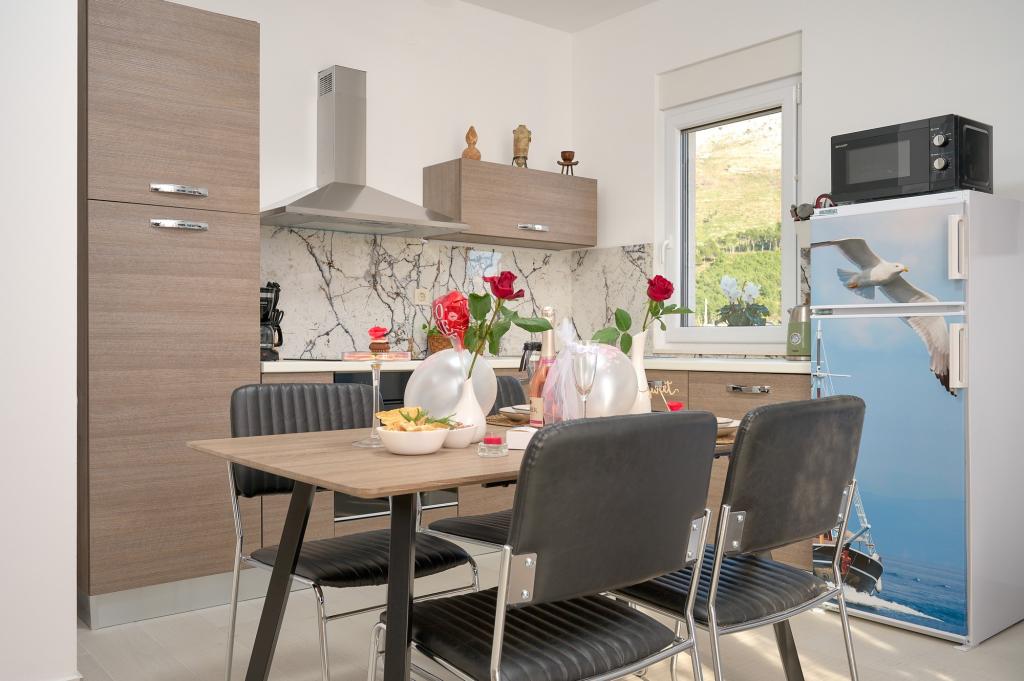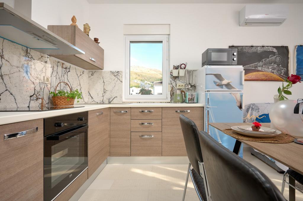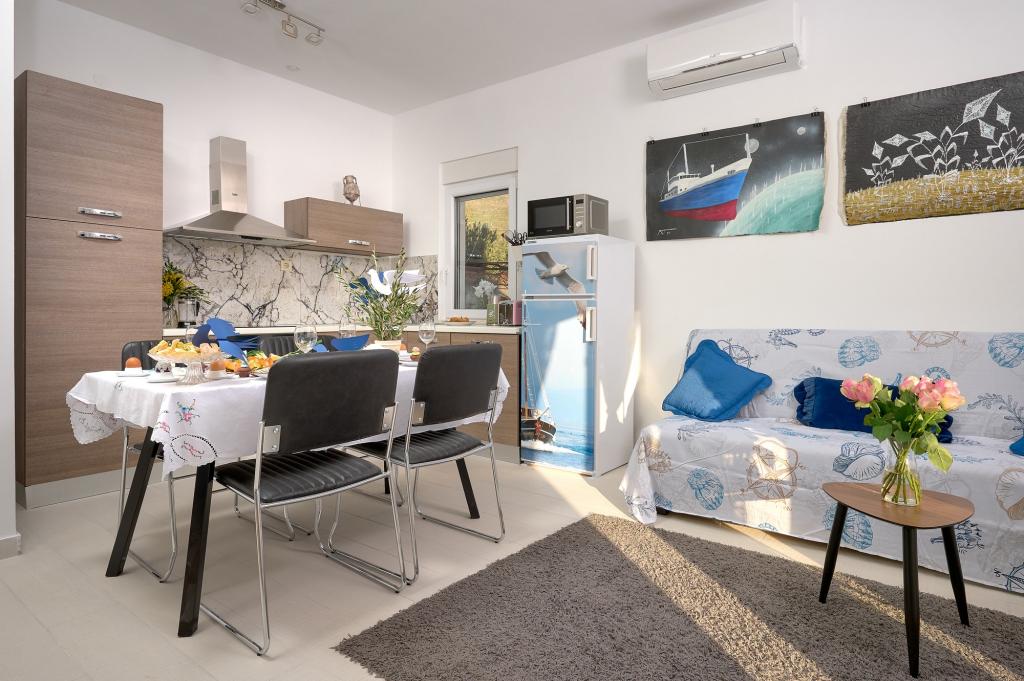 Three newly renovated apartments "Sita" are located in Podstrana, right next to the sea. This seaside oasis, which boasts pristine beaches and crystal clear sea, is the perfect destination for families and all those looking for a peaceful haven in a small town with the excitement and cultural richness of nearby Split. Each of our apartments exudes airiness and comfort, offering two bedrooms, a modern bathroom, a functional kitchen with an integrated living room, and a private balcony with a view of the sea. For your undisturbed vacation, each apartment is carefully designed and equipped with modern facilities: air conditioning, WiFi, TV. Car parking is within the property, while the proximity of restaurants, shops, pebble beaches and sports fields offers countless opportunities for exploration and activities.