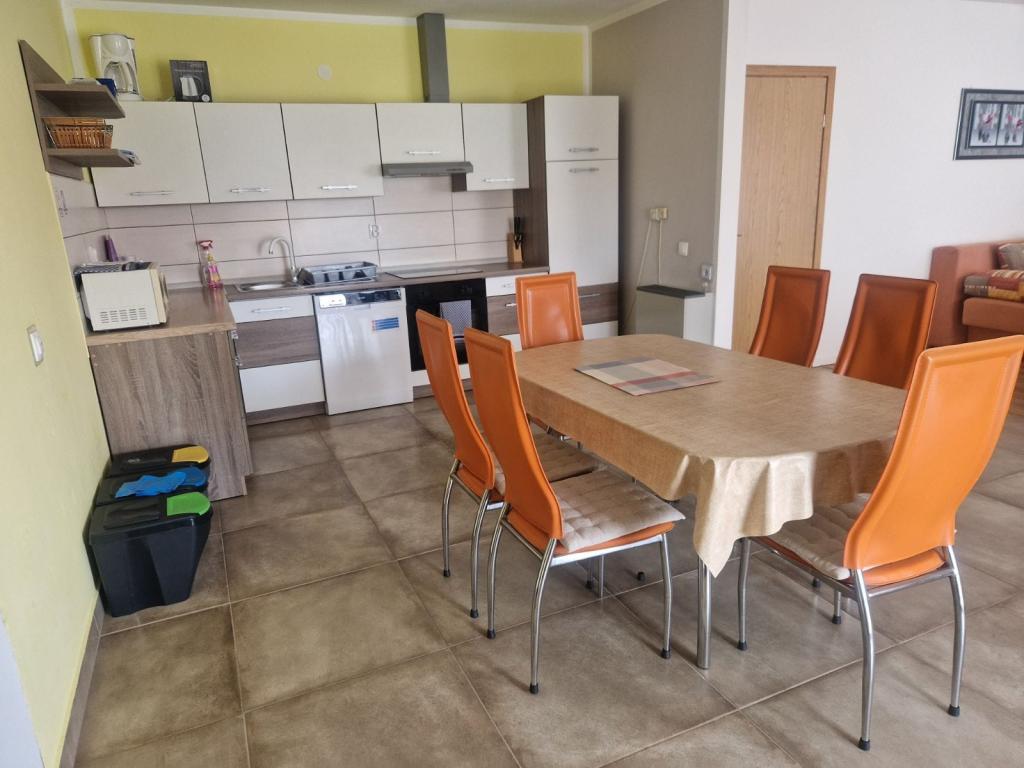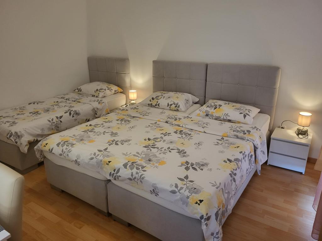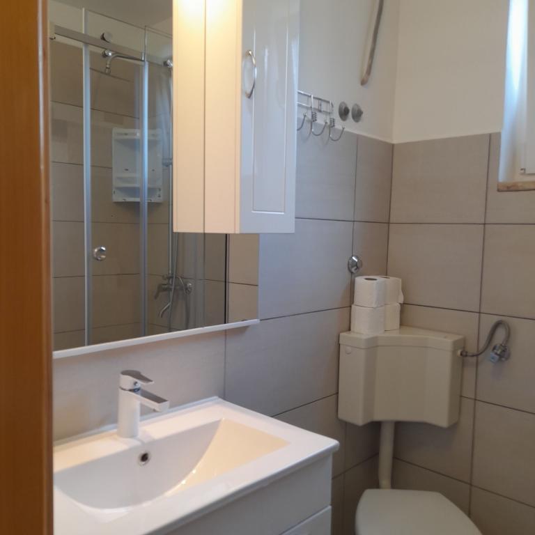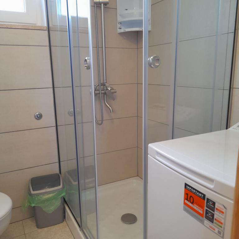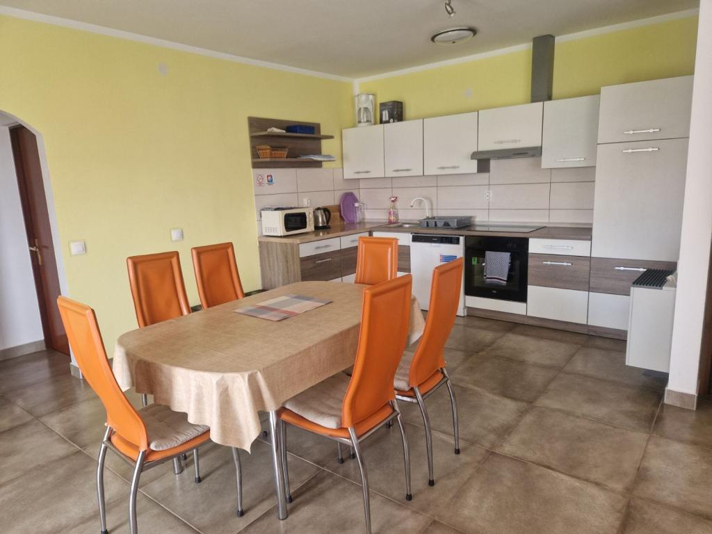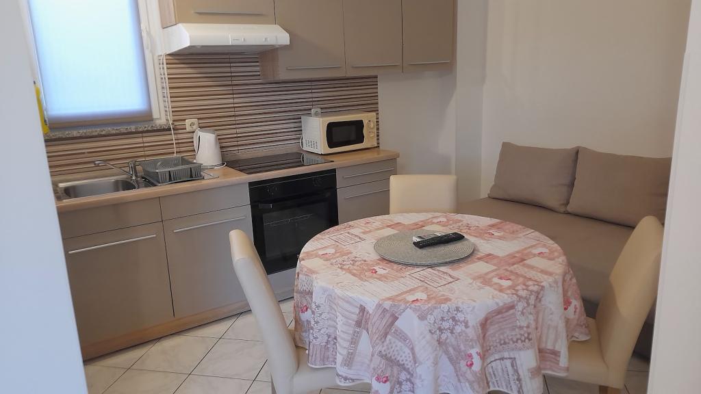 Property description Unit description A1 - this apartment is located at the same entrance and on the same floor as the 2-bedroom apartment, so it is ideal if a group of ten people is coming. When entering this apartment, you have a living area with TV/SAT. From it you enter a double bedroom as well as a second walk-through room. The hallway leads straight to the kitchen, bathroom and third bedroom which has access to the terrace. The apartment is designed for 6 people. Terraces: 1 Balconies: 1 Living room with kitchen: 1 Bedrooms: 3 Bathroom: 1 Apartment area: 75 m² A2 - this apartment is located at a separate entrance on the first floor. The large living room with dining room and kitchen has access to a terrace facing southwest. A bedroom with a double bed and a small room with two separate beds as well as two sofa beds in the living room allow a comfortable stay for a larger family of 4-6 people, as well as younger people. Terrace: 1 Balconies: 1 Living room with kitchen: 1 Bedrooms: 2 Bathroom: 1 Apartment area: 85 m² A3 - apartment also on the ground floor with a terrace. It has one triple room, and a kitchen with TV/SAT and a sofa bed, a shower bathroom. Ideal for a couple with 2 small children. Terrace: 1 Living room with kitchen: 1 Bedroom: 1 Bathroom: 1 Apartment area: 35 m² A4 - Studio apartment is located on the ground floor and has access to a terrace. It consists of one space that has a mini kitchen, a sofa bed for 2 people, TV/SAT and a shower bathroom. Ideal for a younger couple. Terrace: 1 Living room with kitchen: 1 Bathroom: 1 Apartment area: 24 m2 Special discounts are available for guests who stay with us for longer than 14 days. All pets are allowed. Nearby: beach - pebble, beach - pebble and sandy, beach - nudist beach Amenities within the accommodation: internet, wi-fi, parking by the property, barbecue area Children: swing, cot Meal: breakfast, meals not included Services: laundry, calling a taxi service Kitchen: electric oven