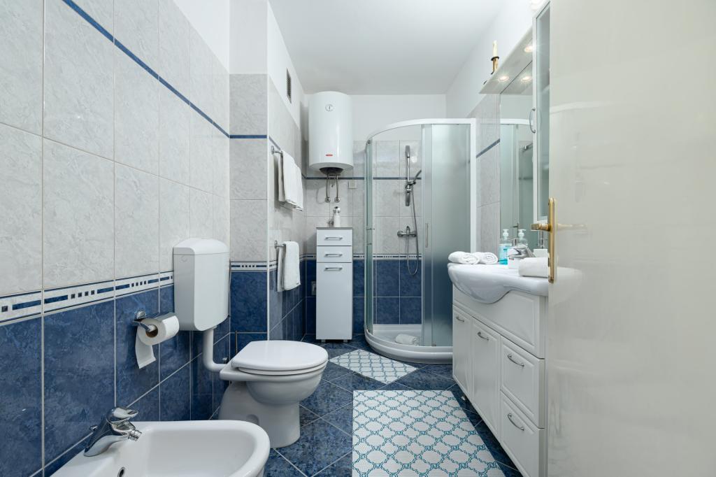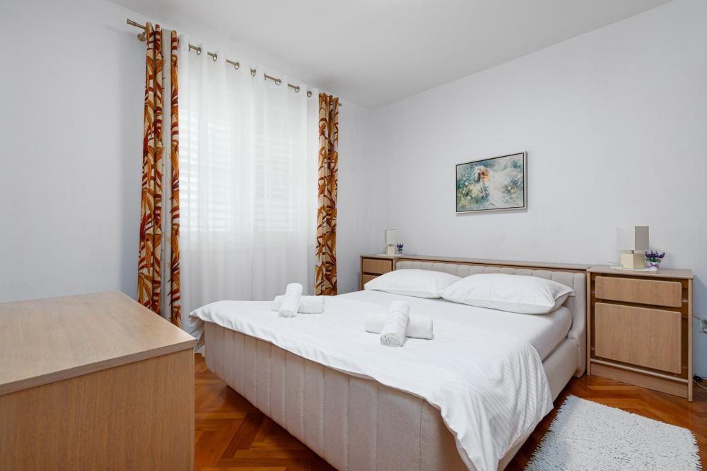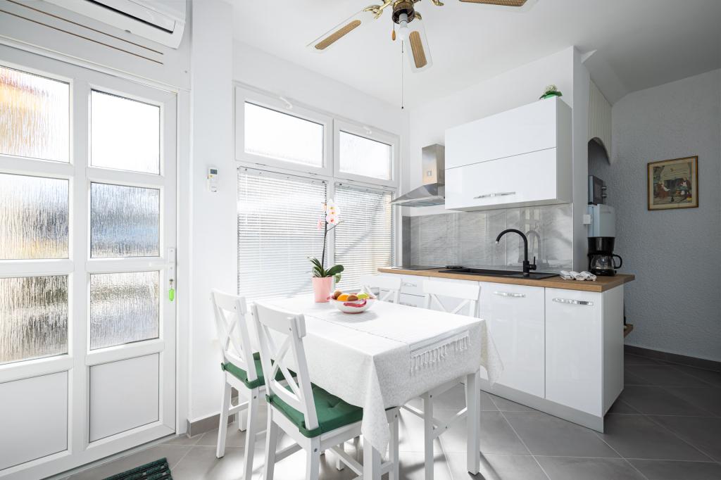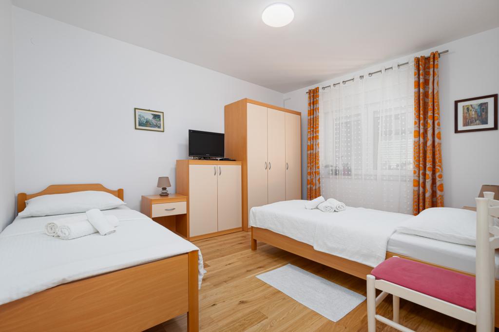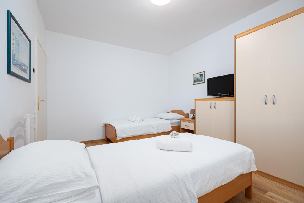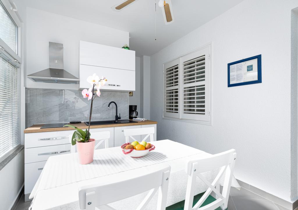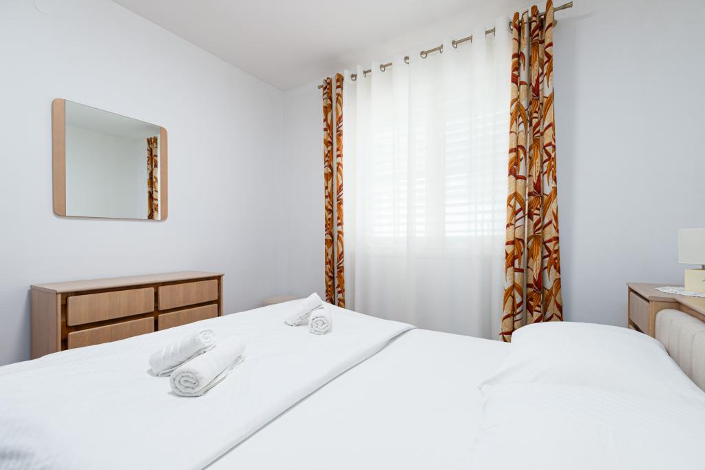 The apartment is tastefully furnished and can accommodate up to four people. It consists of a living room, a fully equipped kitchen, a dining table, one double bedroom with a double bed, and one bedroom with two single beds with a flat-screen TV, and a bathroom. In front of the apartment, in a very pleasant atmosphere, there is a seating area. The rental price of the apartment includes the use of: bed linen, towels, Wi-Fi, and air conditioning.