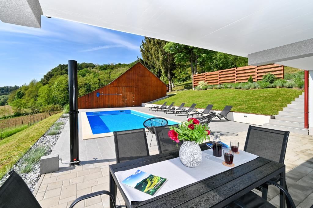 This incredible house is located on one of the many hills of beautiful Zagorje. Surrounded by hills, vineyards, orchards and forests, it is an ideal place to enjoy and rest in nature. The wonderful view that stretches allows you to enjoy beautiful sunrises, which is what the house got its name from. Sunrise Hill is categorized with 4* and provides comfortable accommodation for 8 people, and is primarily oriented towards families with children. It is perfect for a quiet vacation or socializing, but also for recreation and sports. In addition to the landscaped garden, which offers a large swimming pool with a shower and a covered and open terrace, a barbecue, a play house, parking, the house is decorated with a meticulously decorated interior dominated by wood and bright and calming tones. The house consists of a ground floor with a spacious living room with kitchen and dining room, a bathroom, a children's playroom with table football, a PS 4 game console and board games, and a spacious terrace that invites you to rest and socialize. There are three bedrooms on the first floor of the house.