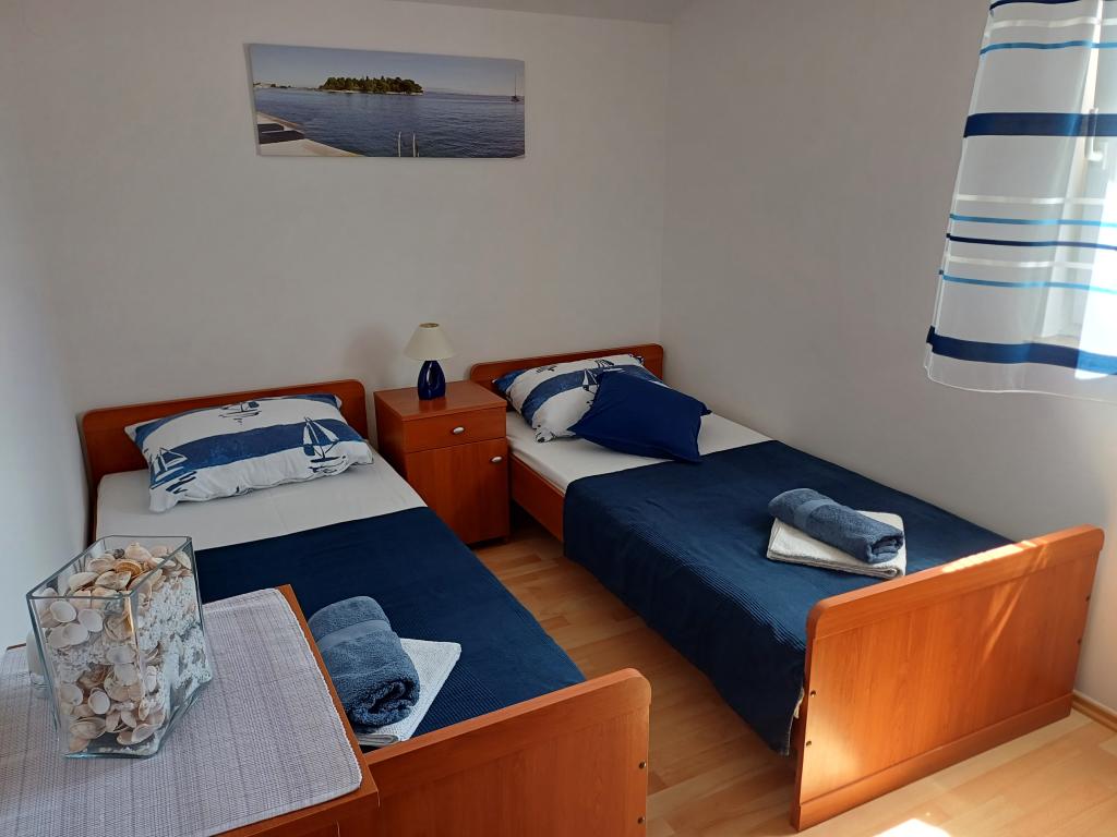 With a view of the city of Zadar, the distant peaks of Velebit and the islet of Galevac, and located in front of the sandy beach of Jaz in the town of Preku, apartment Mirjam offers comfortable and warm accommodation for families with children, seniors who like walks by the sea, lovers of cycling paths or lovers of tour of the Zadar archipelago with a rented speedboat. Apartment Mirjam is located in a building that is only 5 min. away from the beach, where refreshments are offered by several terraces of cafes and restaurants by the sea. It only takes 12 minutes to get to the city center. easy walks. The guest can fulfill his needs by visiting the market, tavern, restaurant, bakery and Tommy supermarket. Multiple daily boat lines between the town of Preka and the city of Zadar will allow you to visit the historical values of the city, enjoy listening to the SEA ORGAN, send a SALUTATION TO THE SUN, and a good night's entertainment will complete your vacation. Apartment Mirjam on 54 m2 has a living room with a kitchen, a hallway, two bedrooms, a bathroom with a toilet and a terrace.