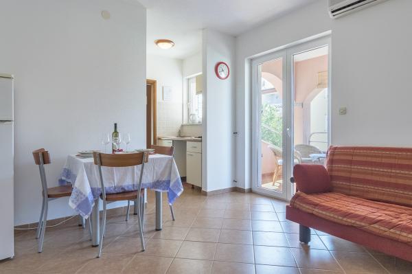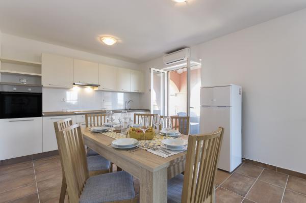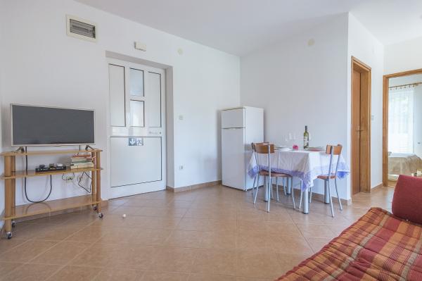 The accommodation is close to the entrance to the national park, approx. 200m in a quiet street. Apartment A4 has two bedrooms and two terraces. One with a view of the sea and an afternoon in the shade. Large spacious kitchen connected to a large living room. Bathroom, shower, washing machine.. The whole apartment has a nice breeze, so the climate is perfect in the evening, when the mosquitoes fly in.. The kitchen is fully equipped and newly furnished, except for the microwave oven. Nothing is missing. Smart TV, internet, all working. Beautiful view from the terrace to the sea. Clean, spacious, very friendly owners. Distance to the center 200-300m. To the beach in the camp approx. 400m. Beaches in Kameniak approx. 500-4000 m. Some for walking, some by car or bike. Everyone will surely find their own here..There is nothing to complain about. Just superlatives. We would love to come back. There are still a few beaches to explore...