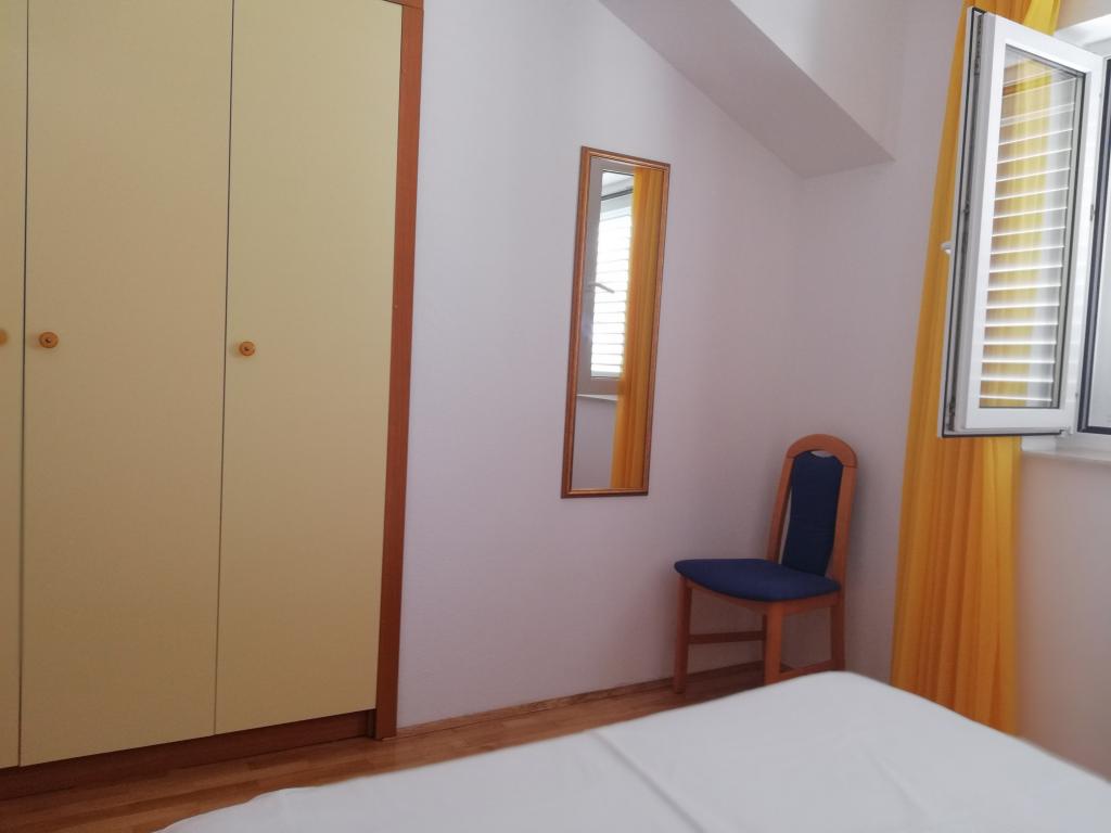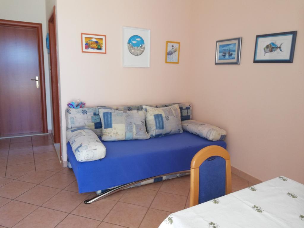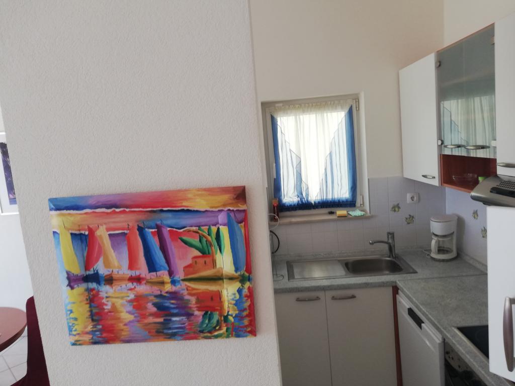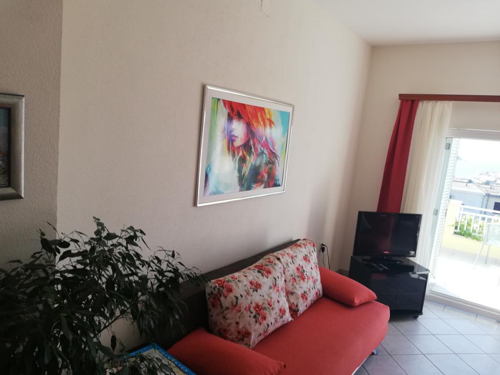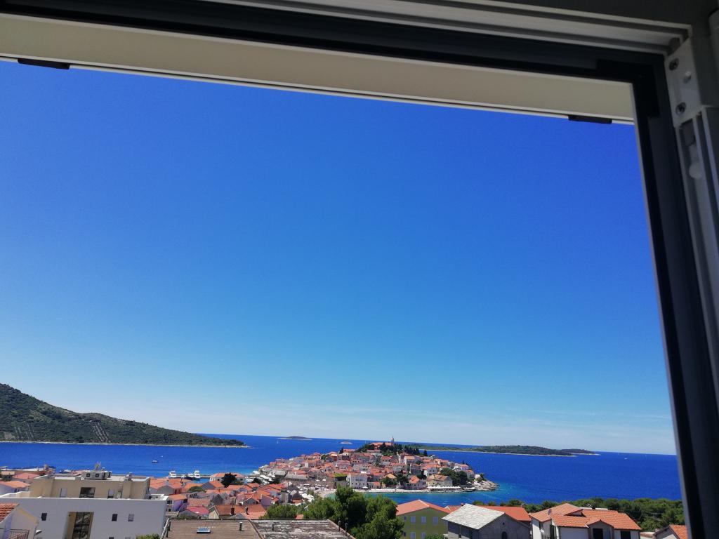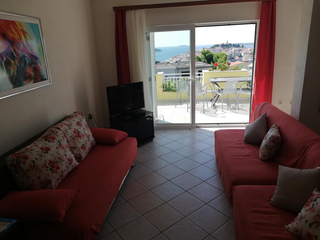 Comfortable and nicely decorated apartment, located on a small elevation above the road in the Primo puppy. The apartment and terrace offer a beautiful view of the sea and the old town. It is only 8min walk from the beach, also from the town center. The apartment consists of one bedroom for two persons, kitchen with living room, bathroom and terrace. In the living room there is a sofa bed for two people. Suitable for married couple with small children. The apartment is located on the 1st floor.