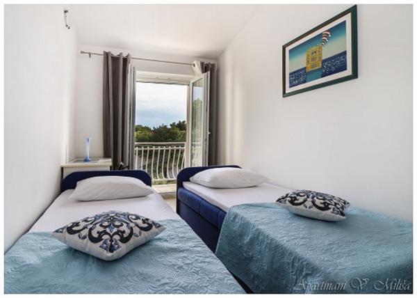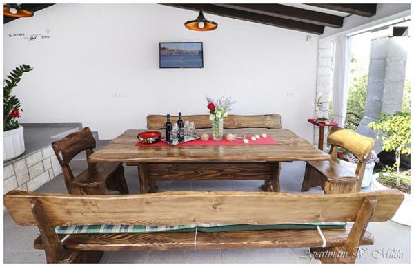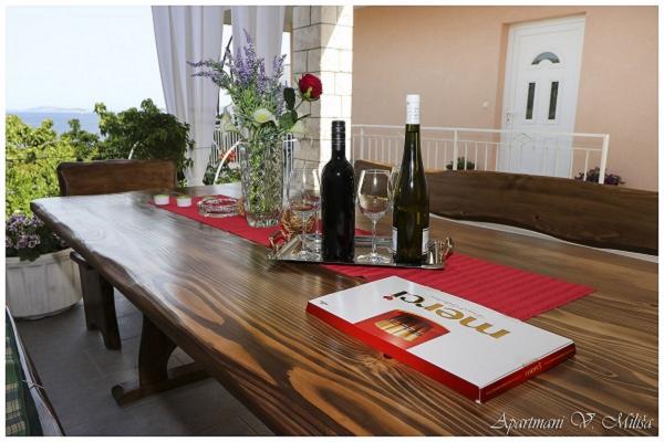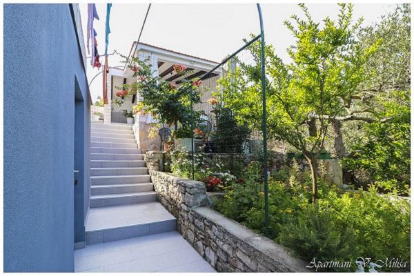 Welcome to Miliša-Vesna apartments! Enjoy the peace and beauty of our beautiful Primosten! Apartments Miliša are located in a quiet part of Primosten. 100 meters from the pebble and rocky beach and 600 meters from the center which can be reached on foot in 8 minutes. Our apartments can accommodate from 2-16 people. Each apartment is equipped with satellite TV, air conditioning and wifi. Each apartment has parking in the yard. You have a barbecue in the garden with a large shared terrace. Apartments Milisa provide you with a beautiful view from each terrace of our apartment and gives you the opportunity to enjoy the Primosten sunset which is the most beautiful and romantic sunset.