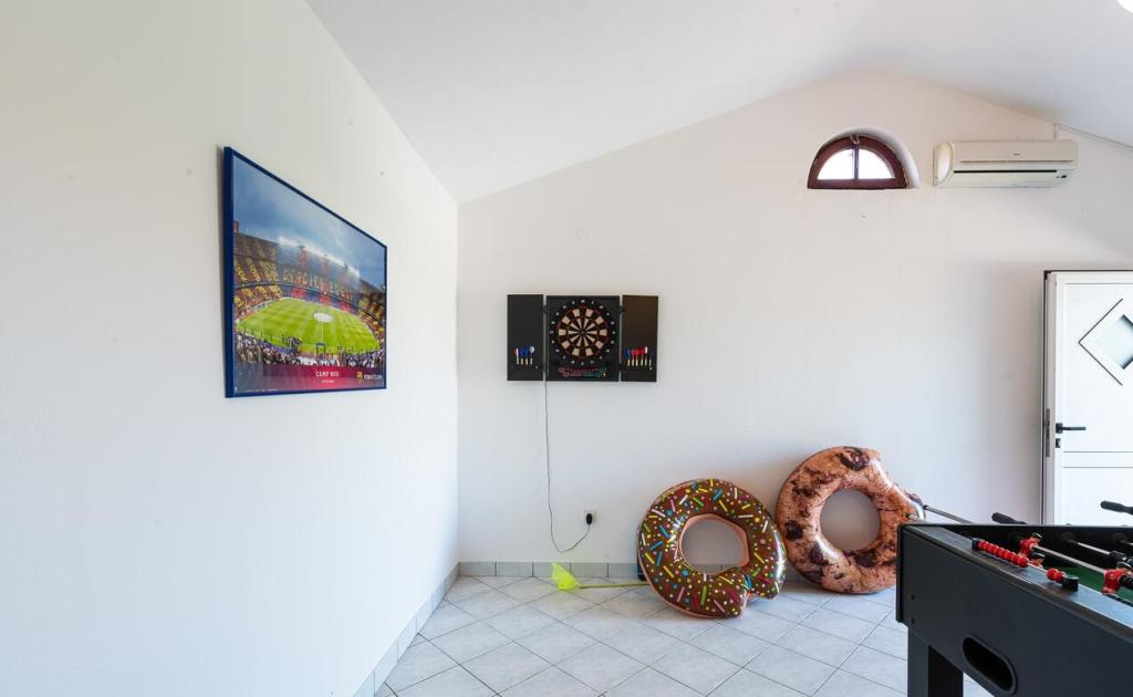 The apartments are located 300 m from the sea. They are located in a quiet place, surrounded by olive trees, swimming pool, jacuzzi, grill, game room with darts and table football. Large yard, fenced...