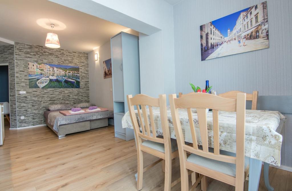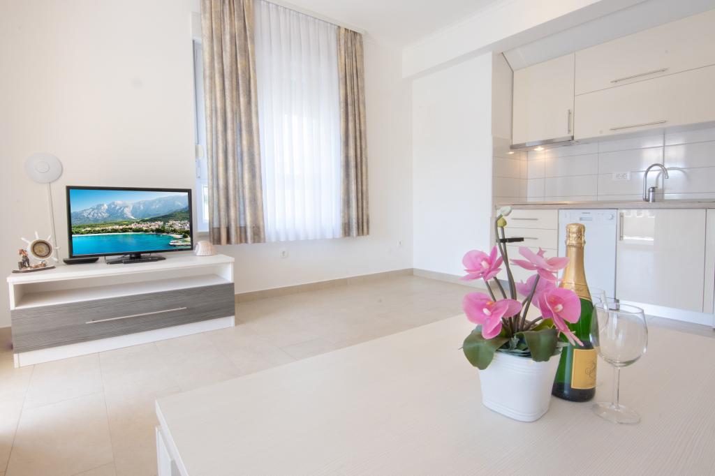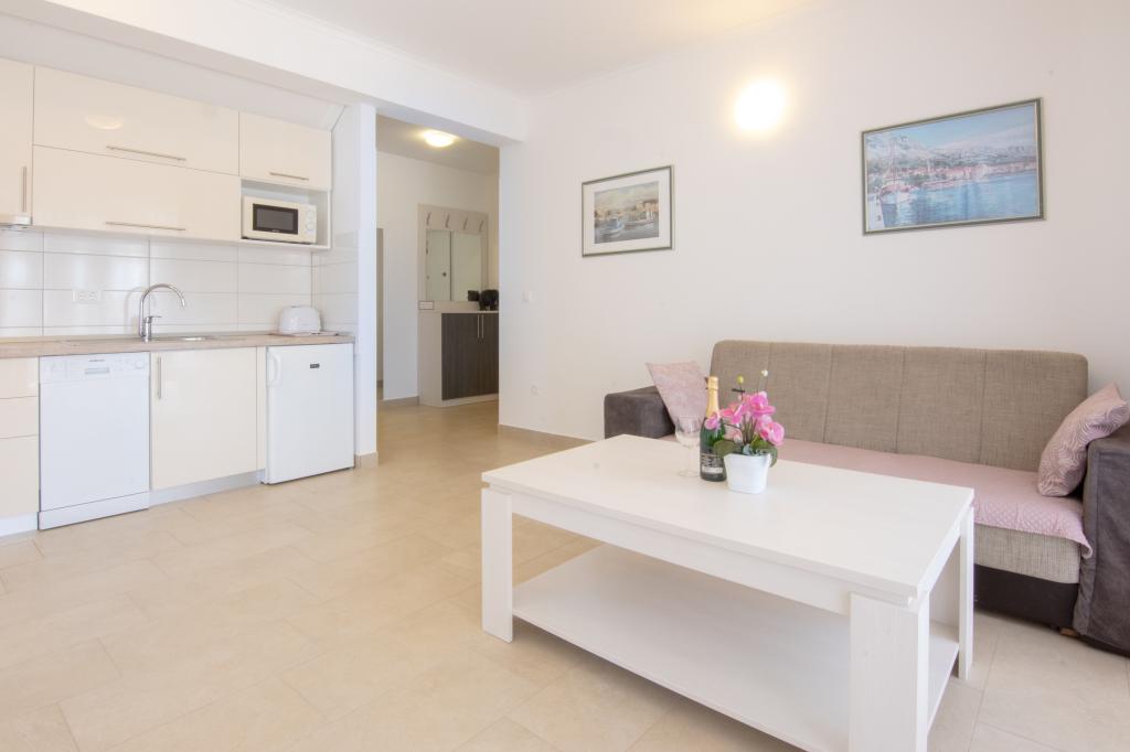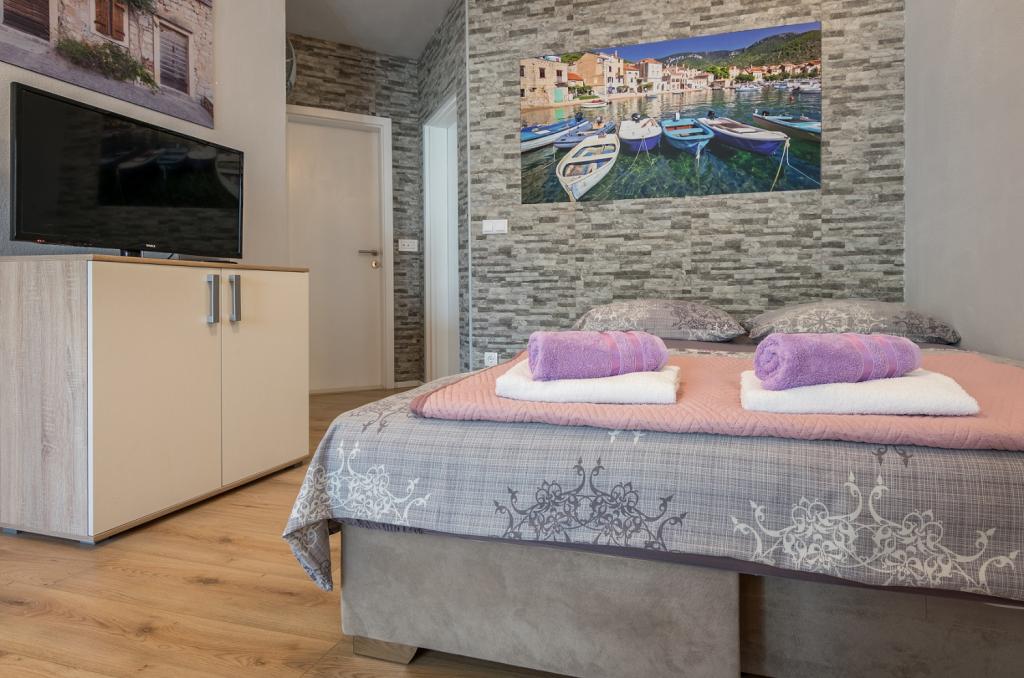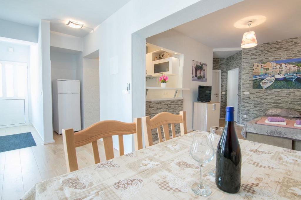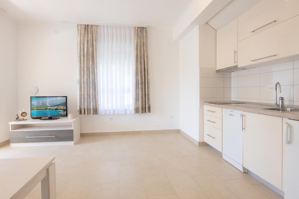 Fully equipped apartments Marinko are located in the center of Promajna, only 30m from the beach and the sea, 100 m from the shop, market and post office. The apartments have their own parking lots located next to the building. The beach has natural shade and small pebbles which is ideal for families with small children.