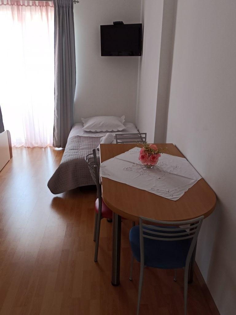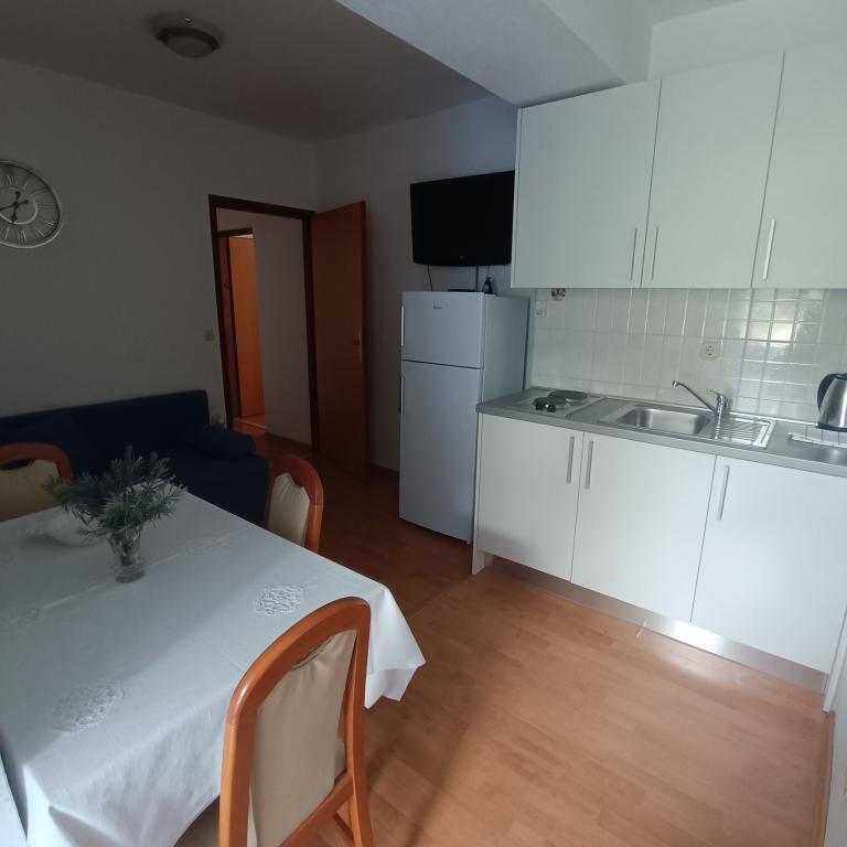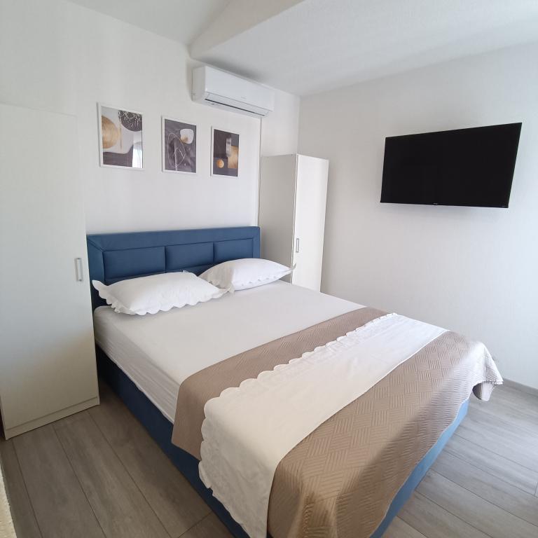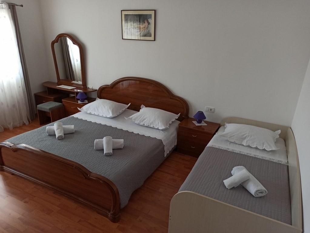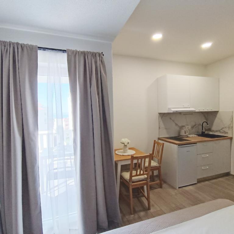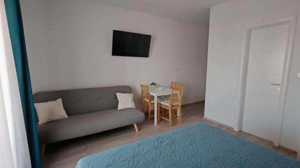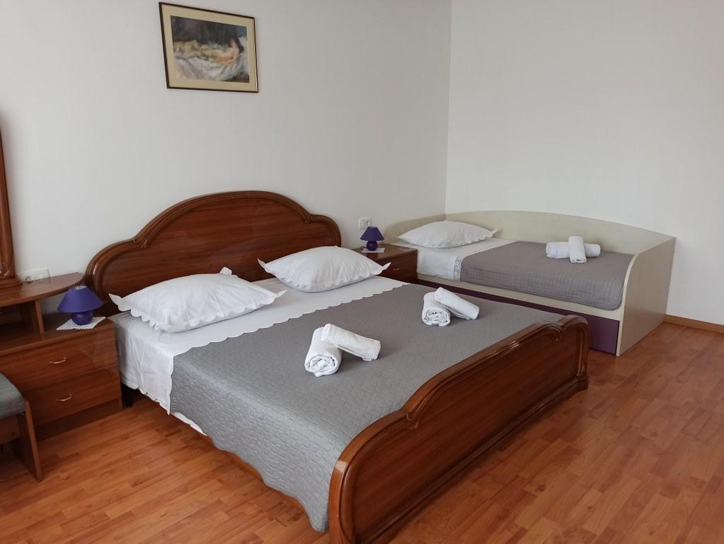 We stayed in a double room with a bathroom, a fully equipped kitchen and a balcony with a side view of both the sea and the mountains. The room was very clean and tidy, without any complaints. The owner was available on site, very communicative and helpful not only in matters of accommodation but also advised where to eat well and cheaply, where to buy the best home-made olive oil, etc. Next year we will definitely come back, this time with friends.