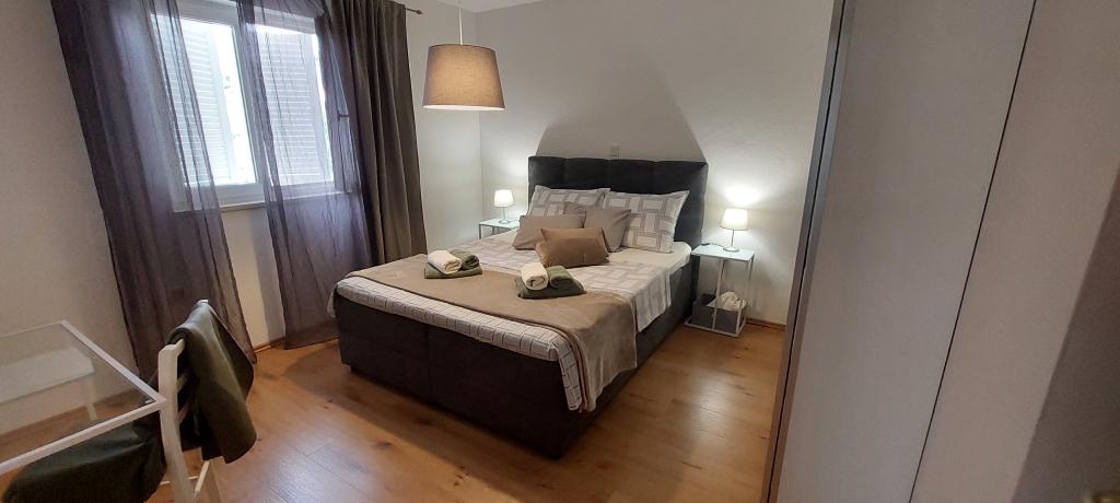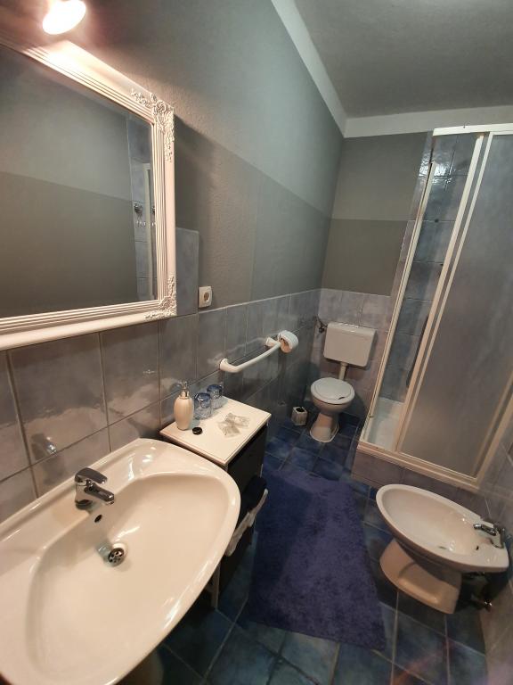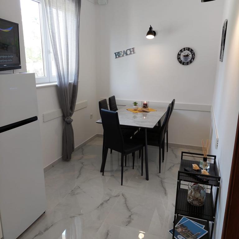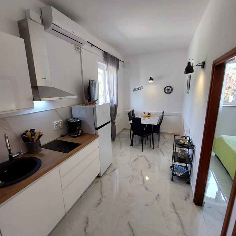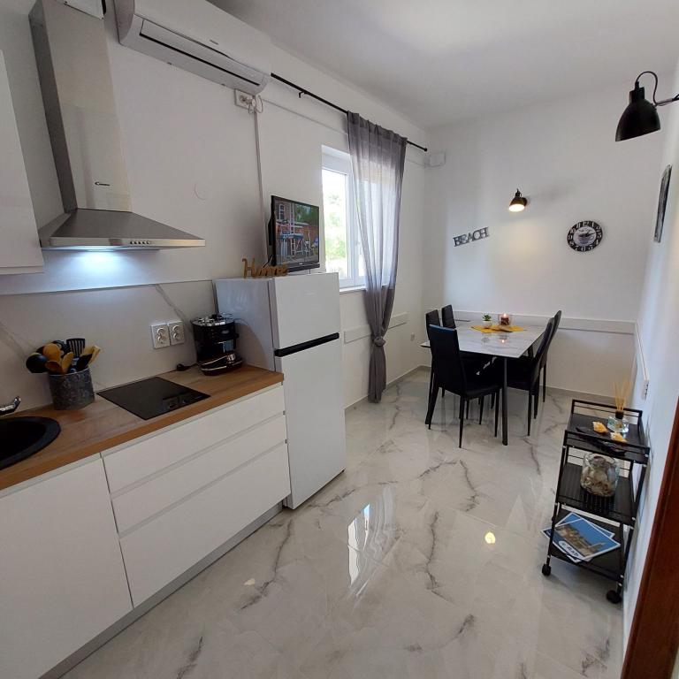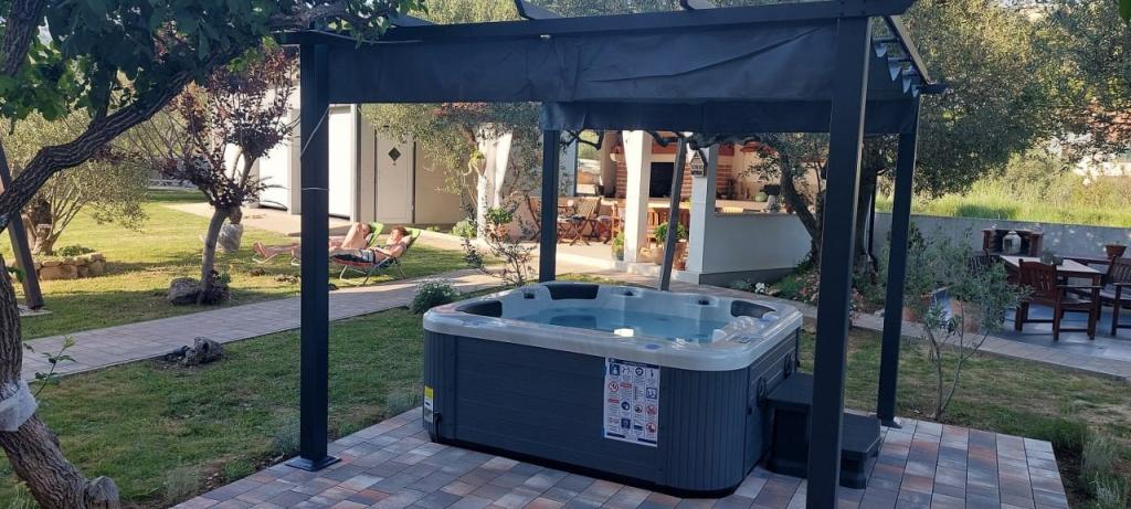 Apartment Villa Ilijic with Hydromassage Pool - Jacuzzi is located 150 meters from the Padova 3 beach in Banjol on the island of Rab. Our Apartment Villa offers air-conditioned apartments with free high-speed wireless internet access available in each apartment. Our large garden is decorated in a way that is pleasant and relaxing with a large courtyard with Hydromassage Pool-SPA - Jacuzzi, paved walkway, terrace with seating, terrace with grill, gazebo with fireplace and outdoor kitchen, giving an additional atmosphere to our Villa in which our tourists can relax and enjoy. Free parking is available within the facility and no reservation is required. Our tourists can also use free deck chairs. All apartments have terraces or balconies. Each apartment consists of an entrance area, kitchen, dining and living area, bedroom, bathroom and toilet, terrace - loggia or balcony. All accommodation units include LED LCD with satellite programs...