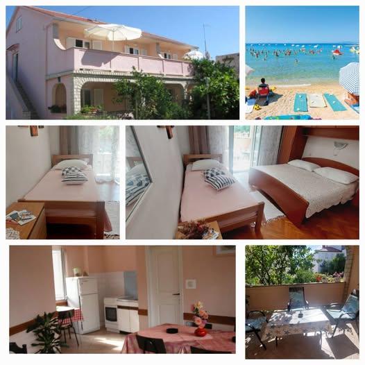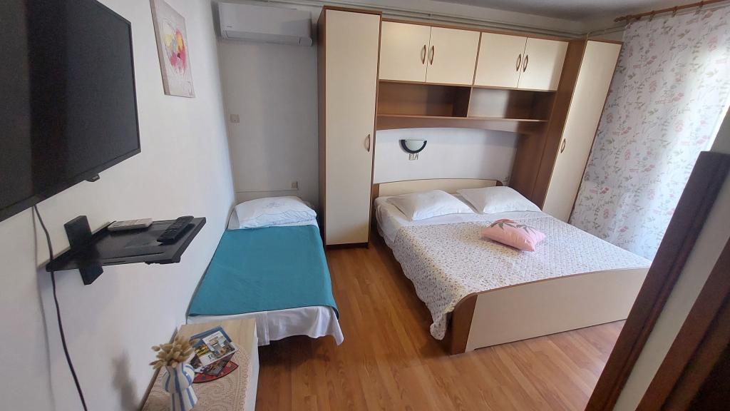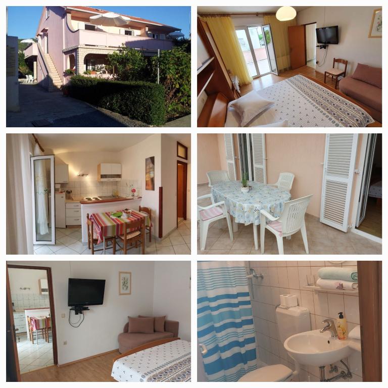 We rent fully equipped and air-conditioned apartments (for 2-5 people) + SAT/LCD TV, each with its own terrace or balcony + parking space in the yard and high-speed internet. We also offer air-conditioned rooms for 2-3 people, each with its own terrace, toilet/toilet, and the possibility of using a fully equipped kitchen, dining room (SAT/LCDTV) and pleasant outdoor terrace with garden furniture. We are located near a beautiful sandy-pebble beach (200-250m) and all other facilities necessary for a carefree and pleasant summer vacation (shops, restaurants, pizzerias, beach bars and coffee bars, recreational facilities, programs for children...). From the old town center of the island of Rab with its rich history, we are only 20 minutes away on foot along a beautiful promenade by the sea.