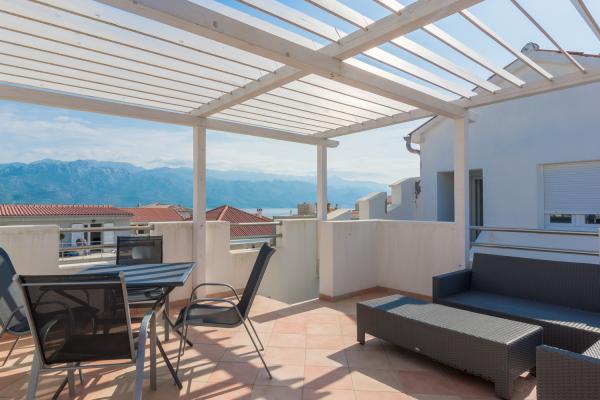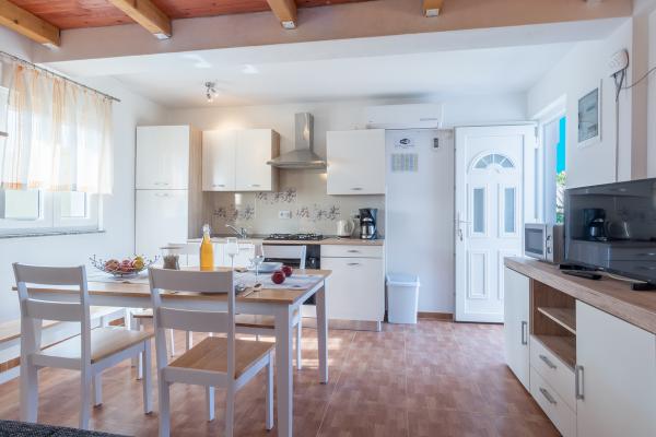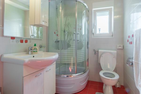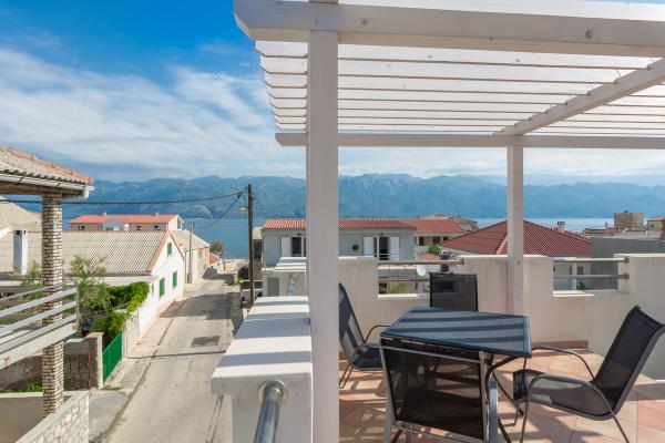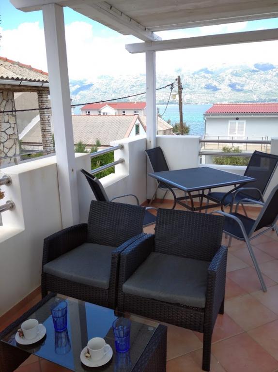 The room on the first floor leads to a small balcony with a view of the place, and in front of the family house is a large terrace that is shared with another apartment. The terrace is equipped with furniture and offers a wonderful view of the sea and Velebit. Provided: towels, bed linen, 2 air conditioners, parking, wifi, washing machine, toaster, microwave, kettle, cot and feeder on request.