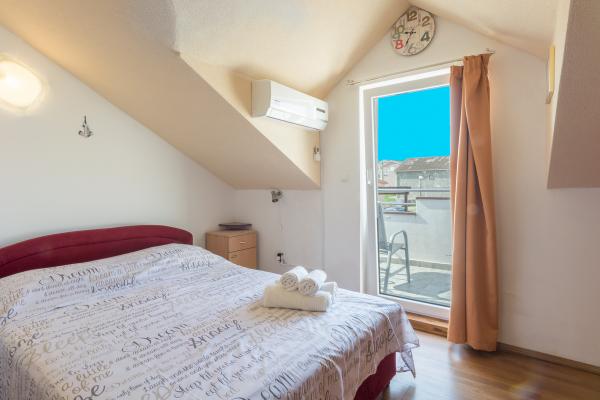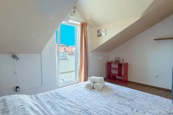 The apartment is located in the center of Ražanac, just a 2-minute walk to the beach. The apartment is 65 square meters in size and can accommodate 6 people. The apartment is located on the first floor of the family house and in the high attic. On the right floor there is a new kitchen and living room, a larger bathroom and the master bedroom. The kitchen and the living room form one space, in which there is also a table with chairs for 6 people, and they are air-conditioned. There is also an LED TV (82 cm) with satellite TV and a 180 x 200 sofa bed that provides comfortable sleeping for two people. The bathroom has a shower cabin, toilet, sink and washing machine. On the same floor is the main room, which is equipped with a double bed 180 x 200 with nightstands and night lamps. The room has a larger wardrobe. The room is high, and a special experience is provided by the skylight with a shade and the possibility of complete blackout. On the upper floor is the second bedroom with air conditioning and toilet.