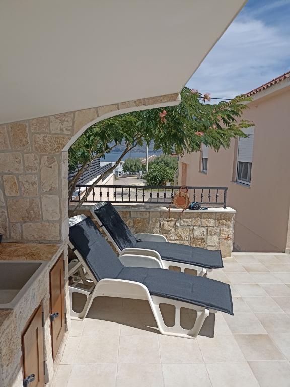 Holiday house with two spacious rooms, living room, dining room, bathroom and toilet. The exterior part consists of parking for two vehicles, a spacious terrace with an outdoor shower and a fireplace. The house has all the necessary appliances and facilities for a pleasant stay. The distance to the beach is 3 minutes' walk, to the center of town 4 minutes.