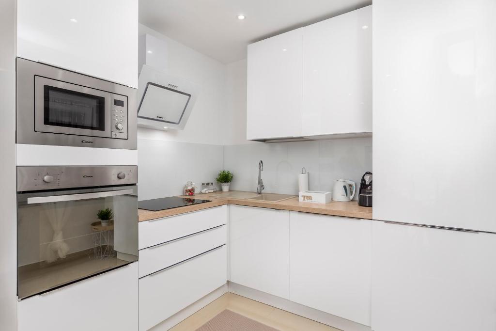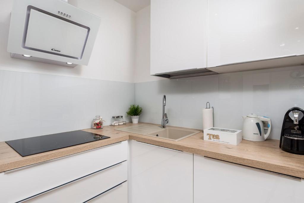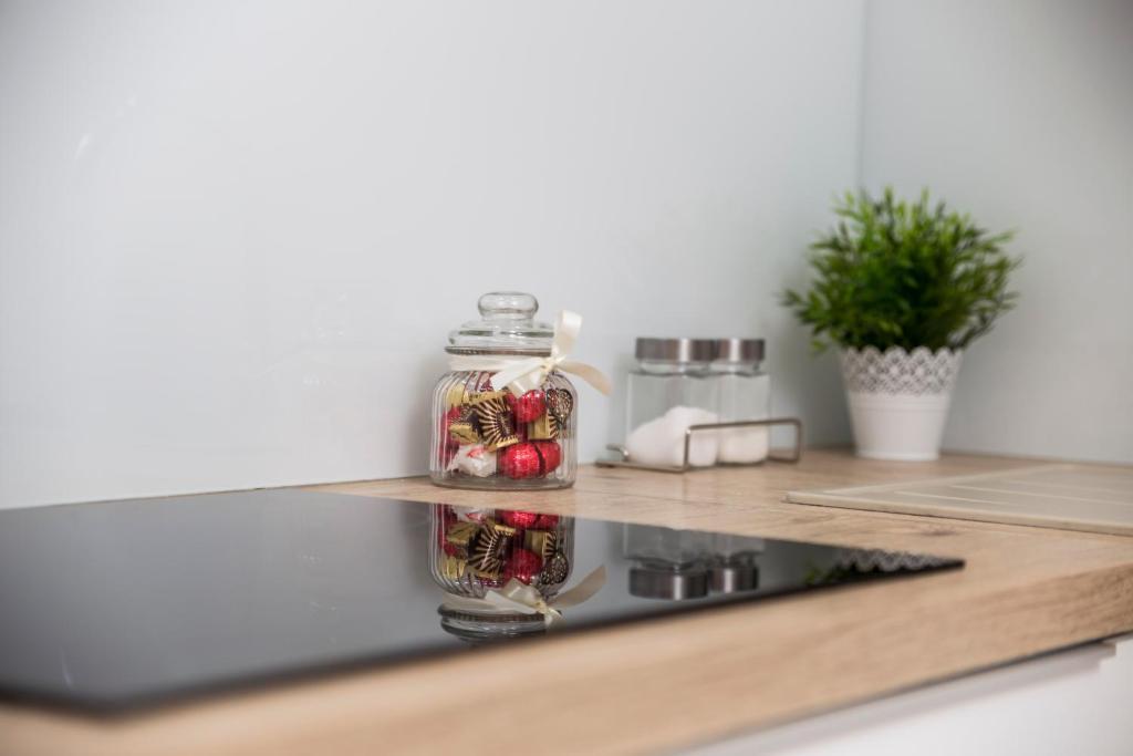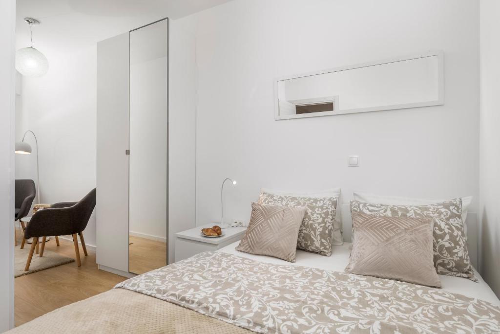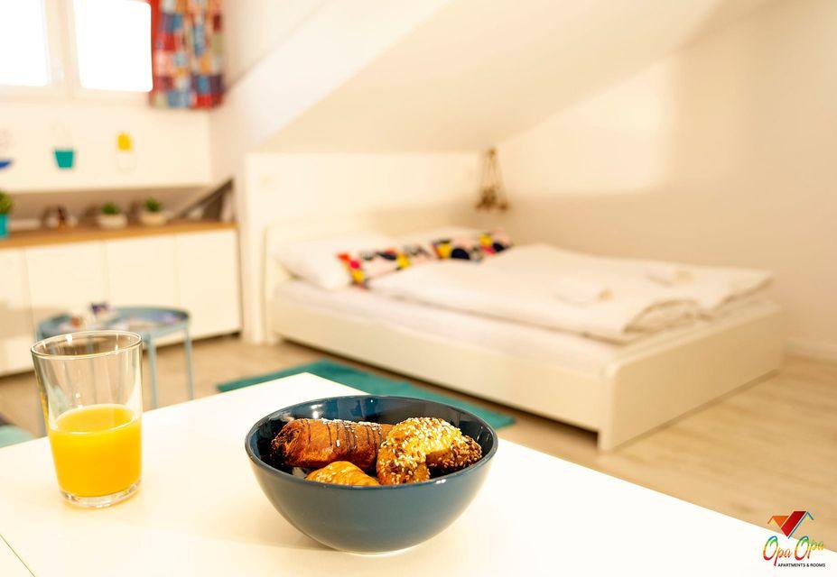 In addition to all modern appliances, the apartment rental price includes a TV and free broadband internet. Next to the building itself and in the immediate vicinity, there are also street parking lots and a large closed city parking lot.