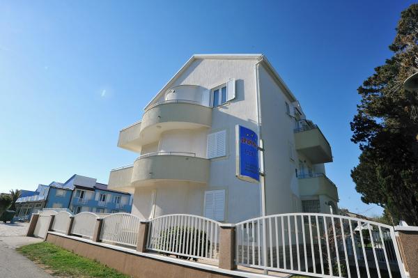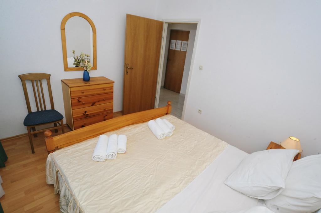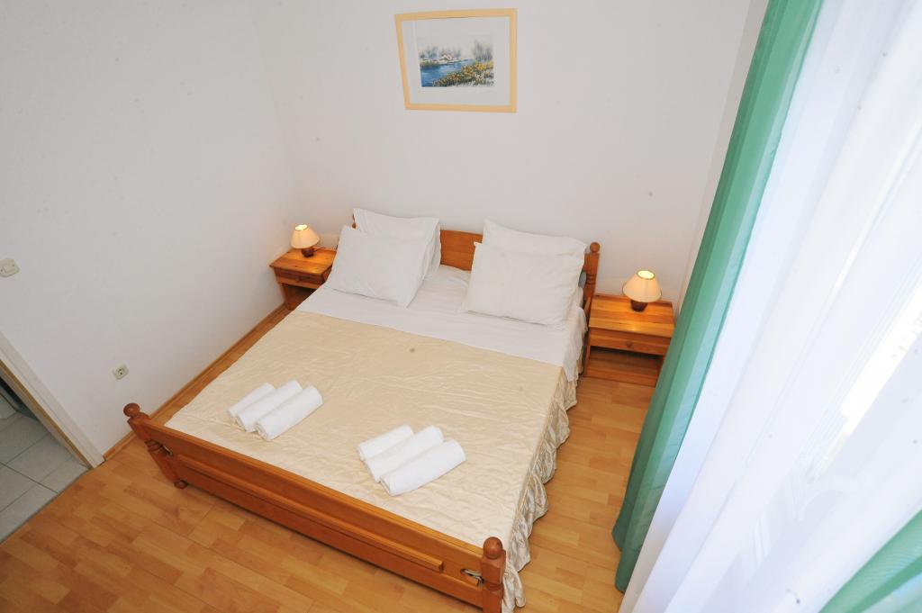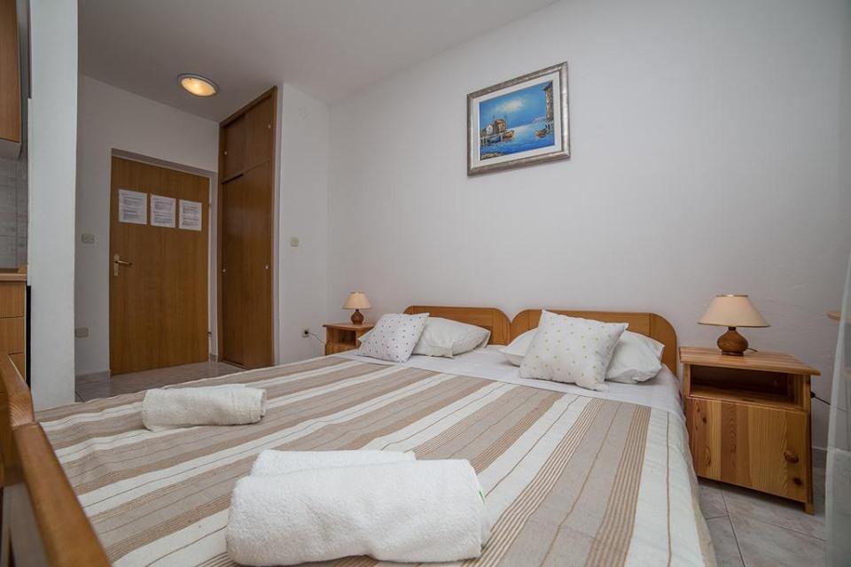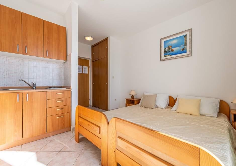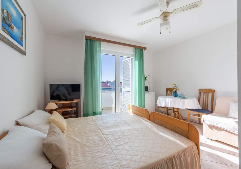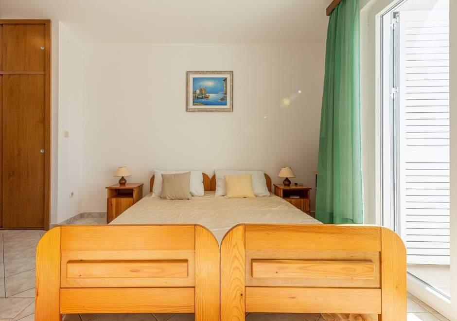 Modernly equipped house with 9 accommodation units: 6 apartments with one bedroom and a living room with two extra pull-out beds, a two-seater and a three-seater, as well as an equipped kitchen, a bathroom with a shower, and a large balcony with a table and chairs. There is a large wardrobe in the hallway. 3 studios are designed for two people, they are also fully equipped: bathroom with shower, large wardrobe, kitchen, and a smaller balcony with a table and chairs. All apartments have air conditioning. The house is located 3 minutes' walk from the sea, or 5 minutes' walk to the large sandy beach (Kraljičina plaža).